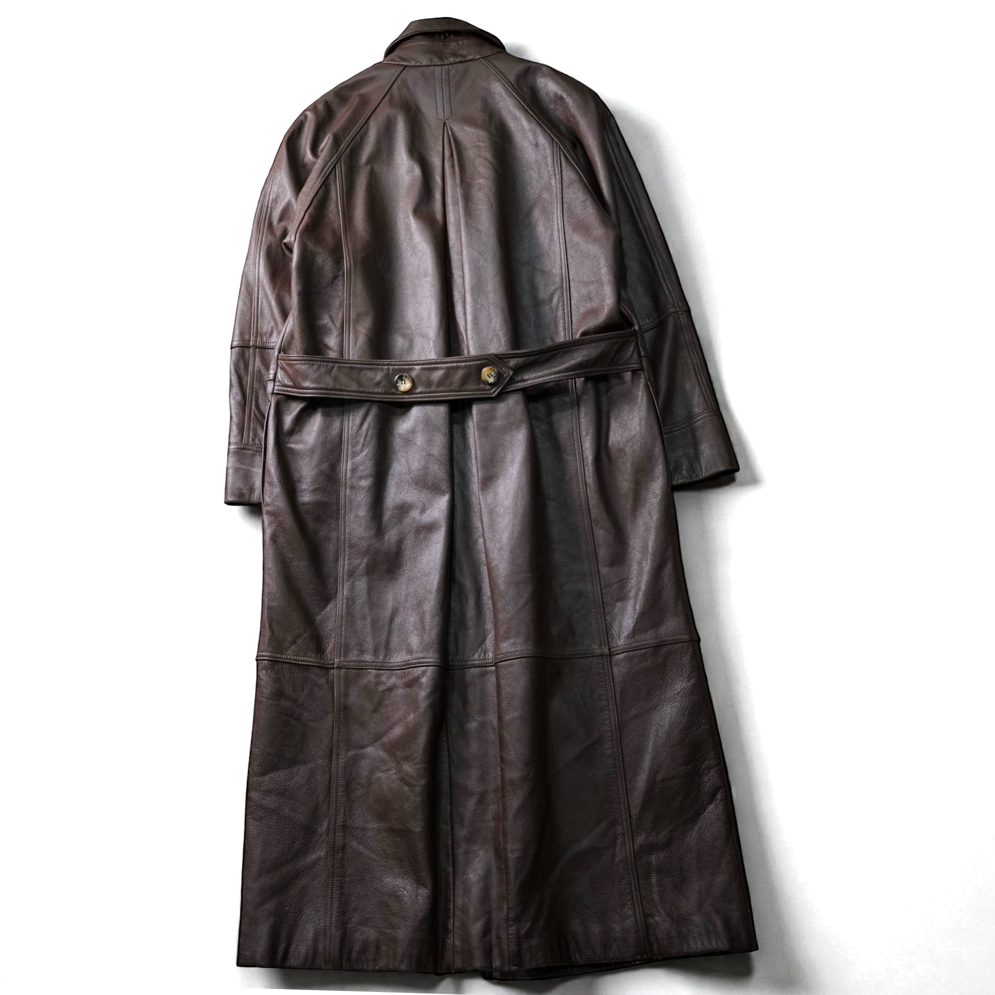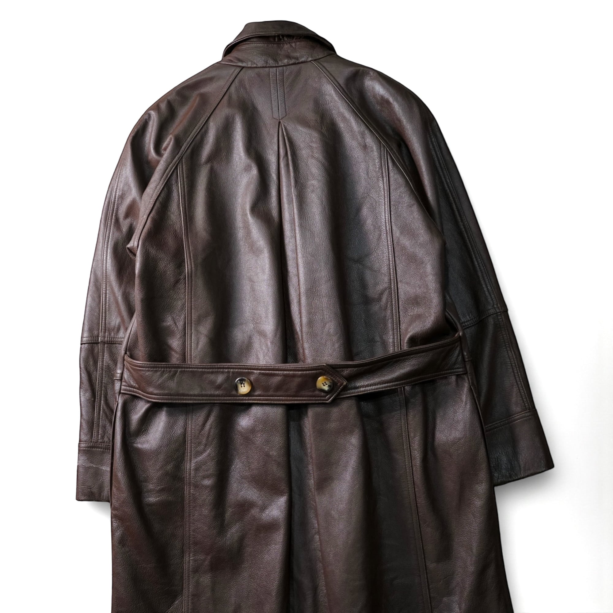 大きめのフラップポケット、重厚なダブルボタン、背面のバックベルトなど、クラシックなトレンチ要素をレザーで再構築したデザインが魅力。
