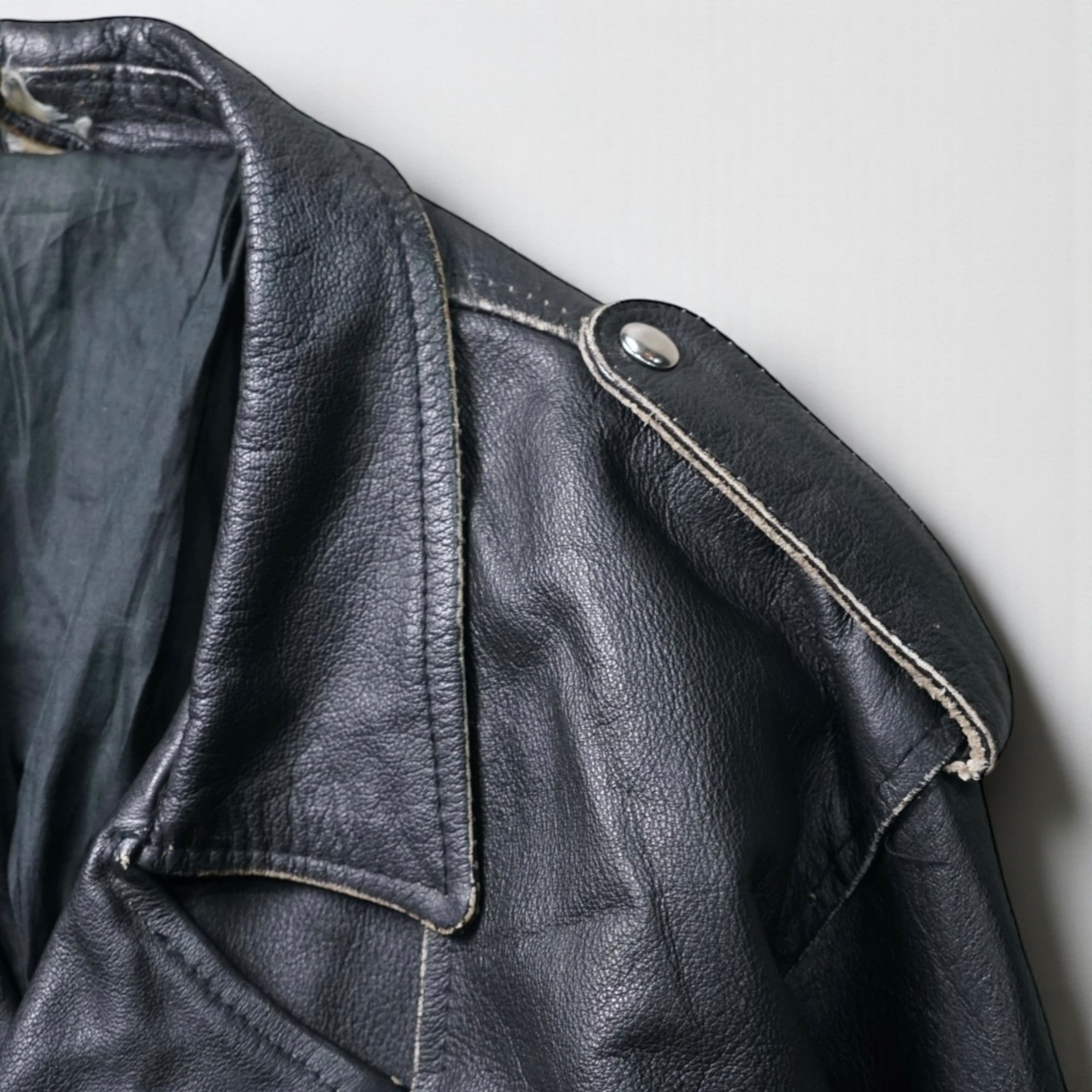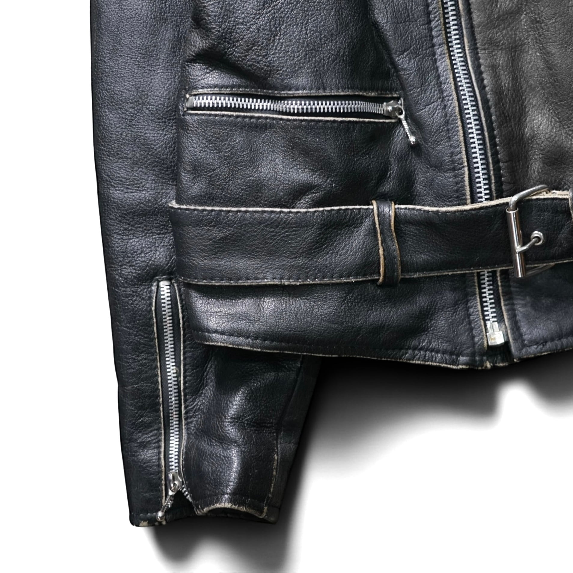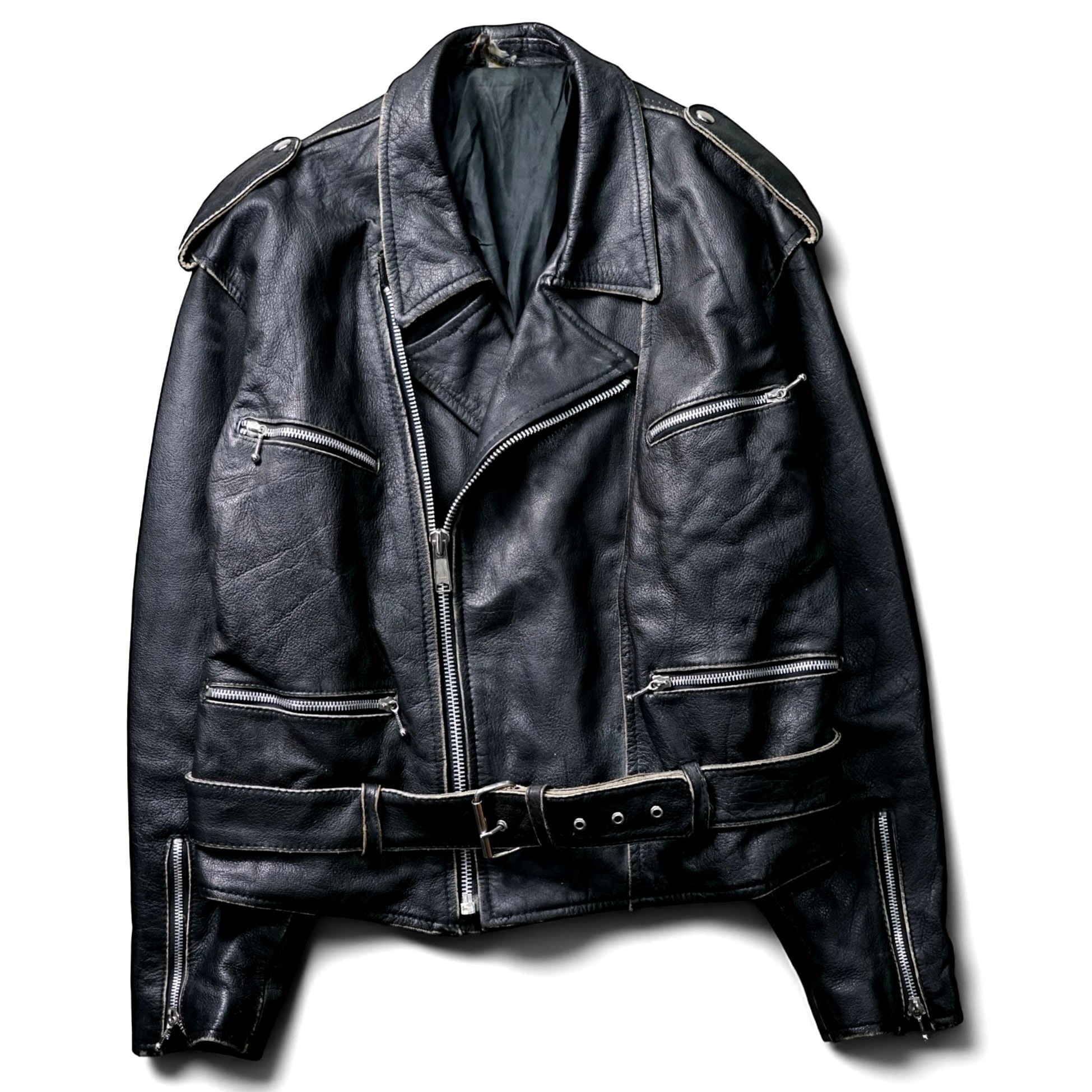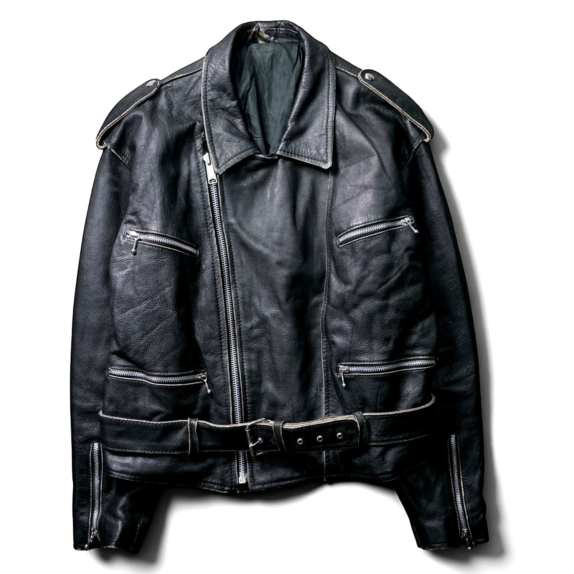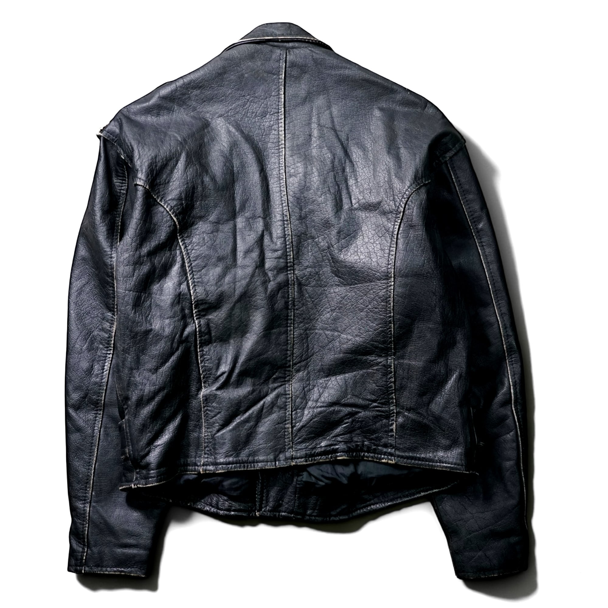 レザージャケットとしての完成度はもちろん、経年変化そのものがデザインとなった一点物の雰囲気が魅力の一着。