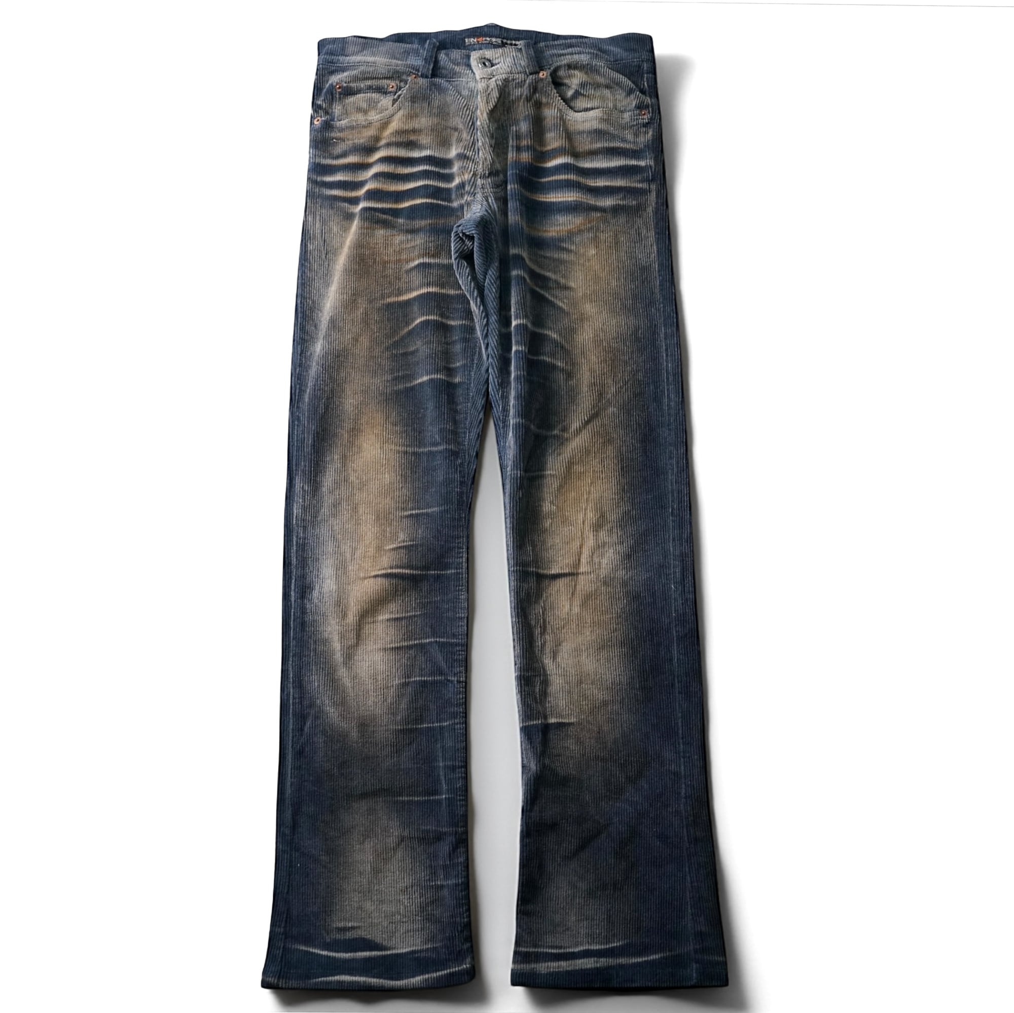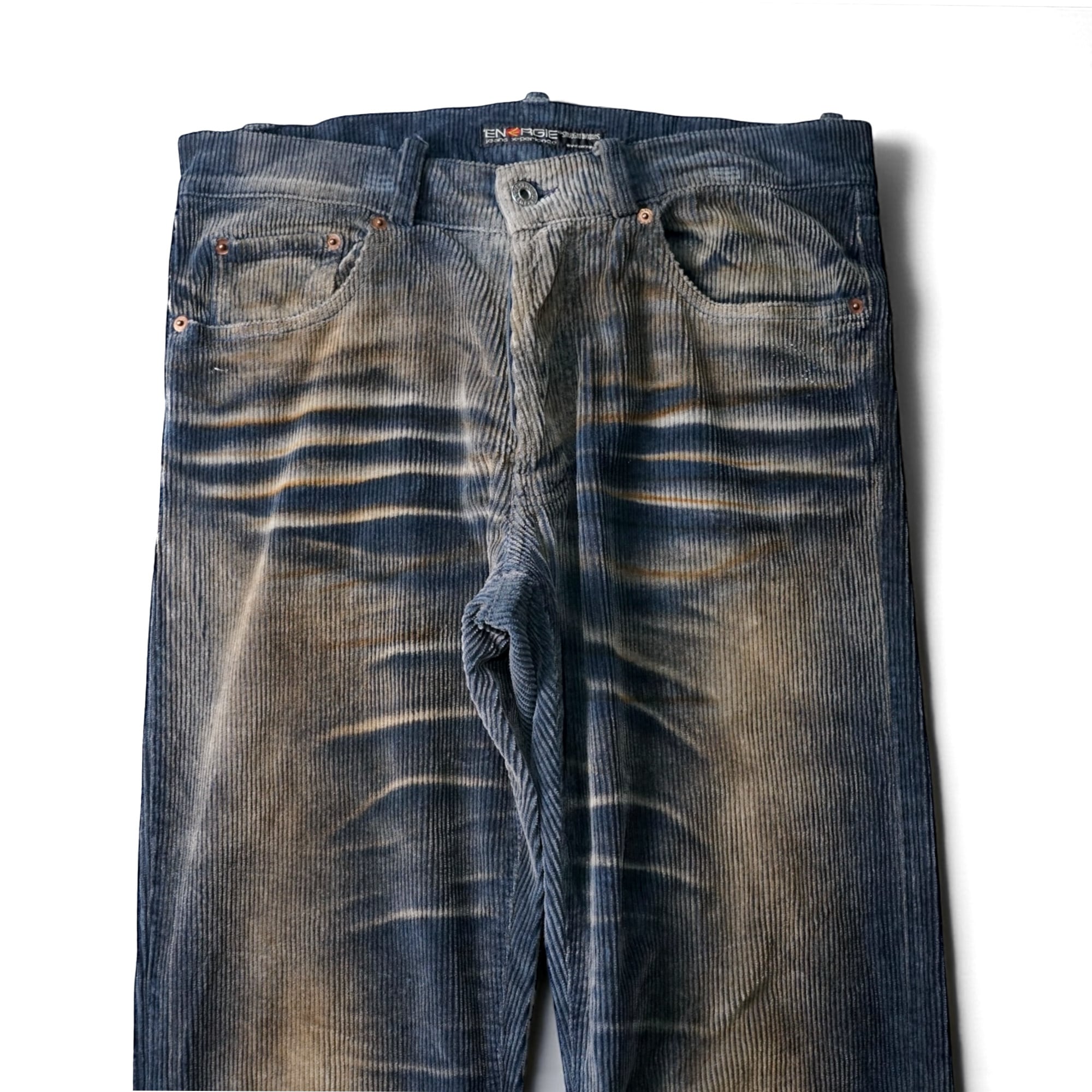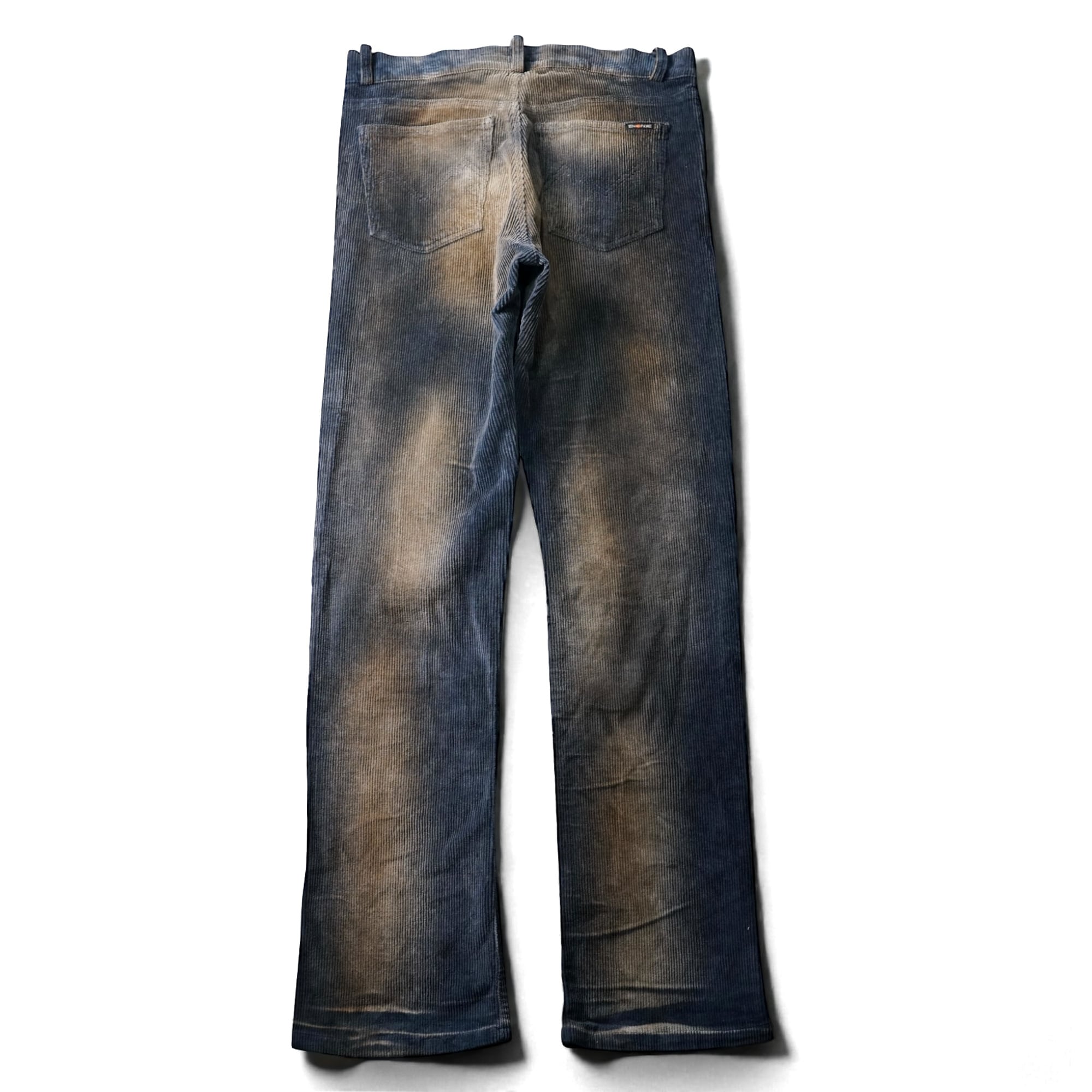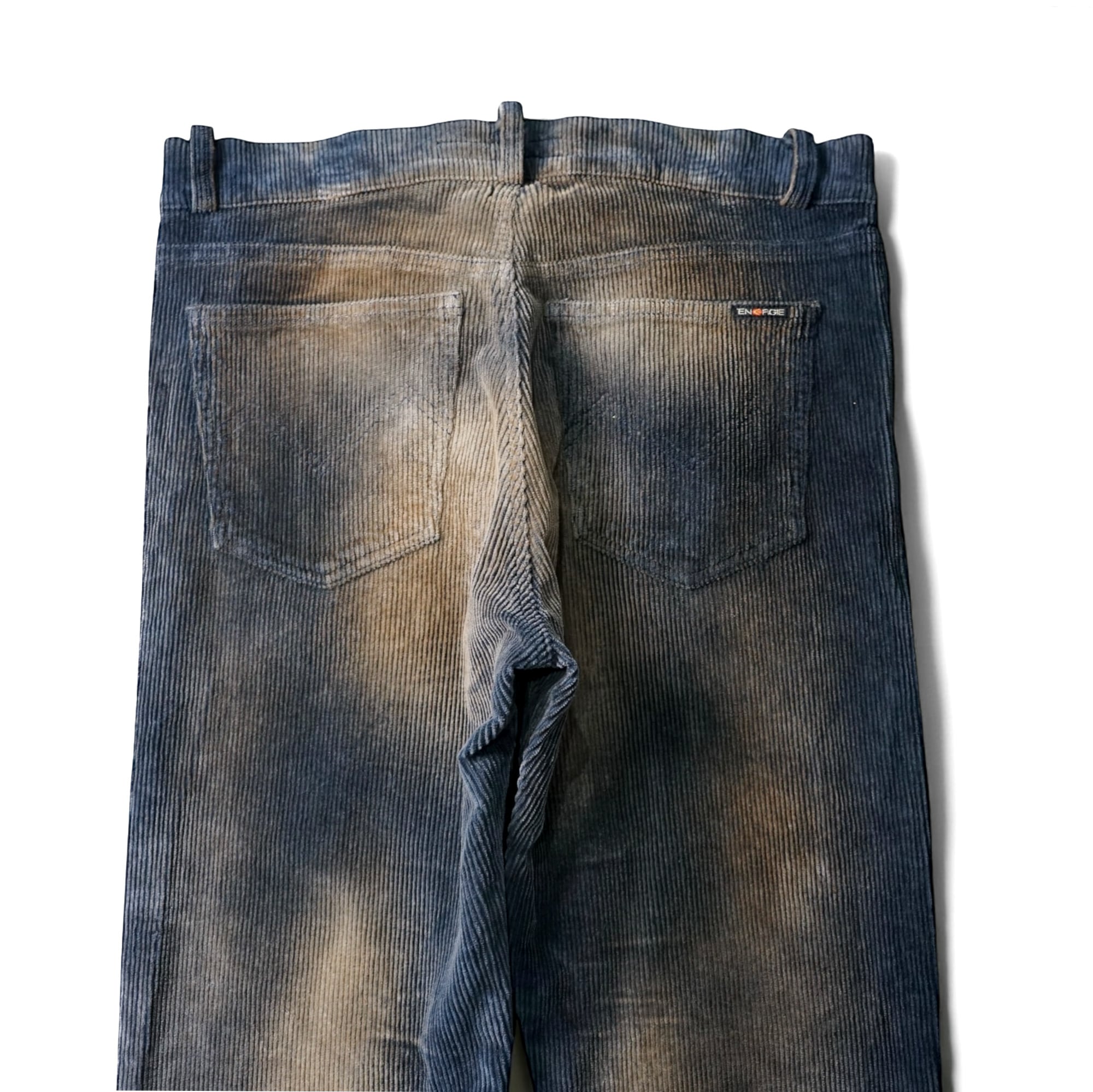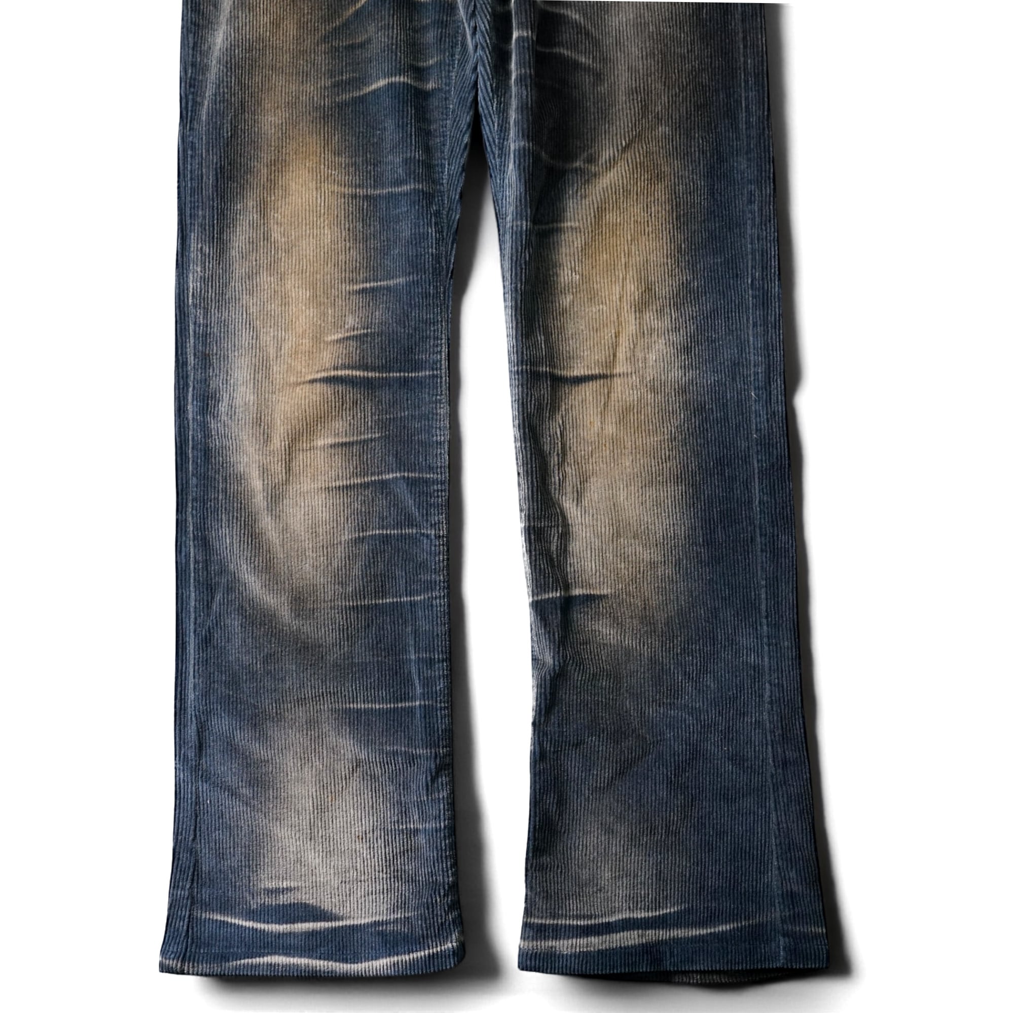 コーデュロイ特有の立体的な畝に色落ちが入り込むことで陰影が際立ち、1本でスタイリングの主役になる存在感。