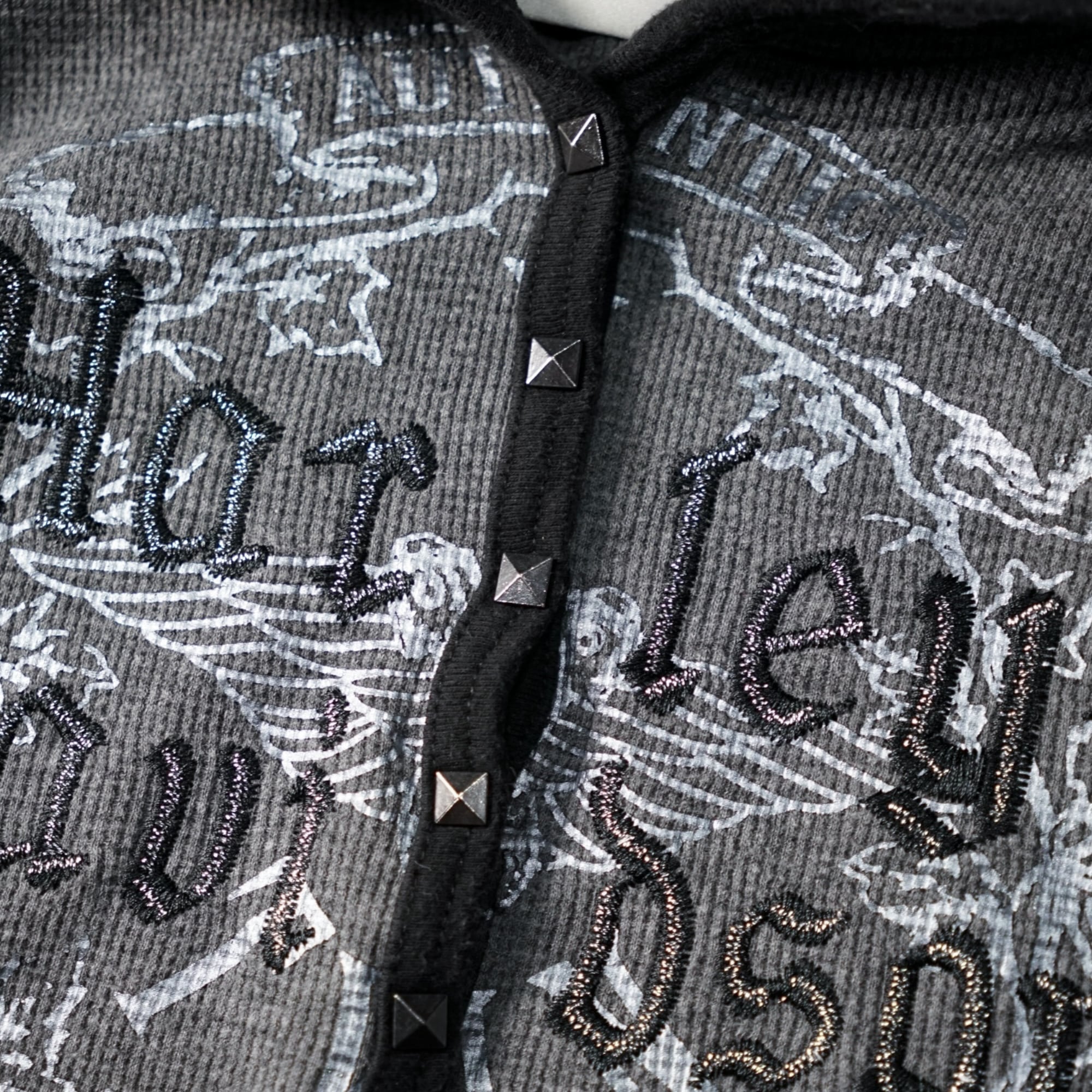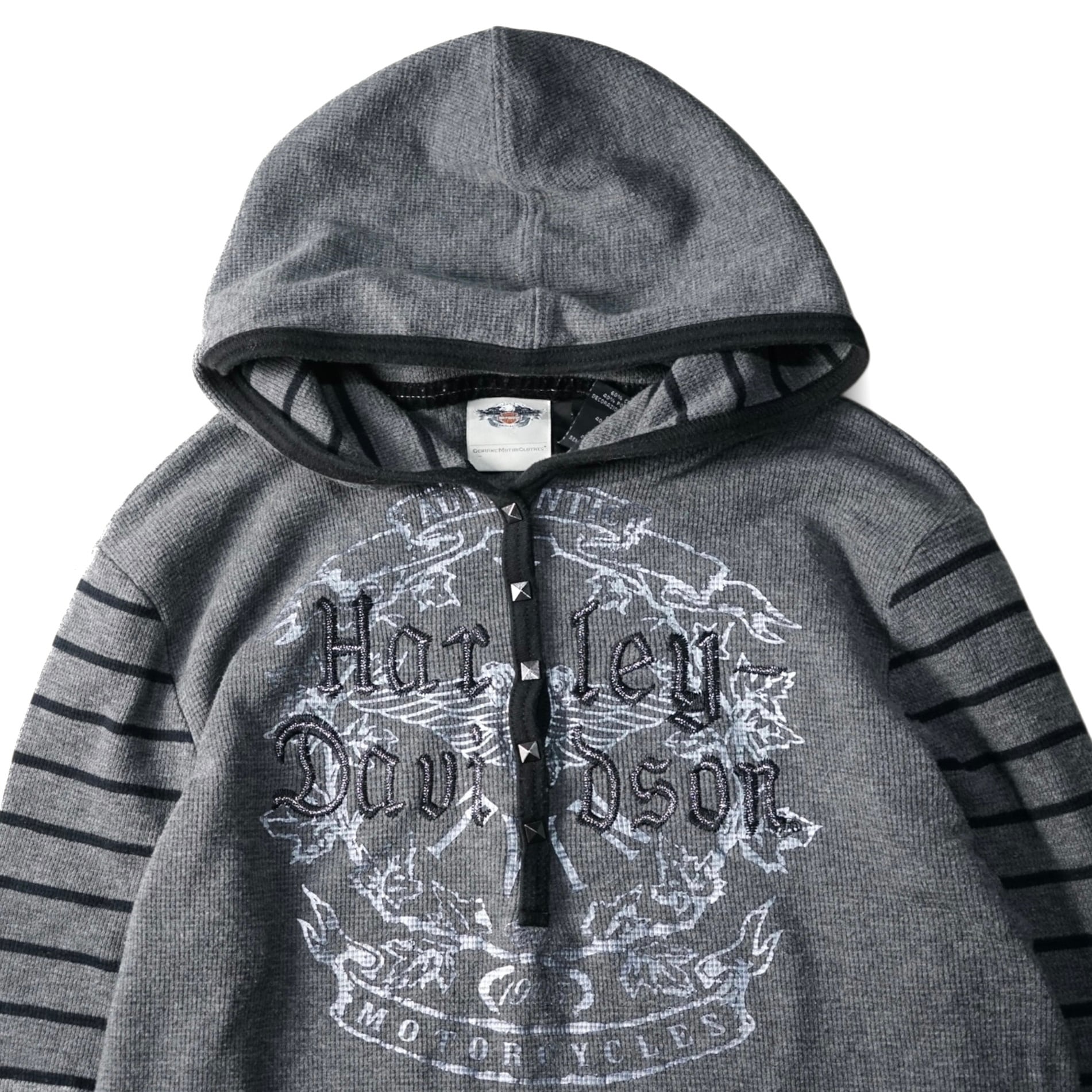Harley-Davidsonのアイコニックなグラフィックをベースに、異素材と装飾で再構築されたヴィンテージ・サーマルフーディ。