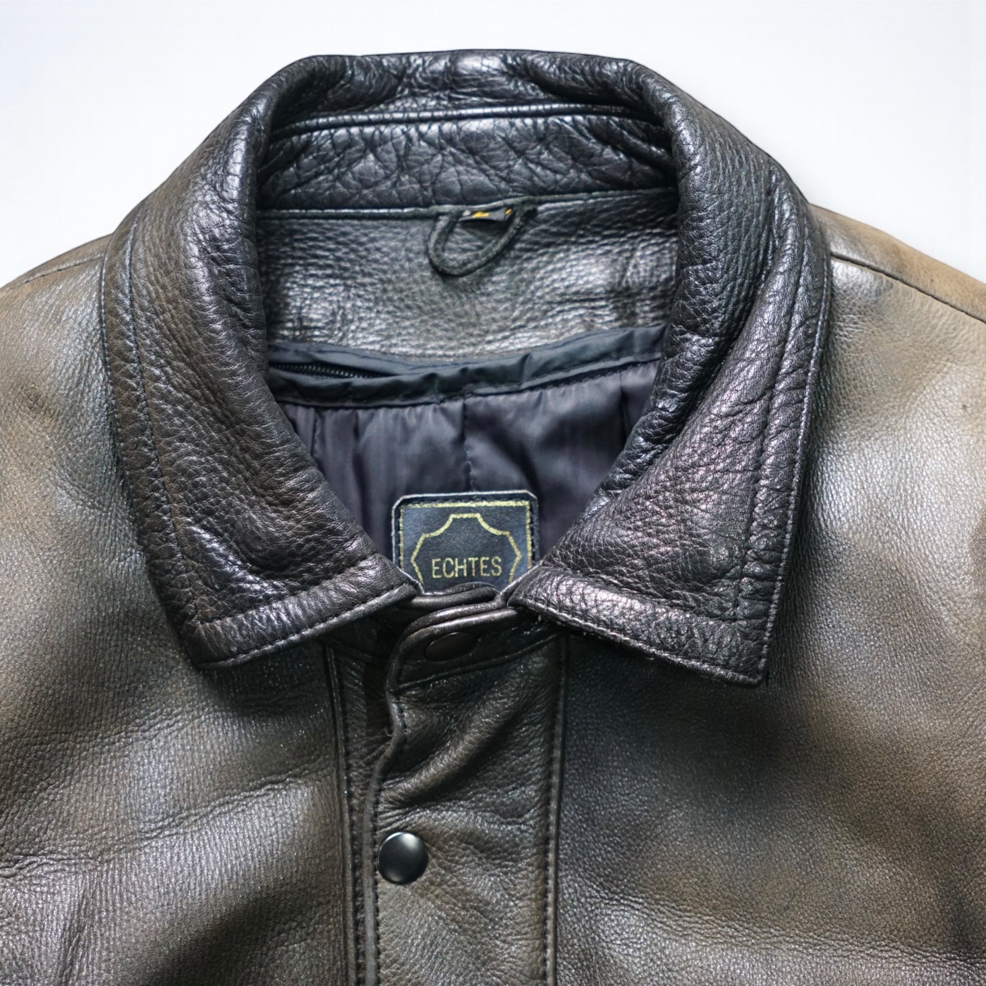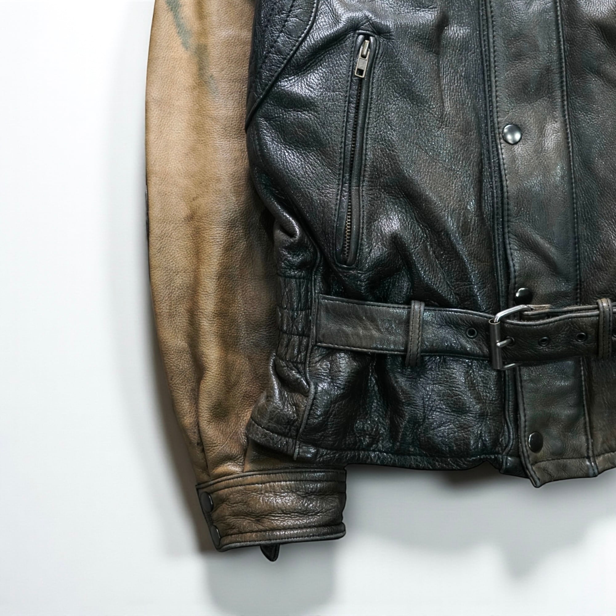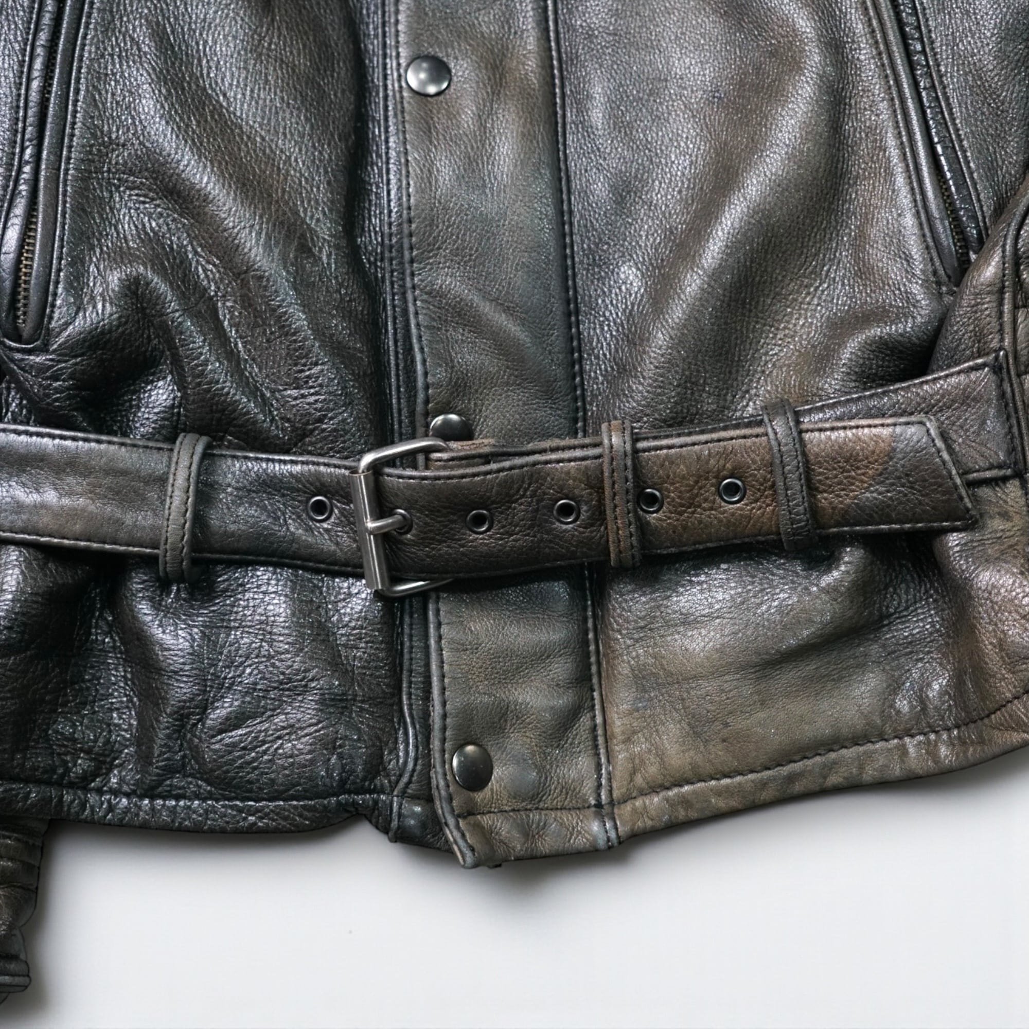 ヨーロッパ古着らしい“段階的なフェード”が美しい、ヴィンテージレザーのベルテッドジャケット。