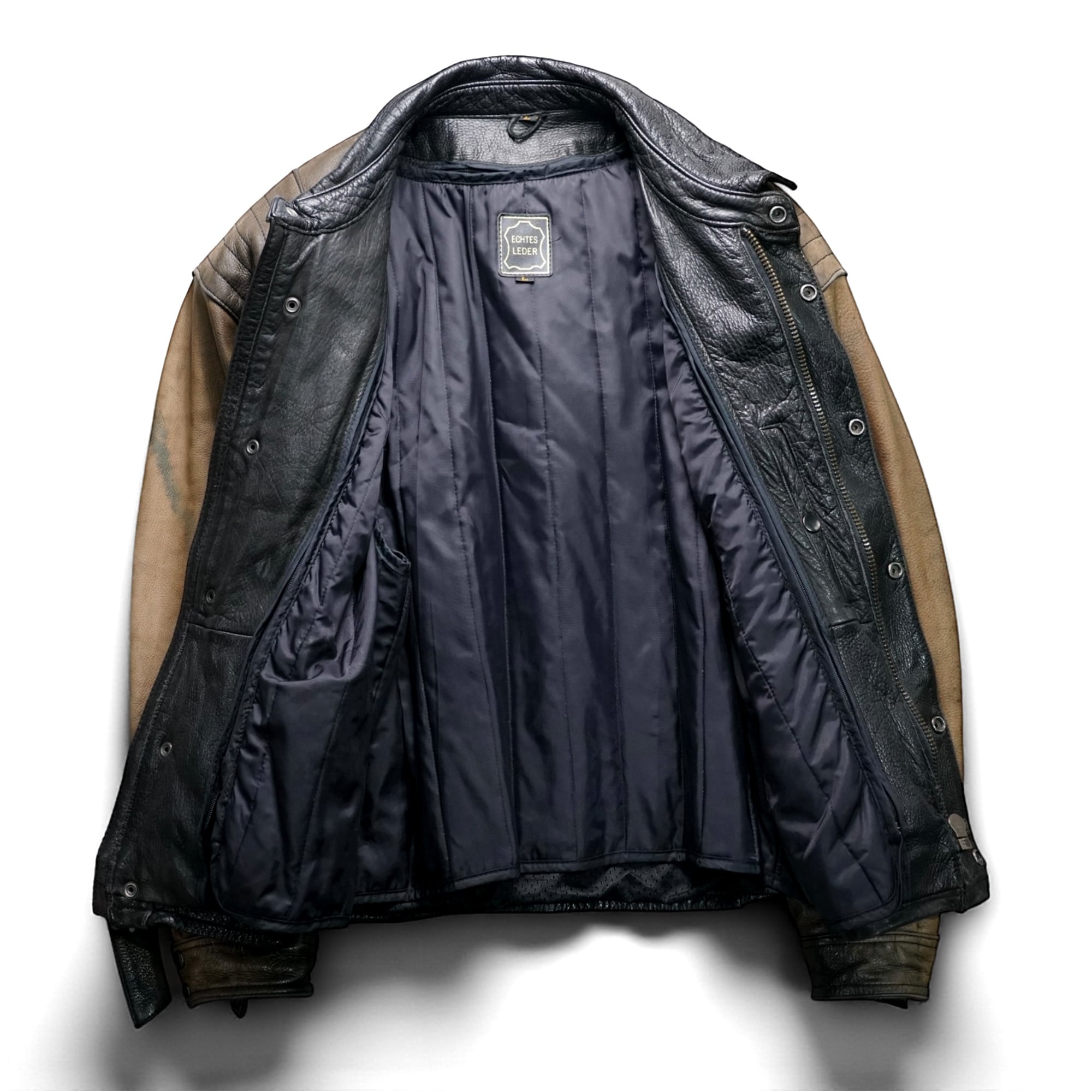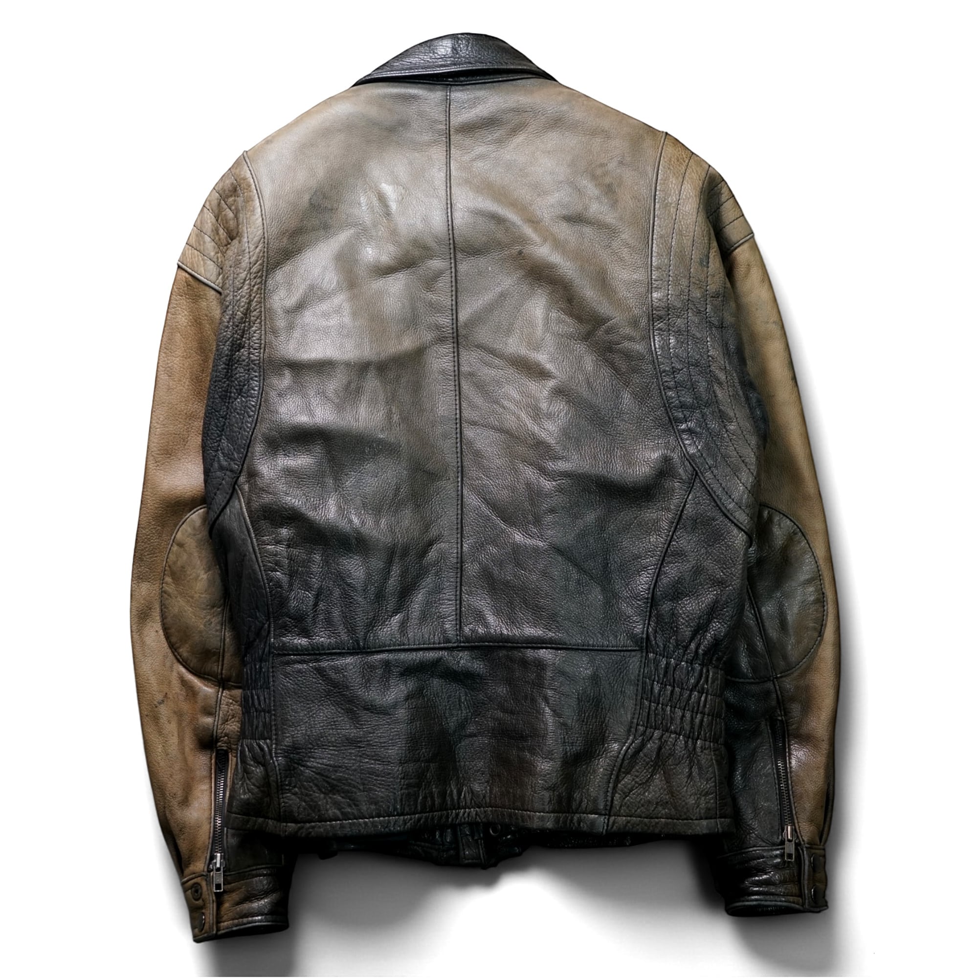 肩から袖にかけてのグラデーション状の色落ちや、身頃の深い墨黒のレザーが重なり合い、一点物ならではのドラマ性ある表情へと育った一着。