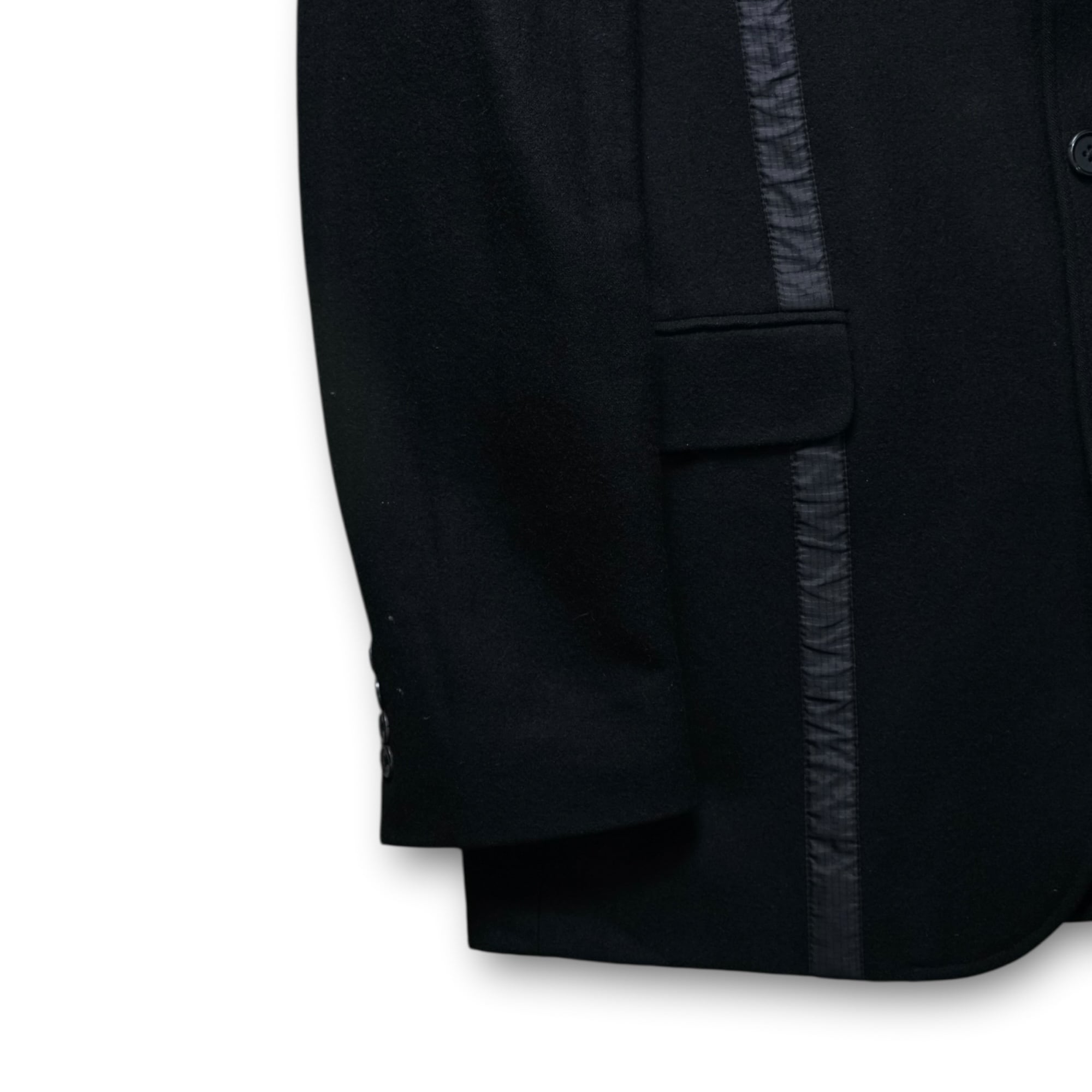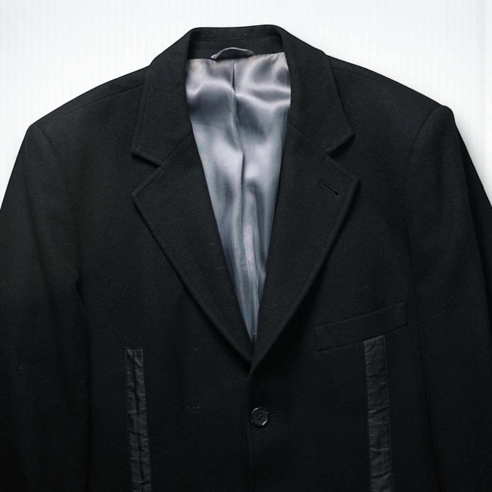 クラシカルな3ボタンのウールジャケットをベースにしながら、フロントに走るシワ加工テープの直線デザインがSean Johnらしい“ラグジュアリー×ストリート”の融合を体現。