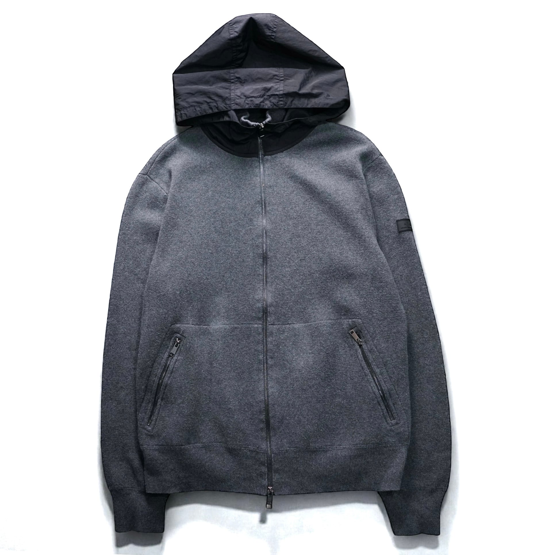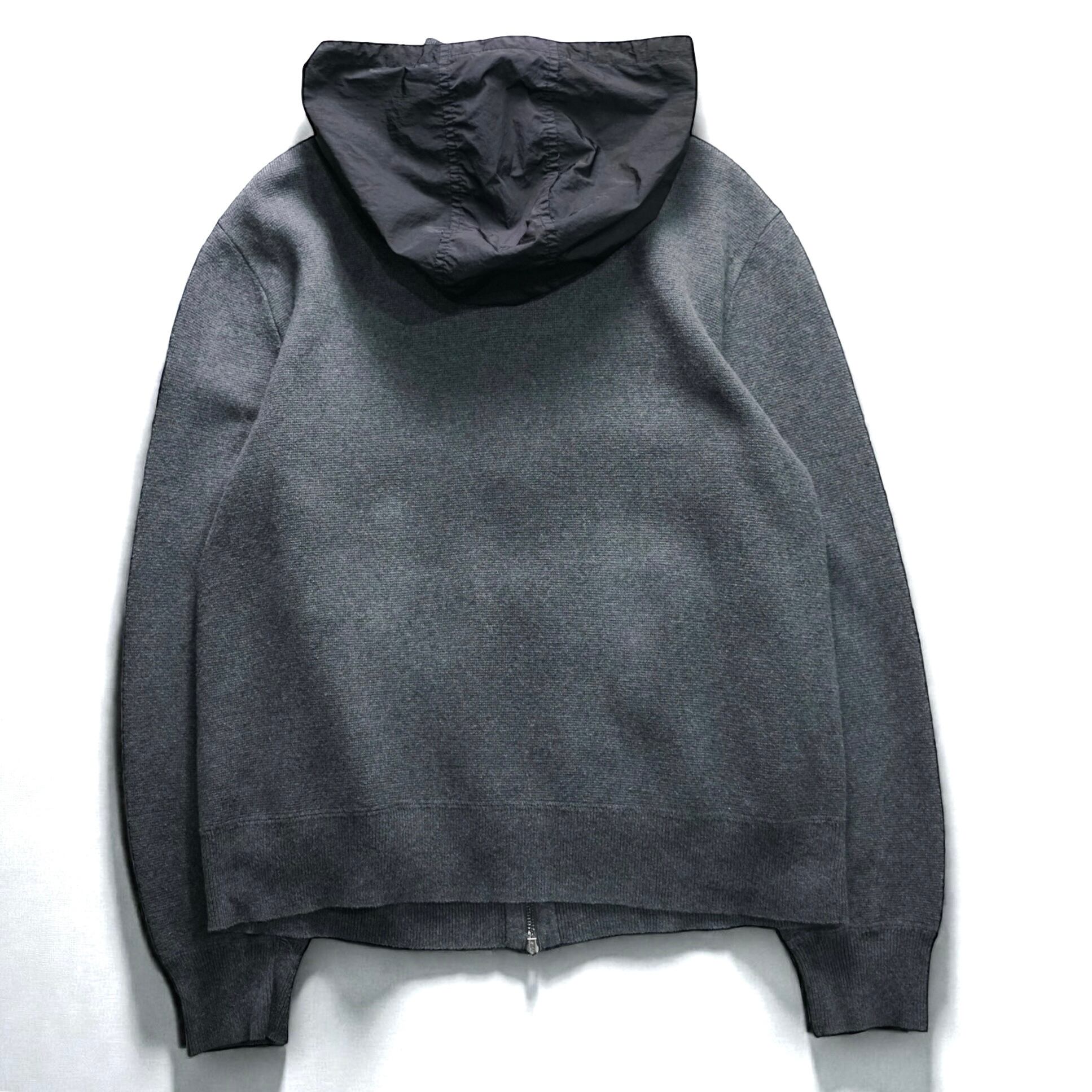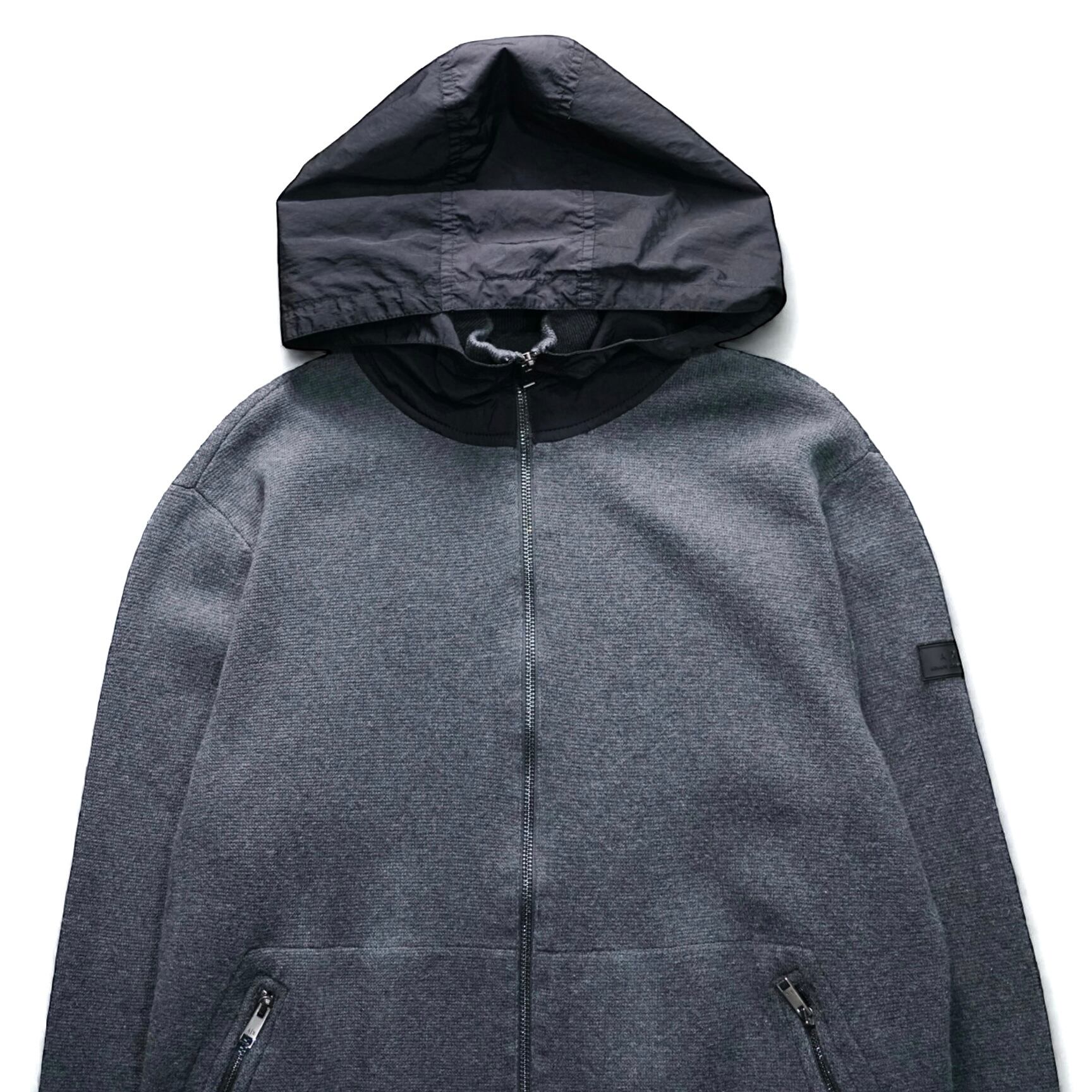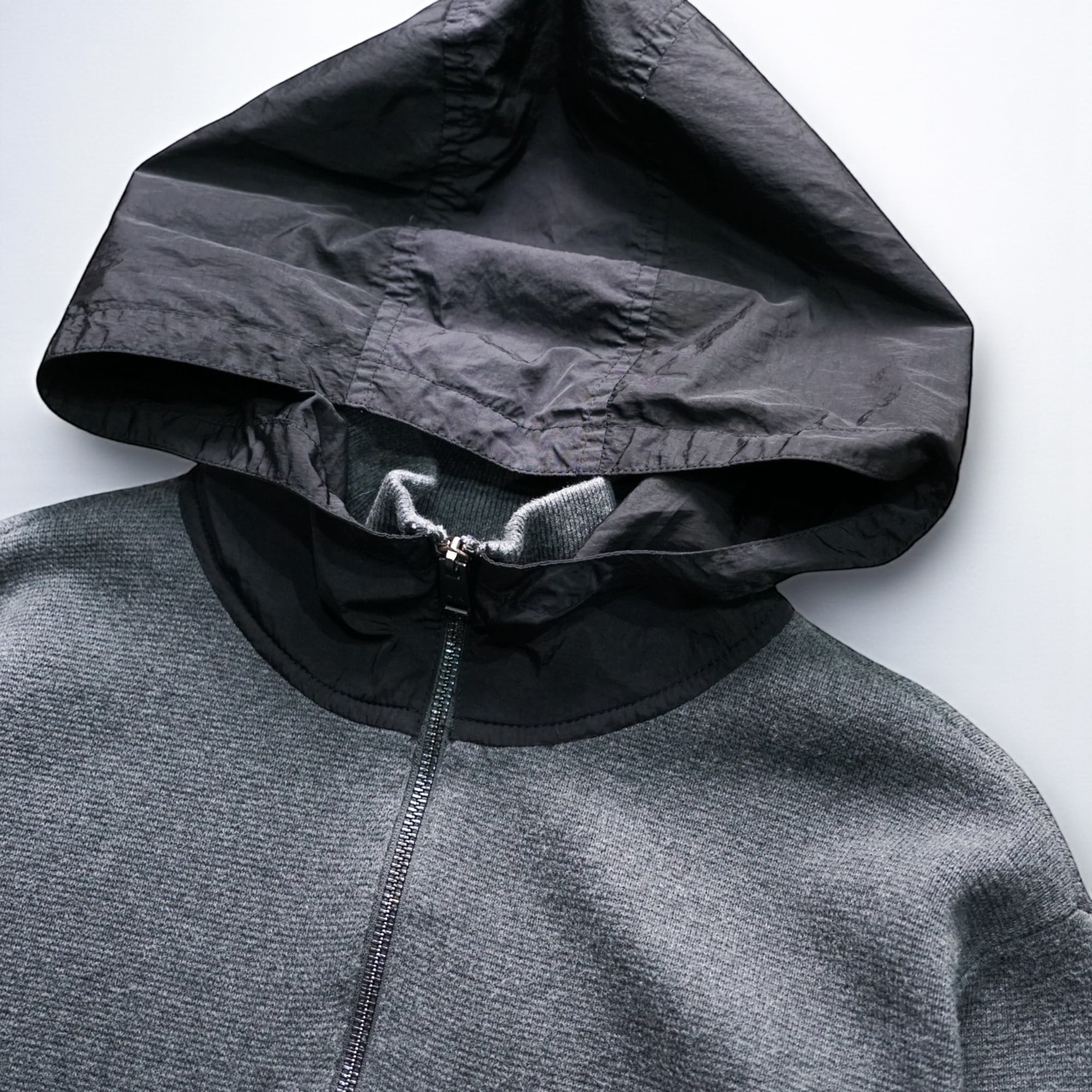 そこにナイロン素材のフードをドッキングさせた、異素材ミックスの都会的なデザインが特徴です。