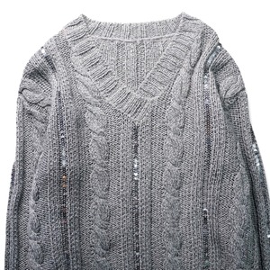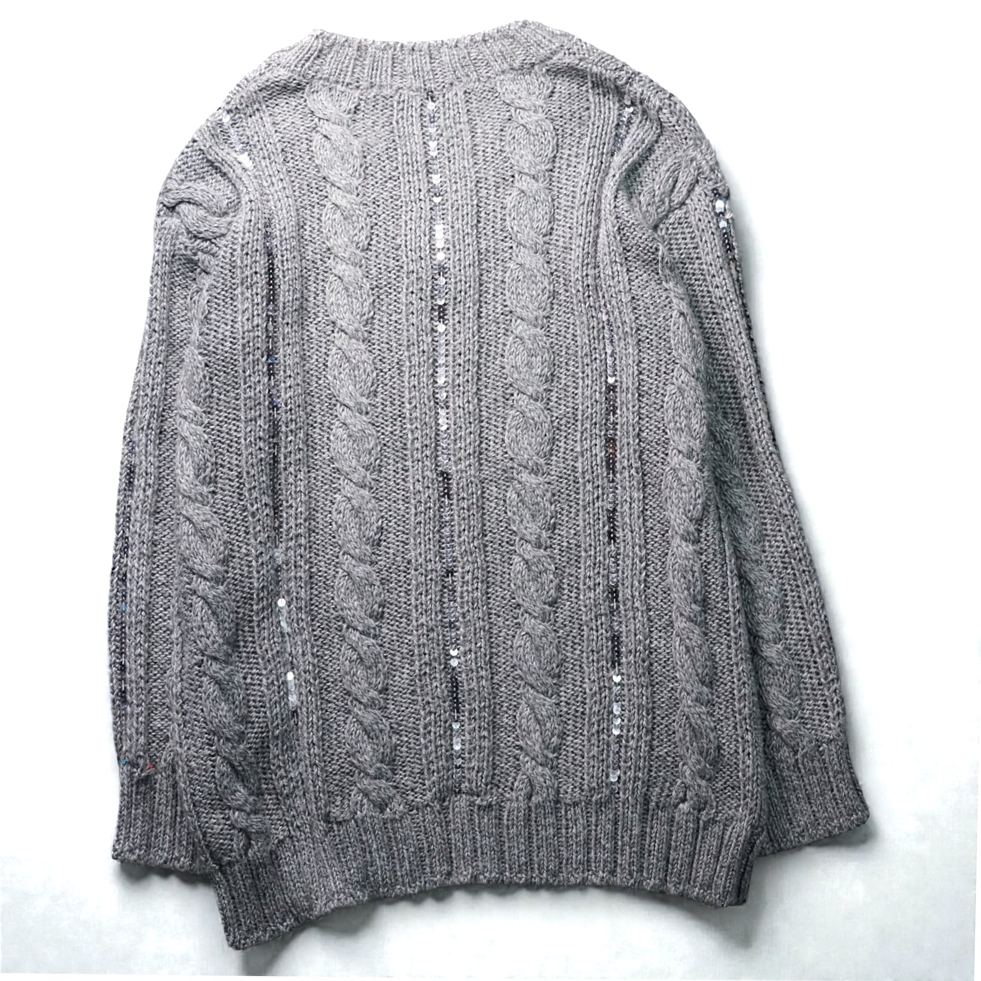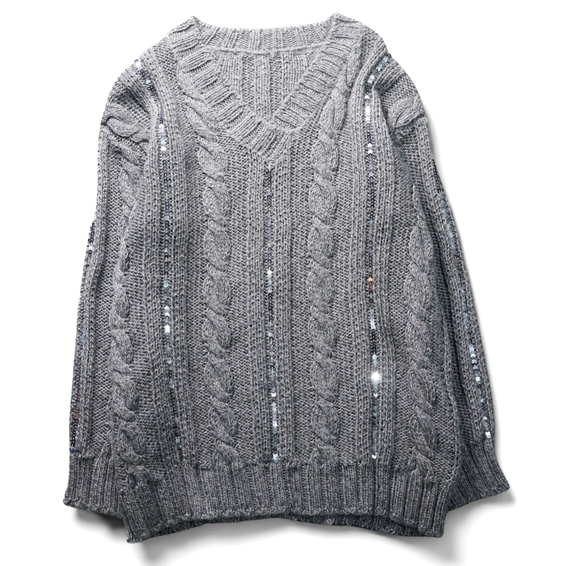 柔らかくざっくりと編まれたケーブルニットに、細かなスパンコールを編み込みのラインに沿って散りばめた、表情豊かなVネックセーター。