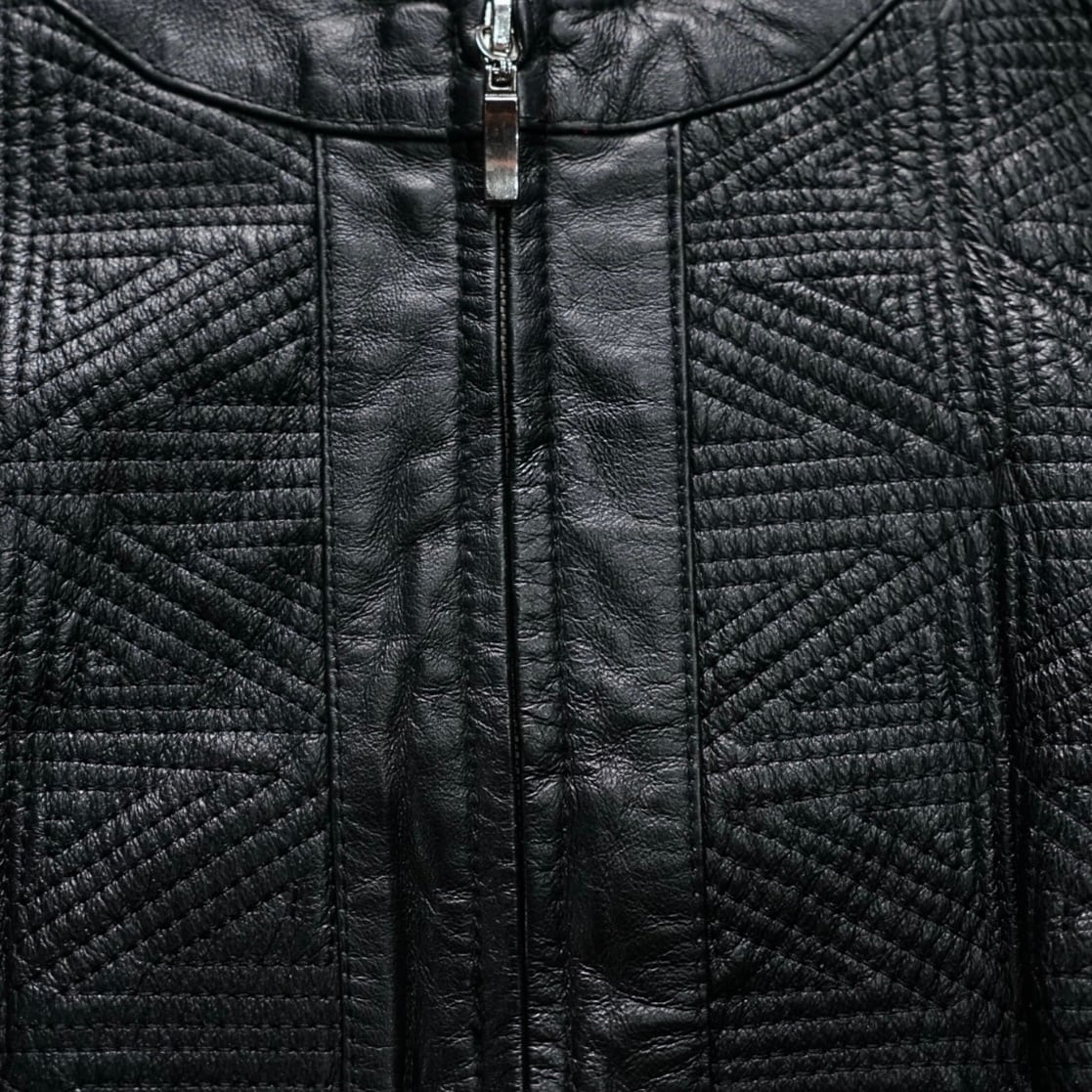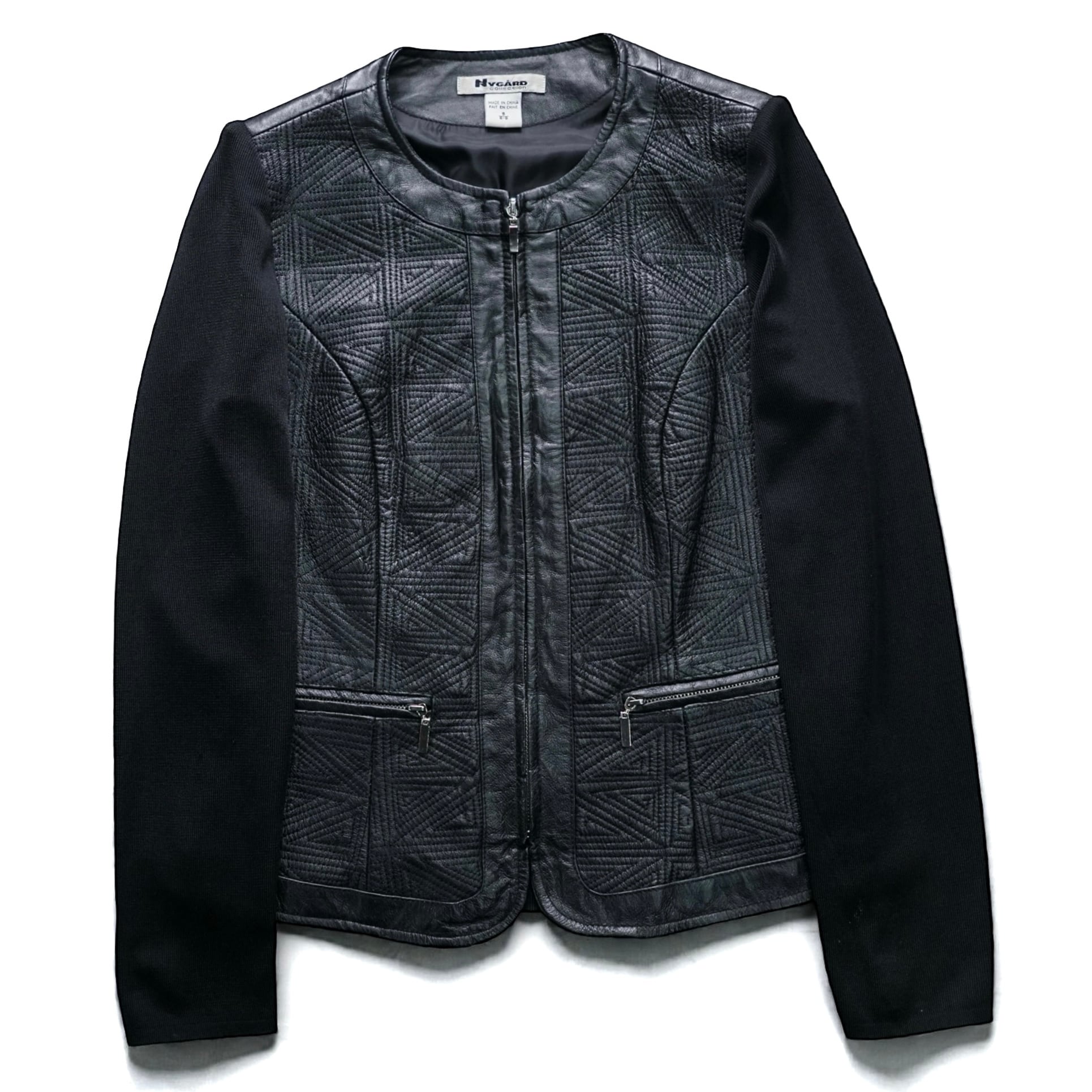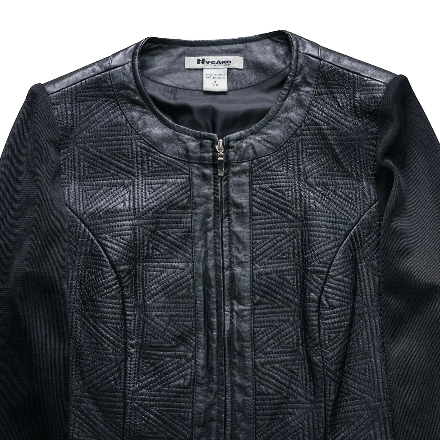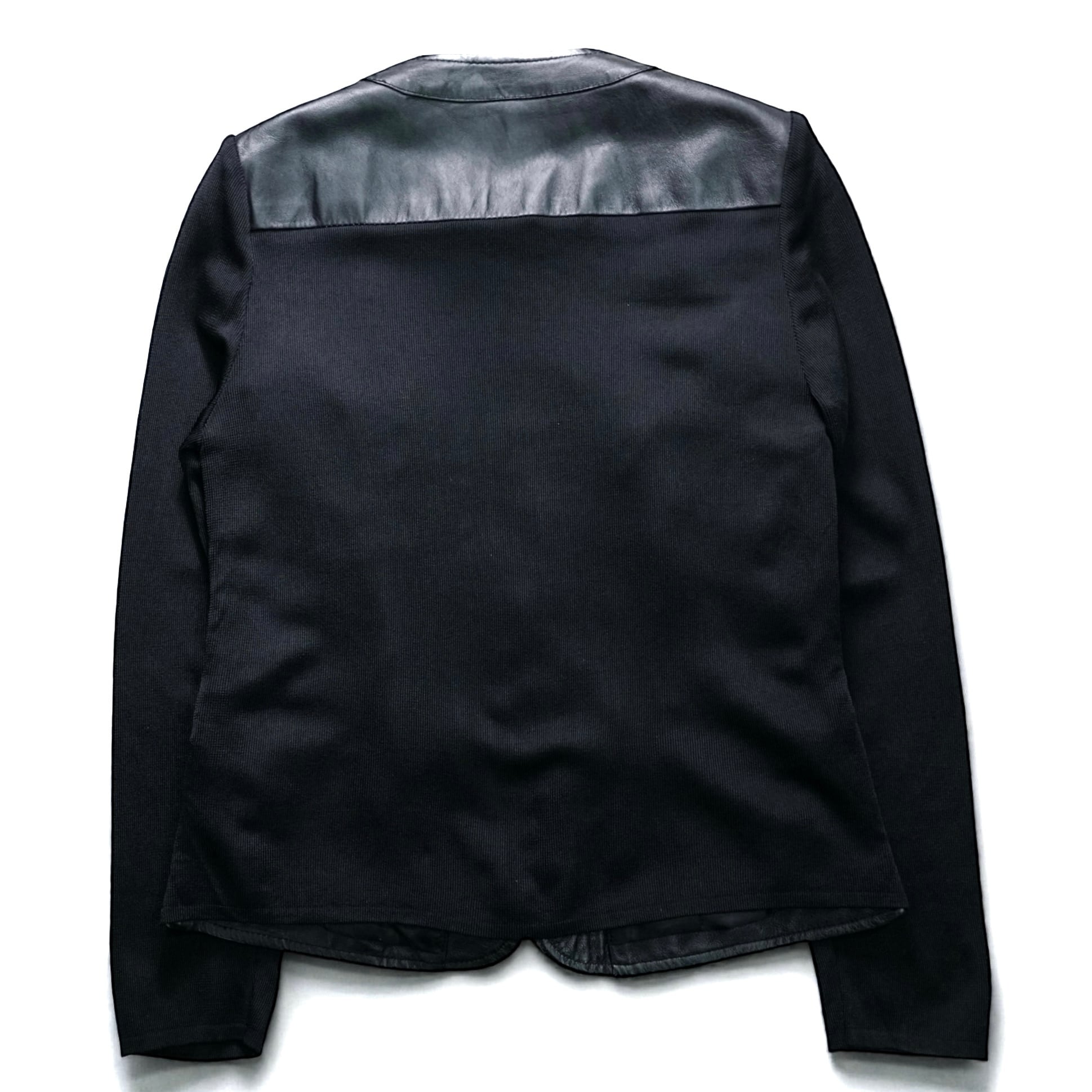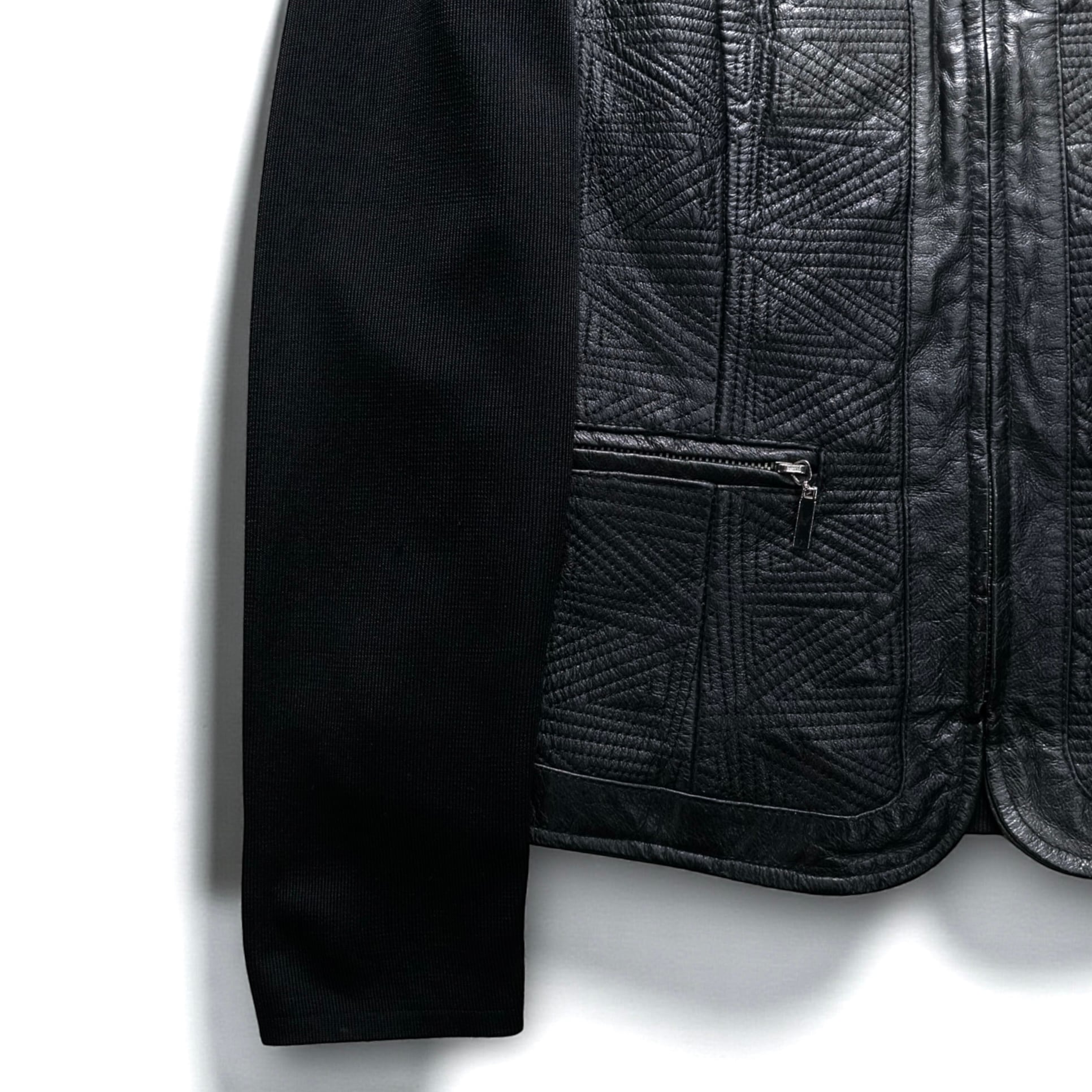 フロント全面に施された幾何学型押しレザーと、袖〜背面にかけて配されたしなやかなニット生地のコントラストが美しい、ハイブリッドデザインのノーカラージャケット。