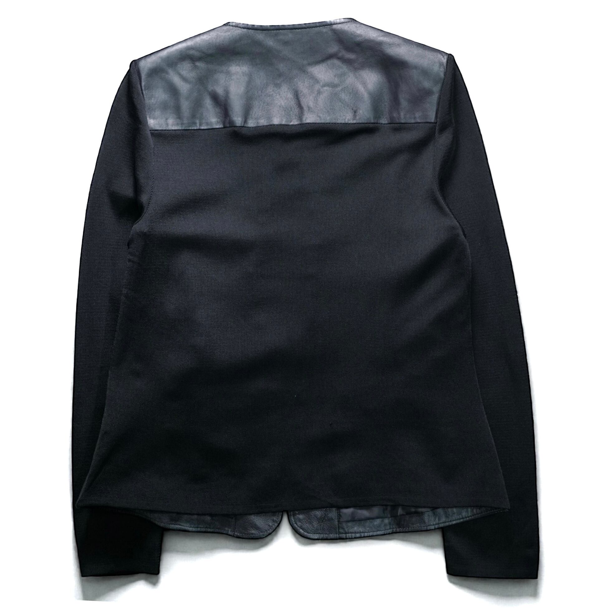 フロントにレザー、スリーブとバックにニットを切り替えた、異素材ミックスが印象的なスタッズジャケット。
