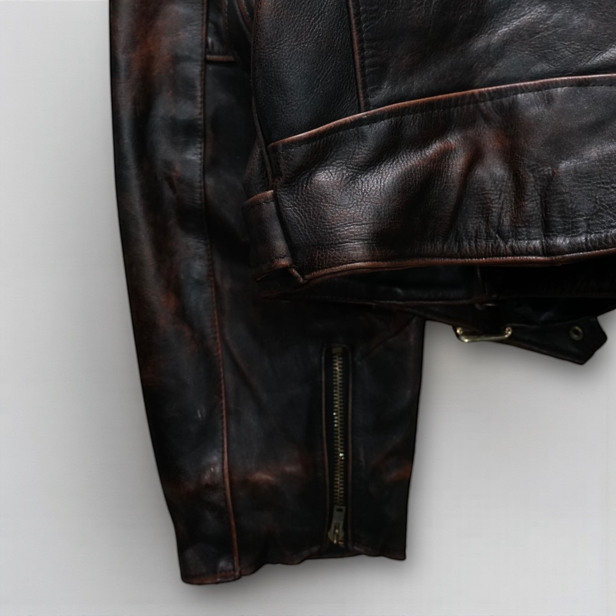 深いブラックに赤茶が滲むように現れるブラウンのフェードは、長年の経年変化によって自然に生まれたもの。