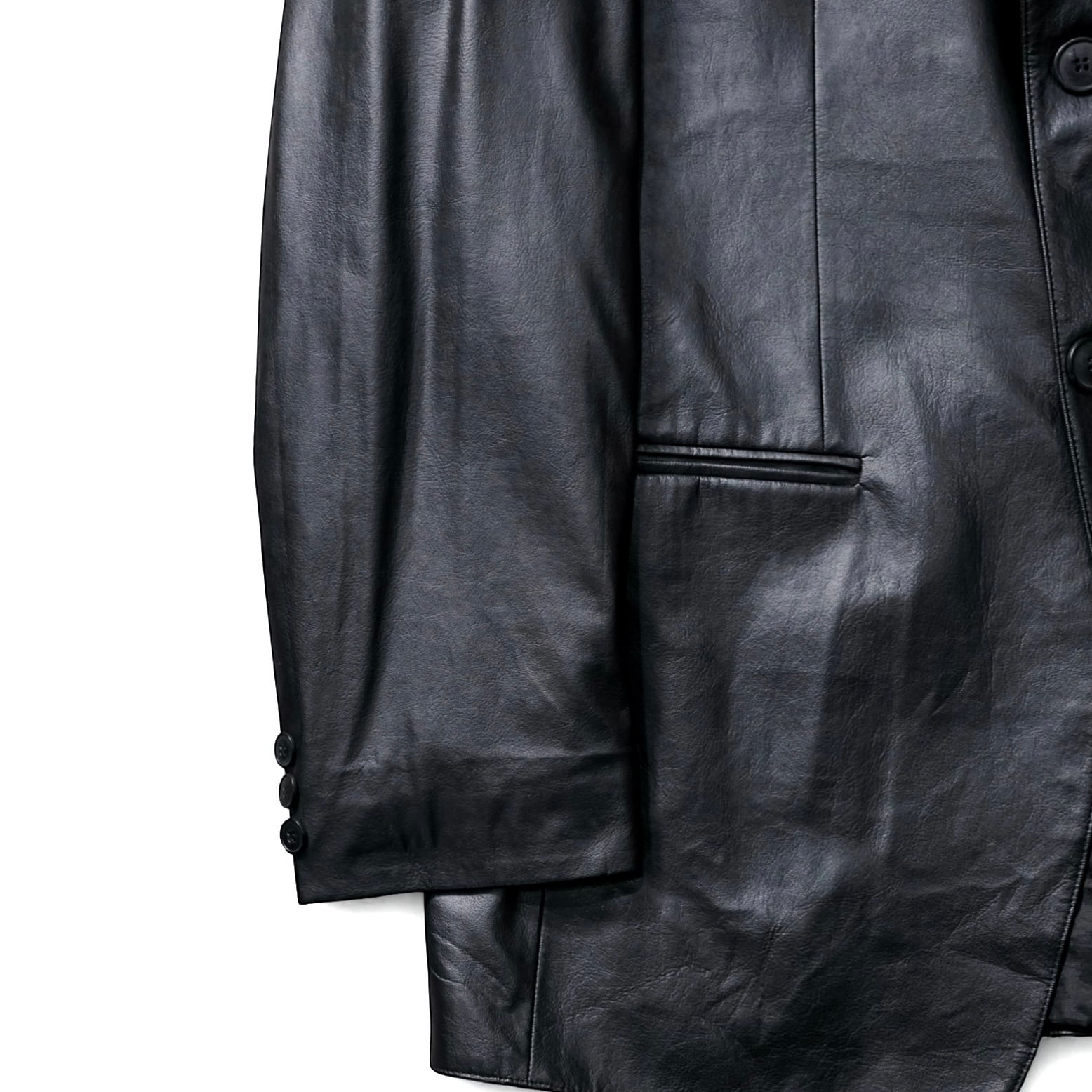 フロントの2ボタンや細めのラペルが、PU素材特有のドレープと相まって、レザーアイテムでありながら上品なテーラードの佇まいを演出します。