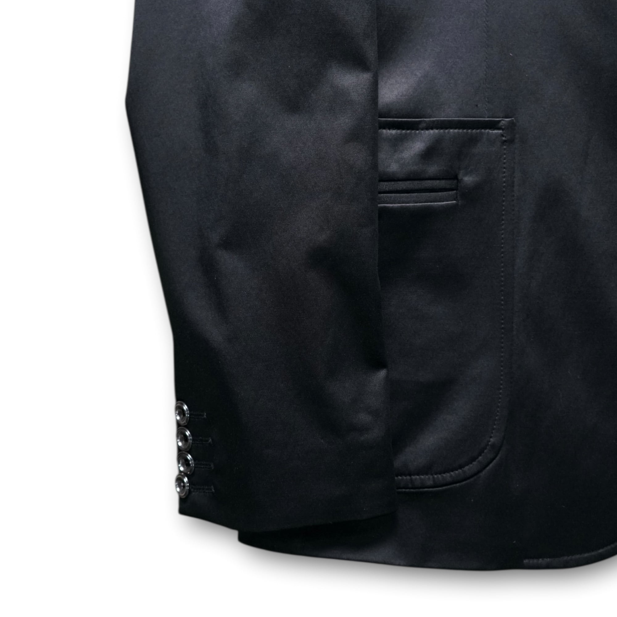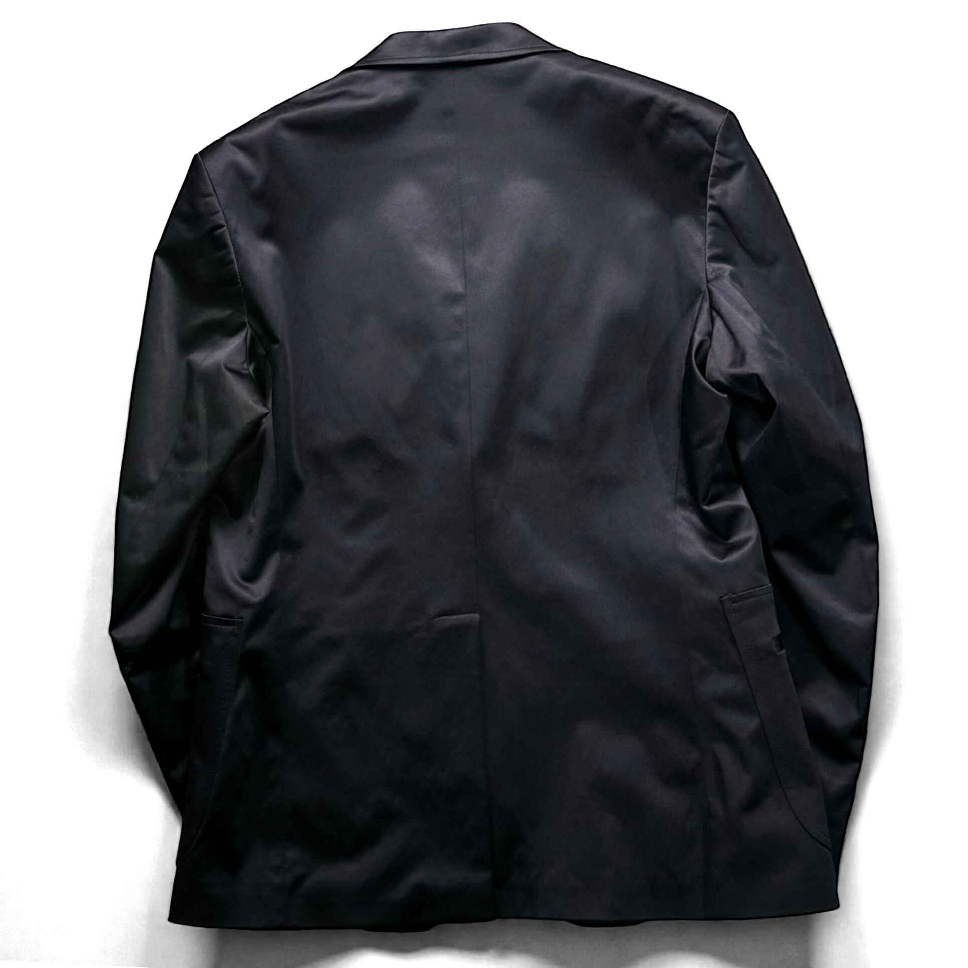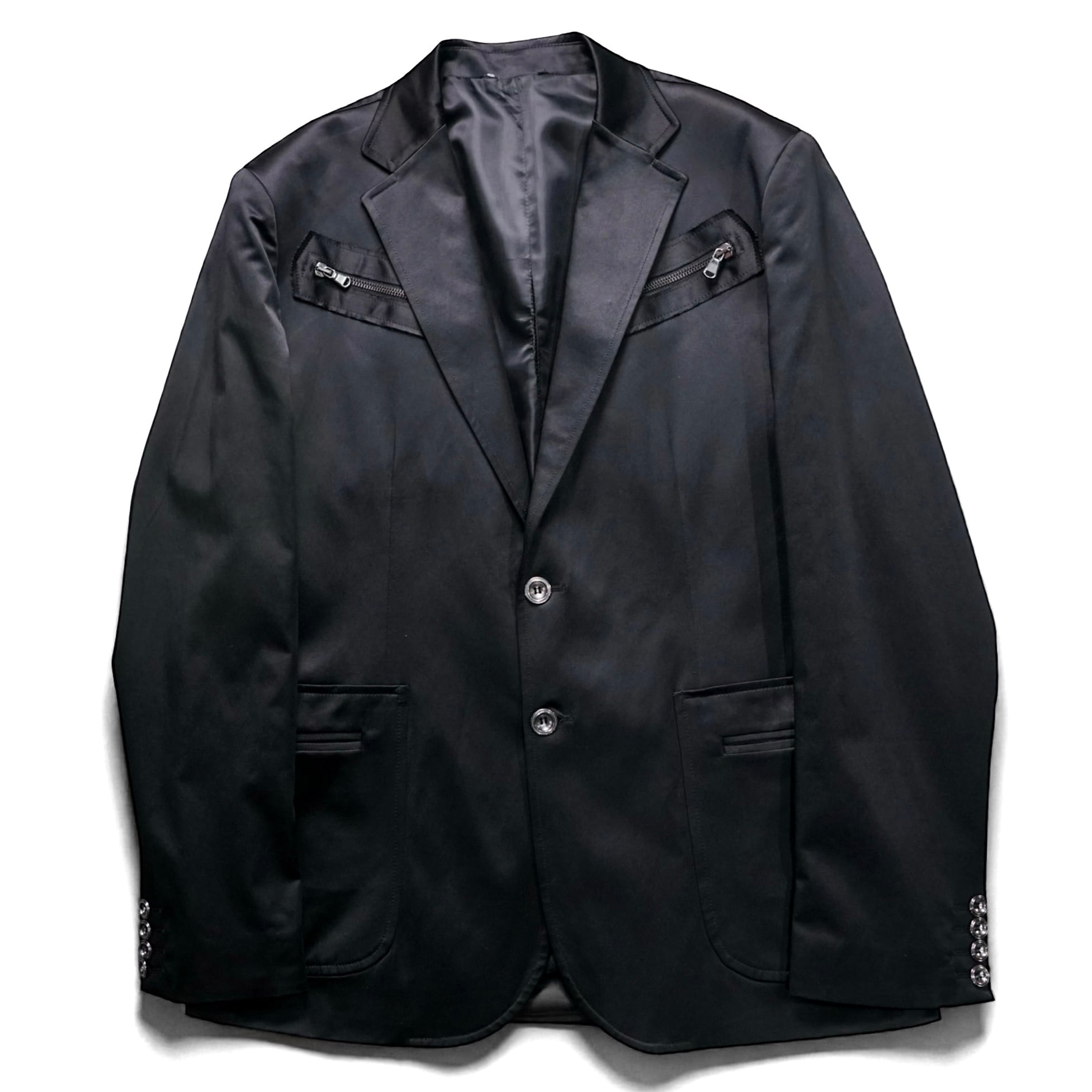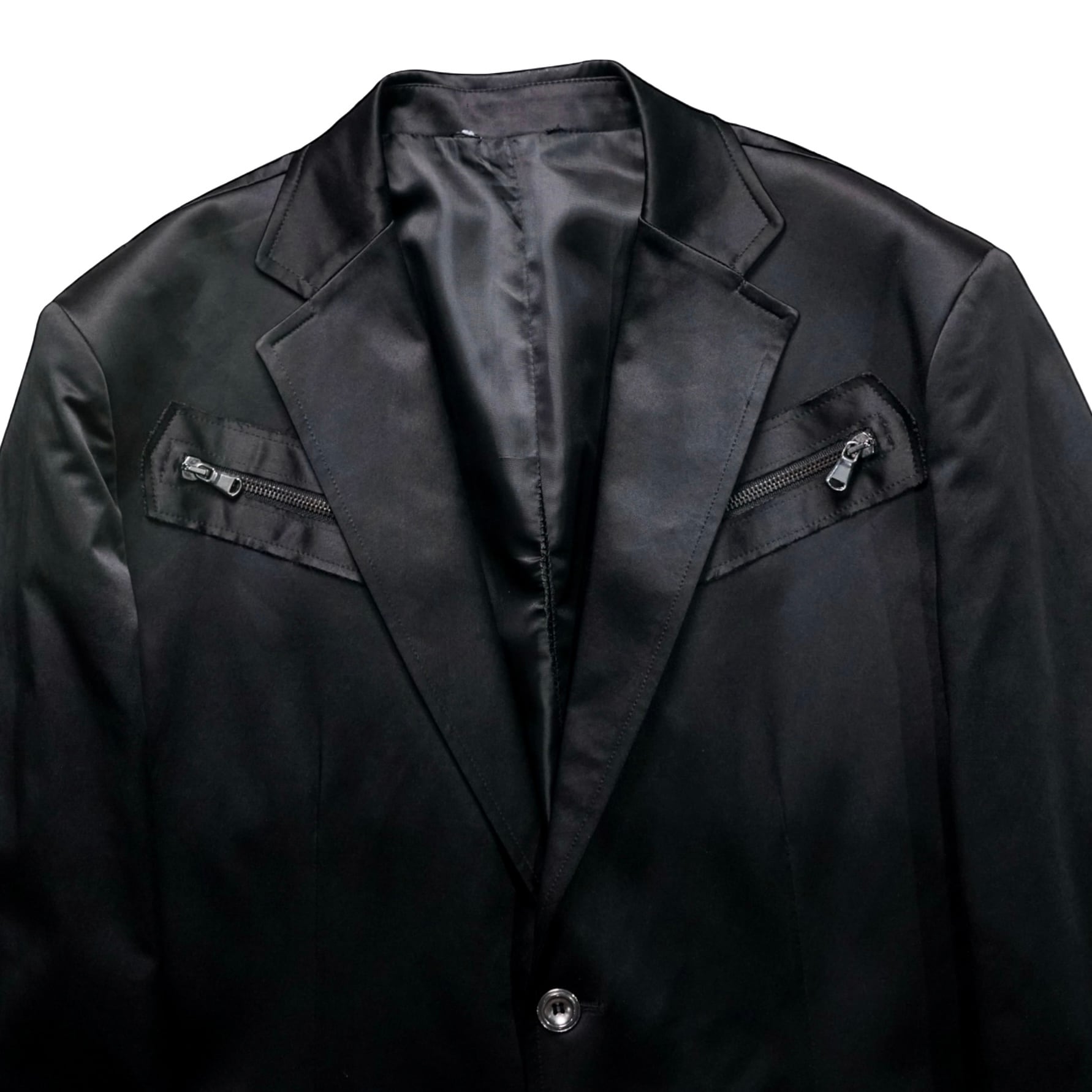 ミニマルなブラックテーラードに、光を受けて艶めくサテン切り替えとジップディテールを配した一着。