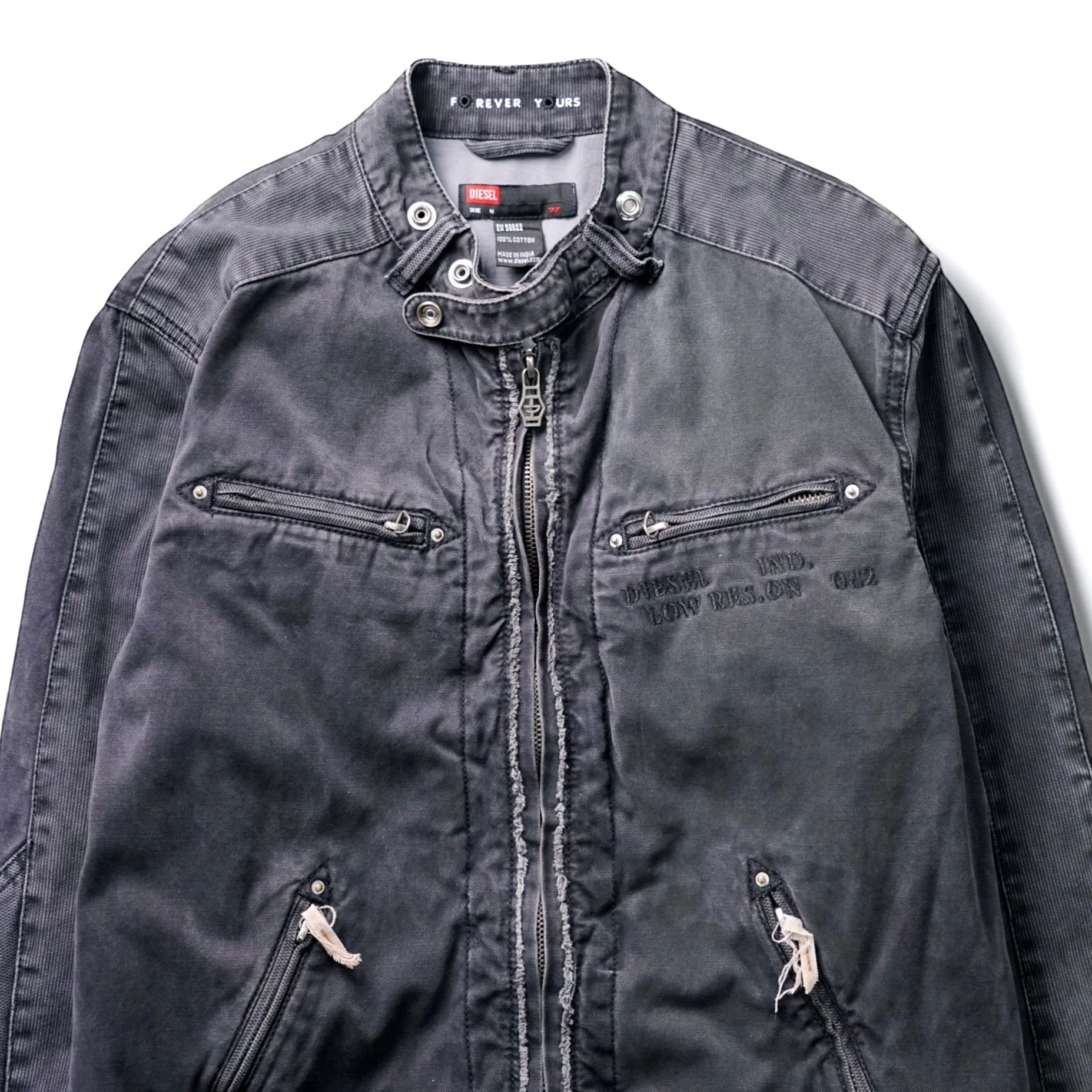 フロントに走る2本のジップライン、ステッチワーク、褪色したブラックトーンが相まって、ブランド特有のアーカイブ感とインダストリアルな空気を纏った一着です。