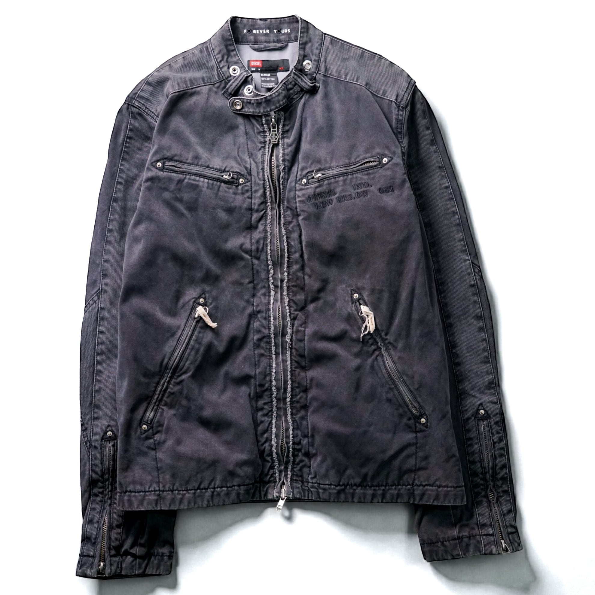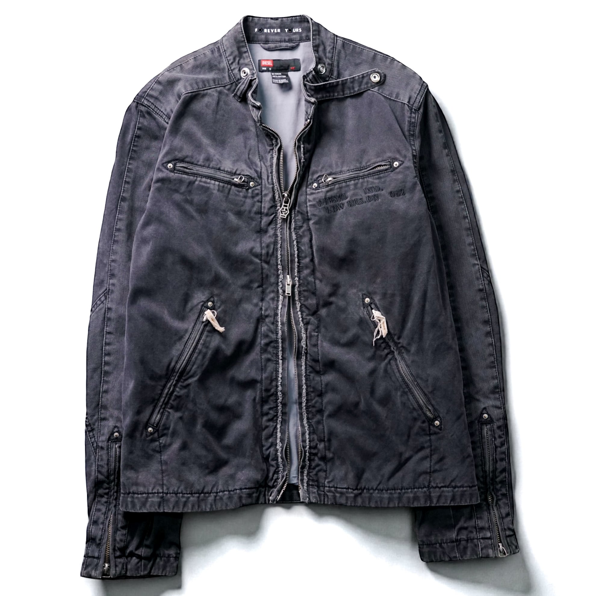 長年着込まれたような色落ちと無骨なディテールが際立つ、DIESELのフェードブラック・ダブルジップモータージャケット。