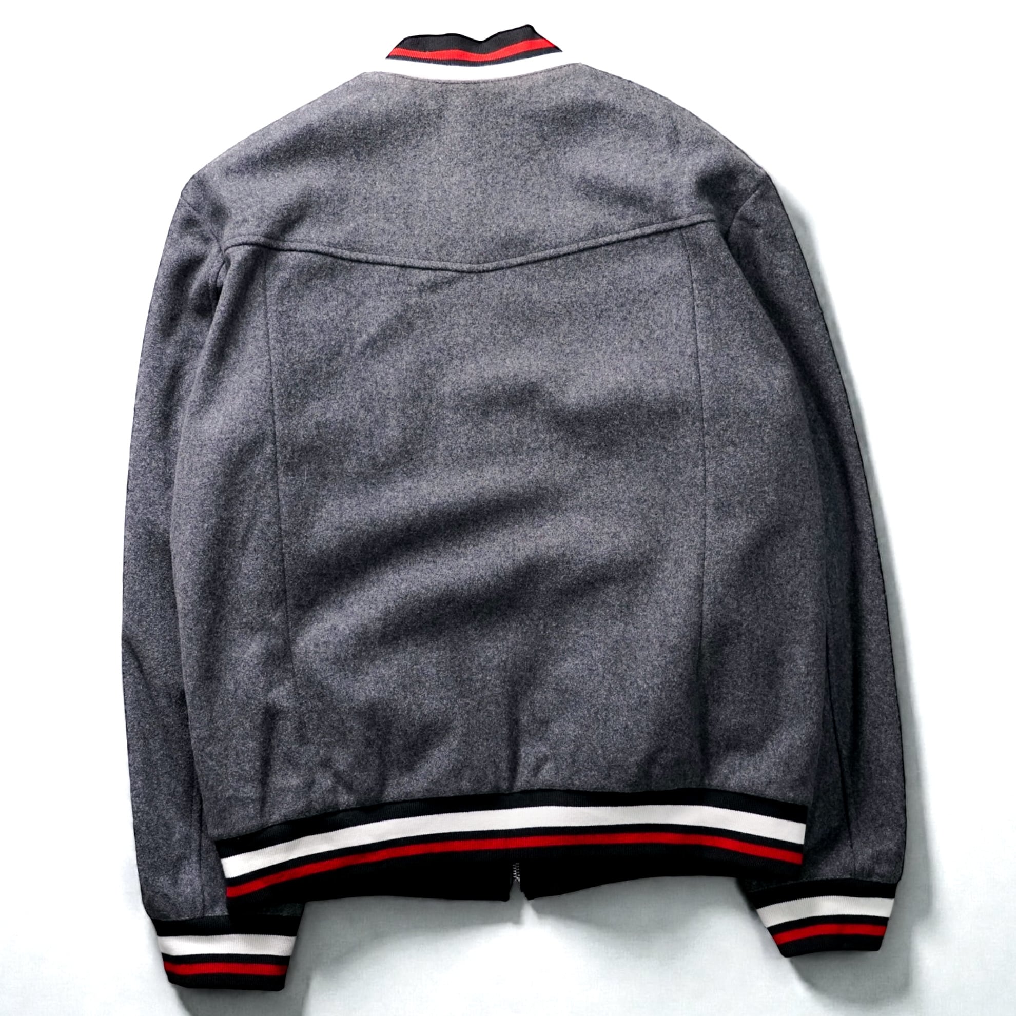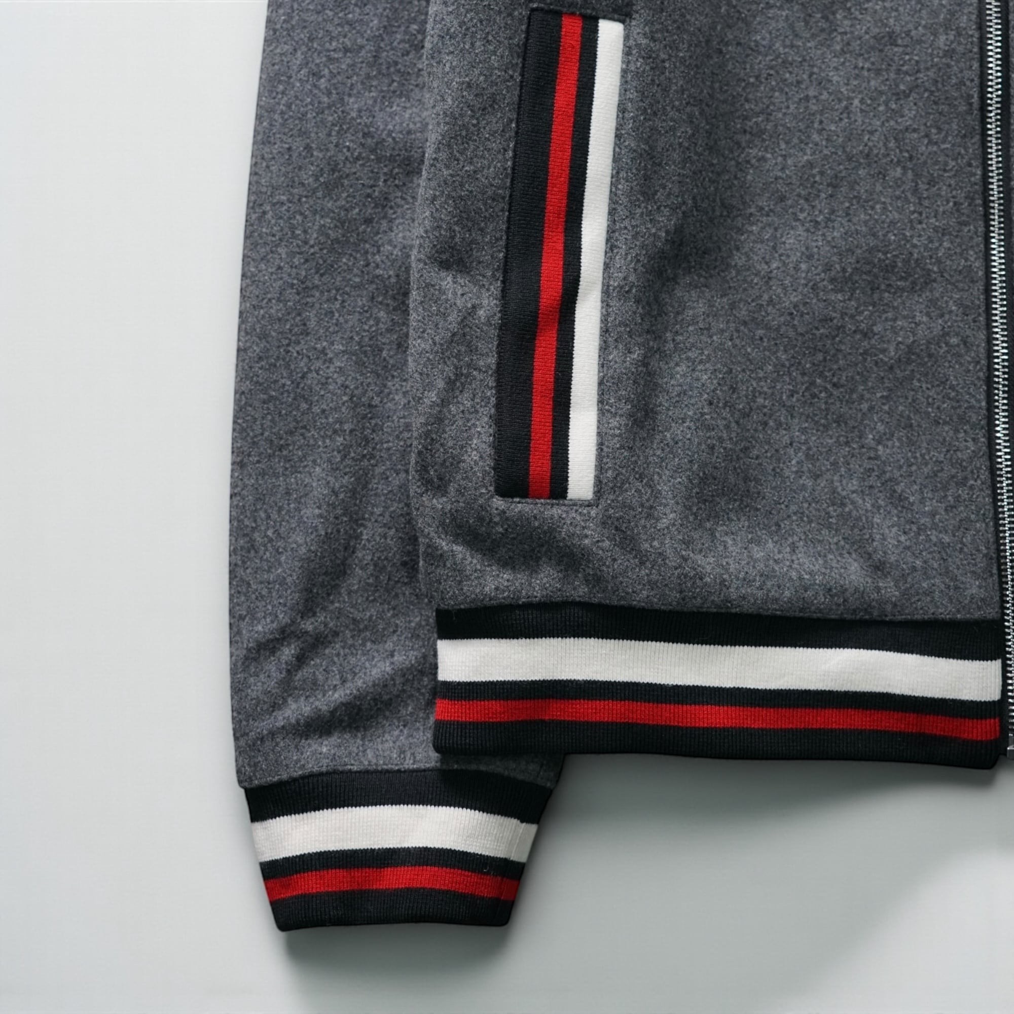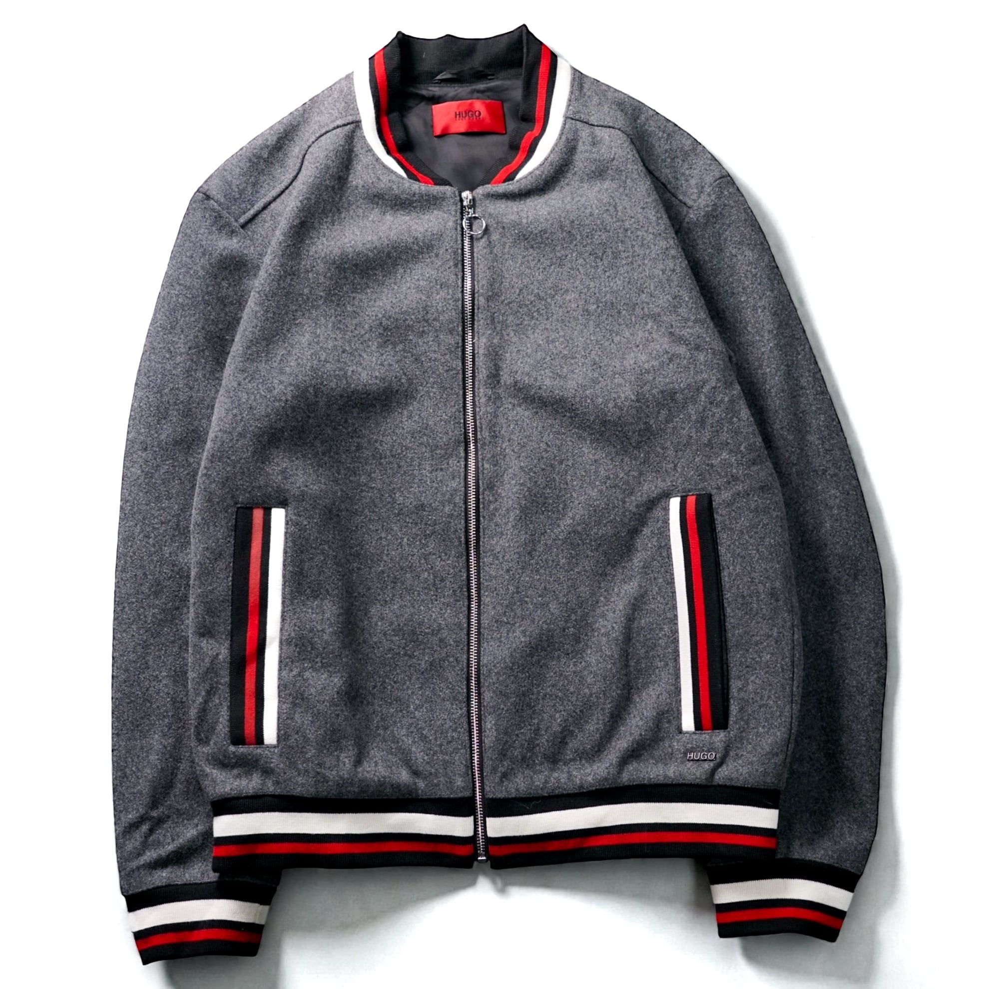 グレーウールの上質な質感に、赤・白・黒のラインリブを効かせた “HUGO BOSS” のウールブルゾン。