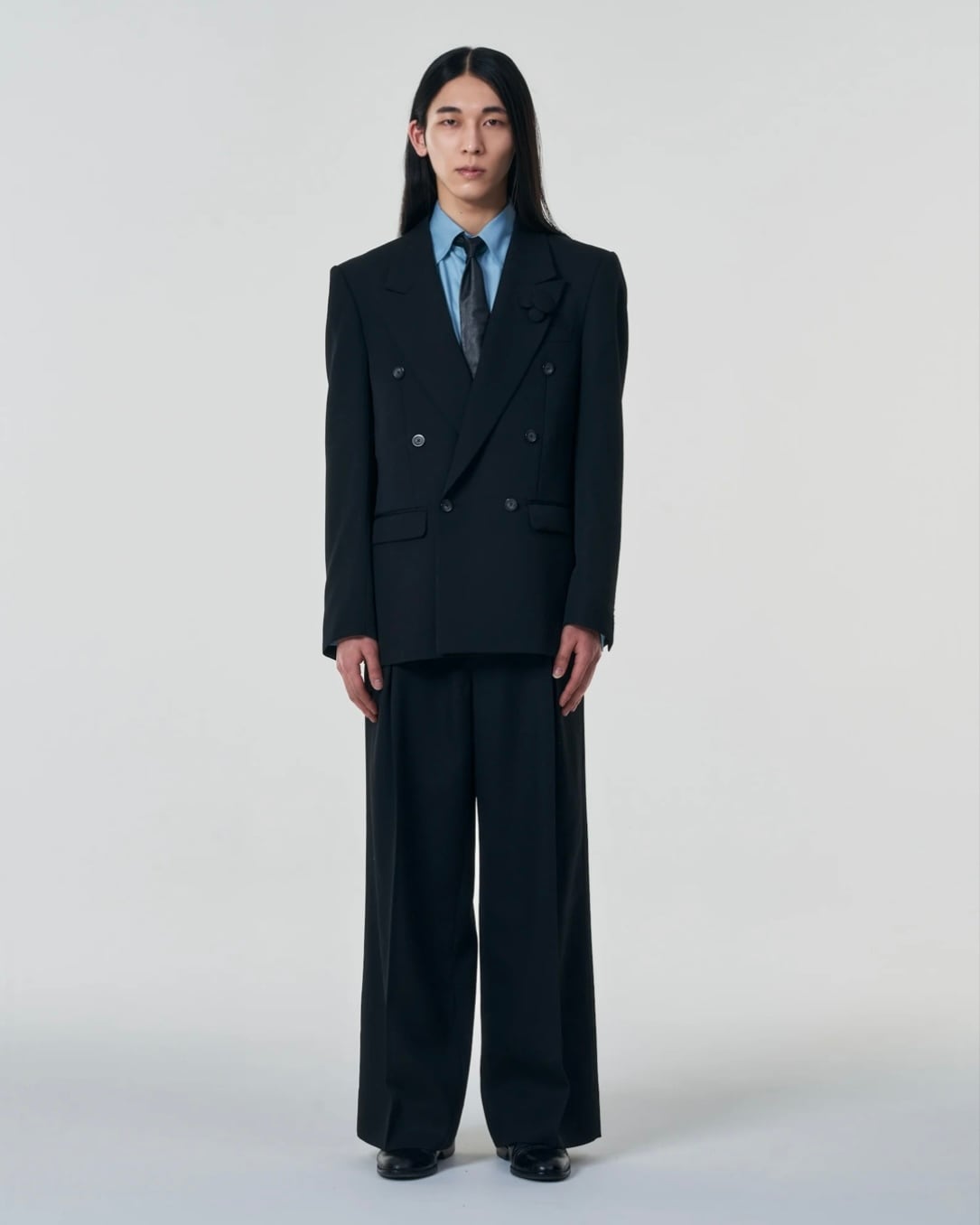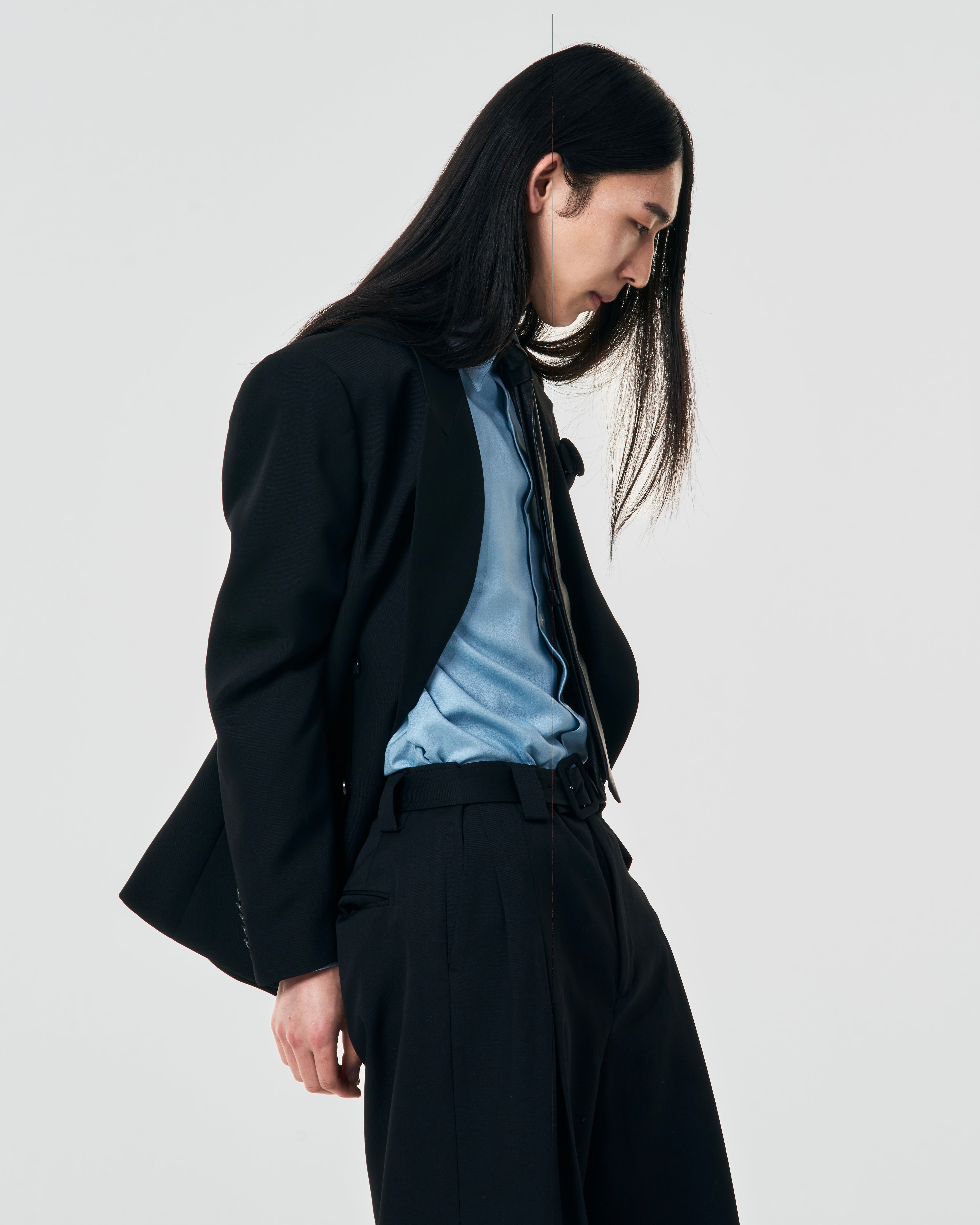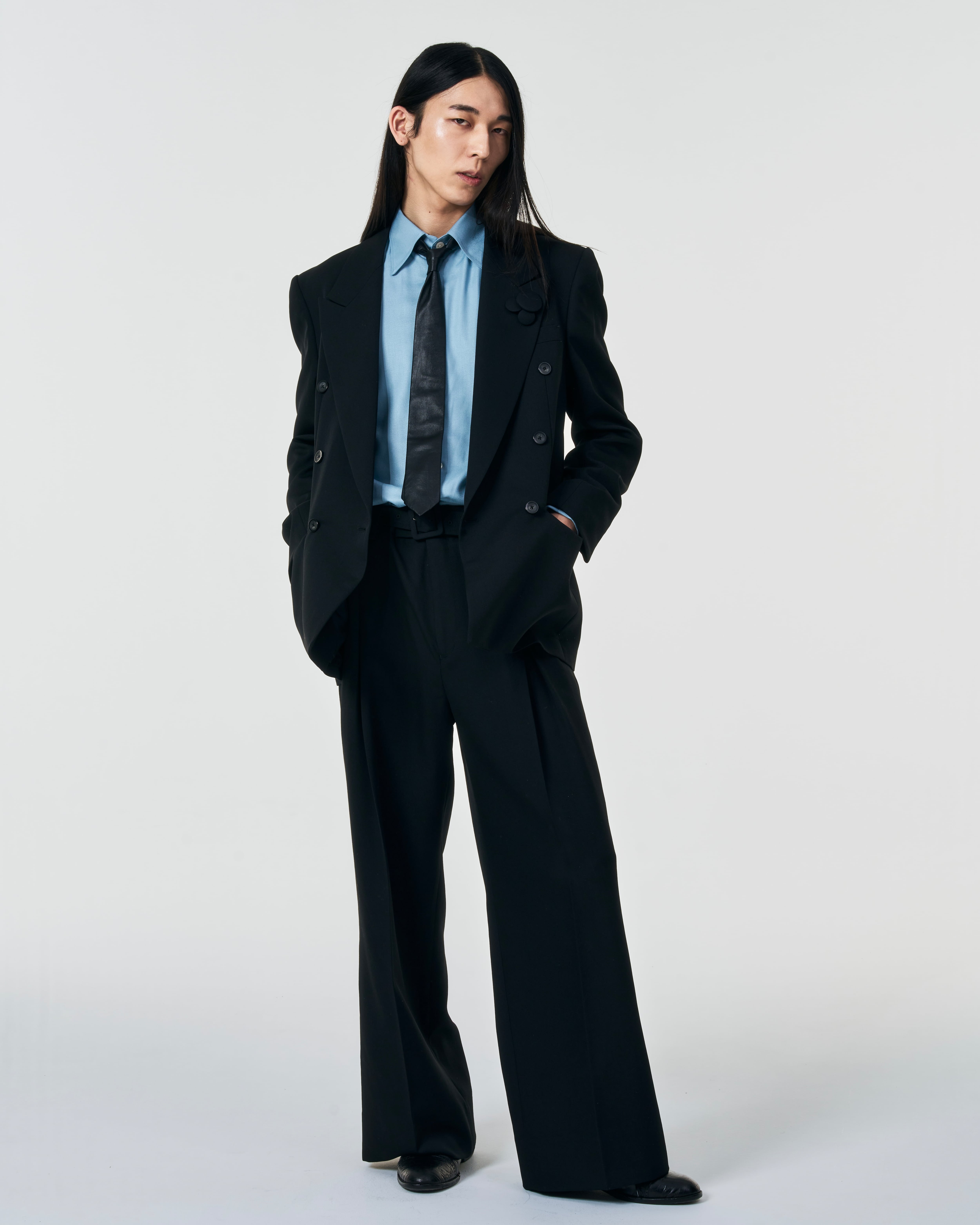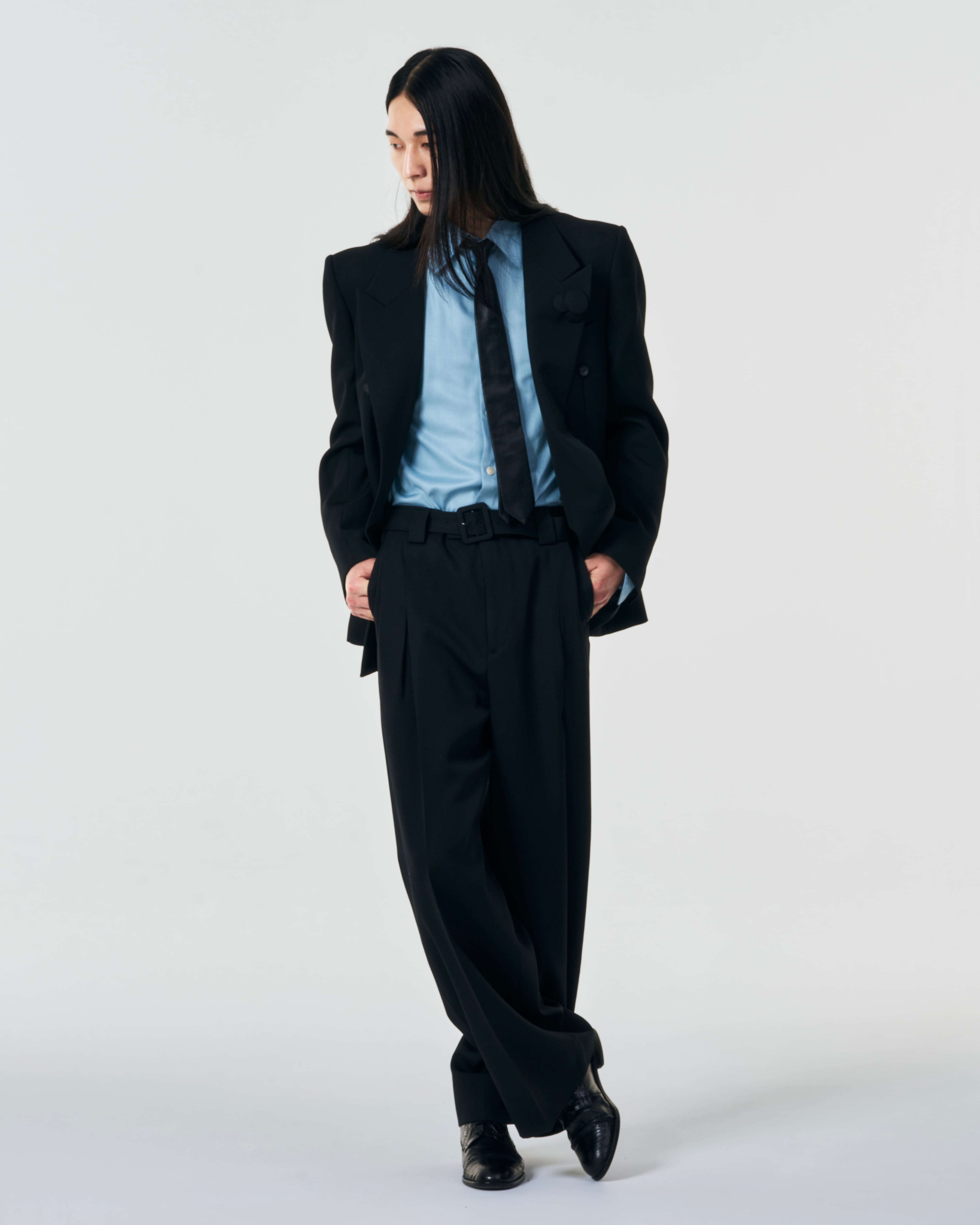 迫力のあるピークドラペルと相まって、クラシックとモードの中間に位置する独自のバランスへ。