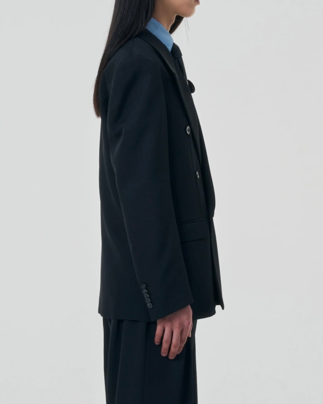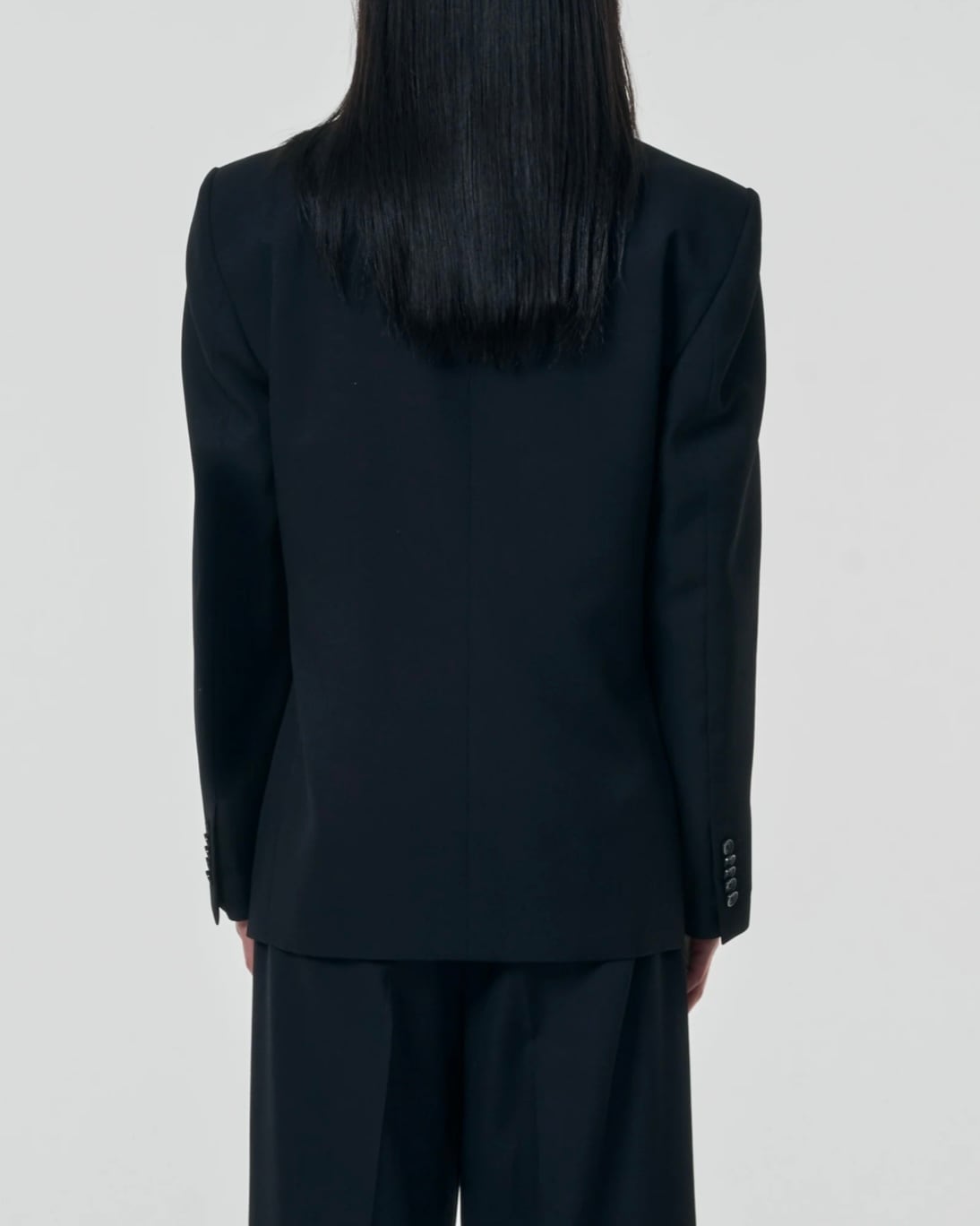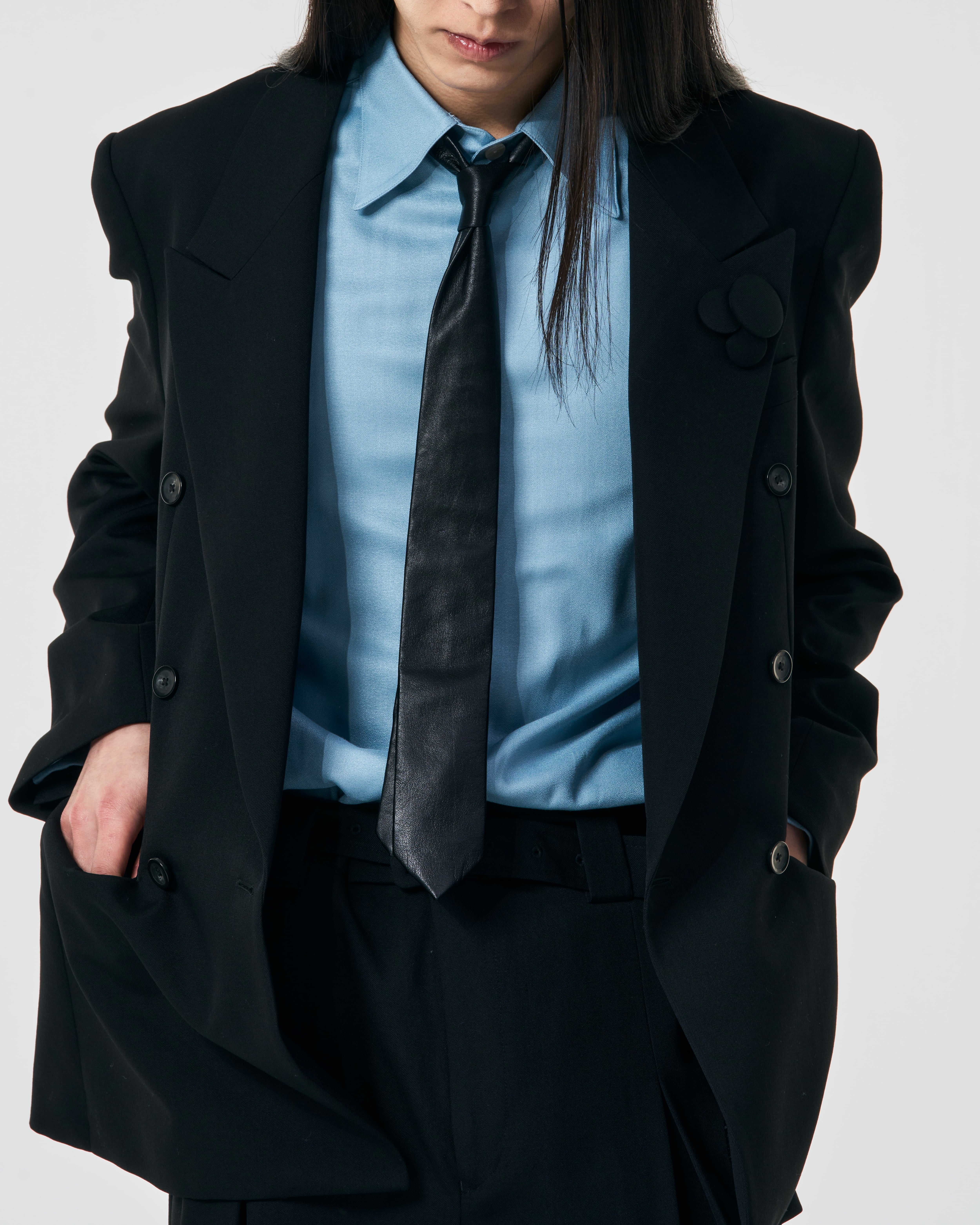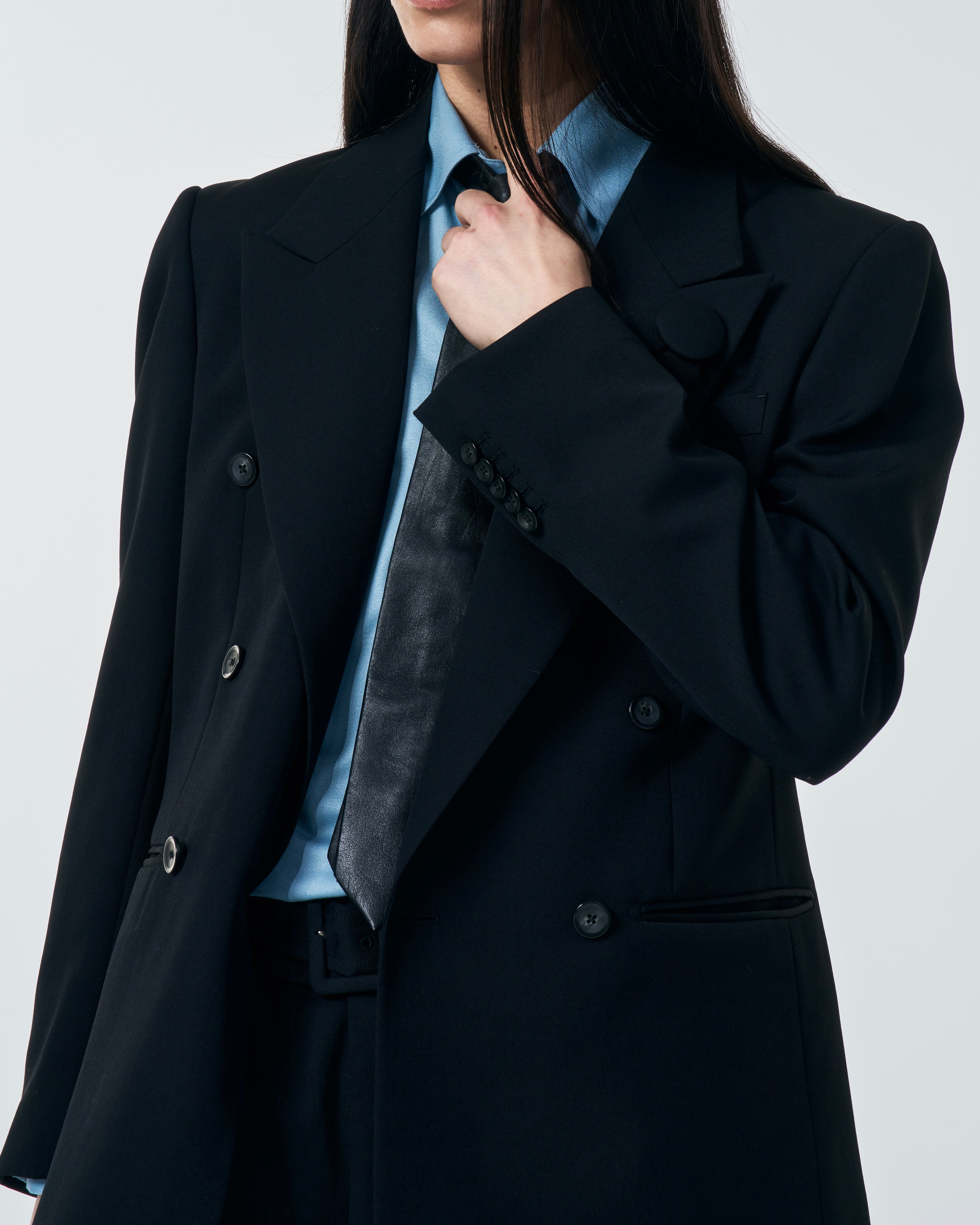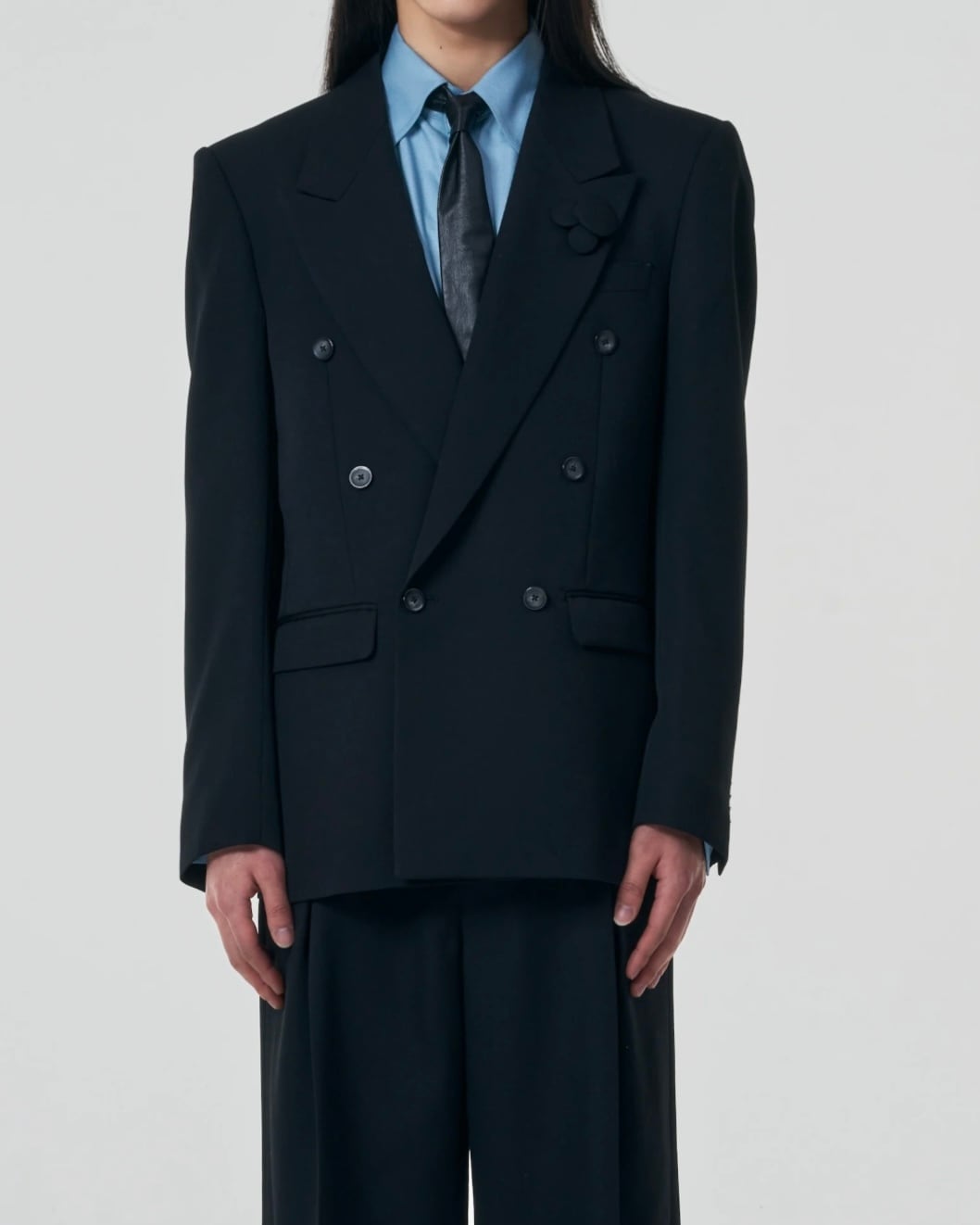 迫力のあるピークドラペルと相まって、クラシックとモードの中間に位置する独自のバランスへ。