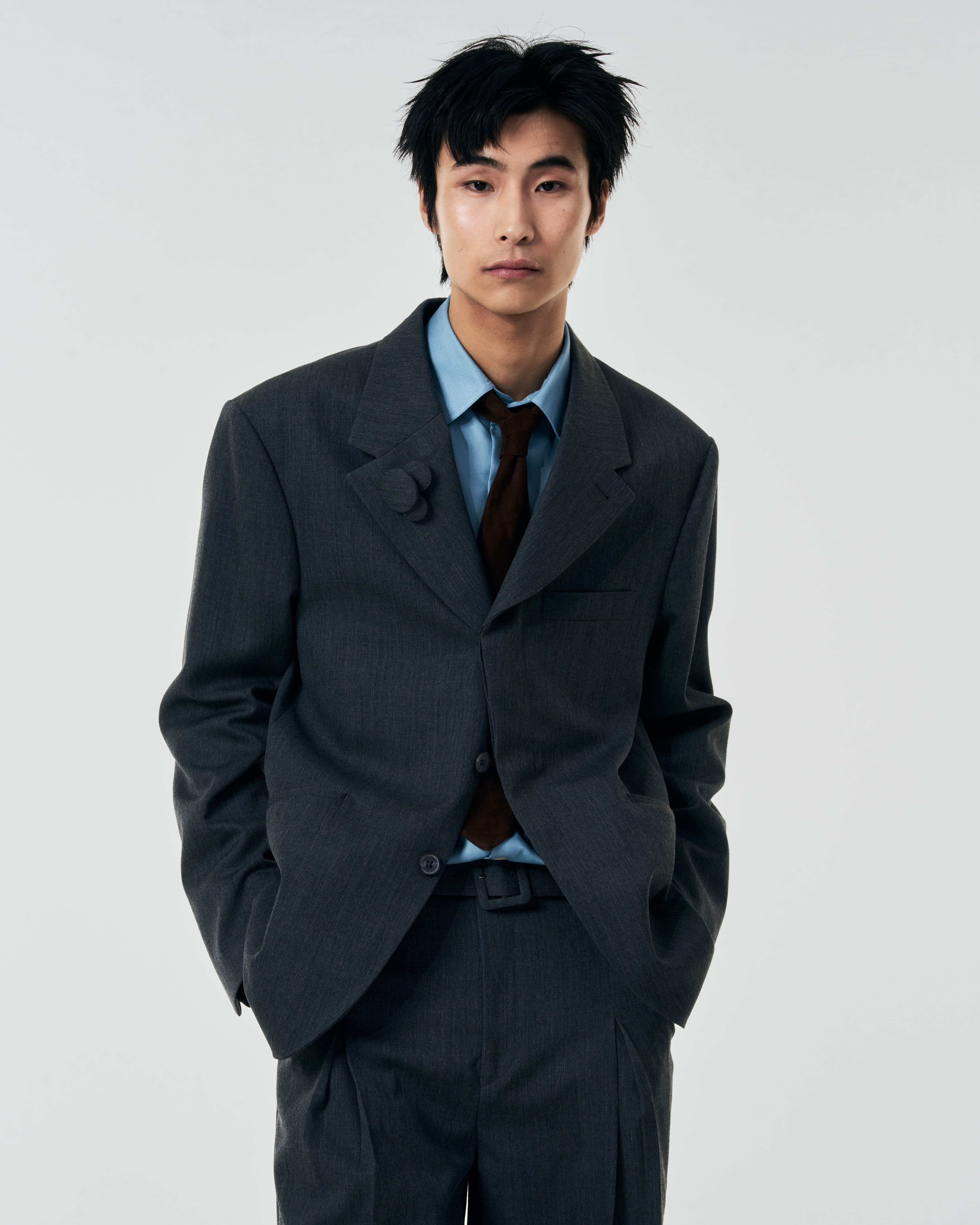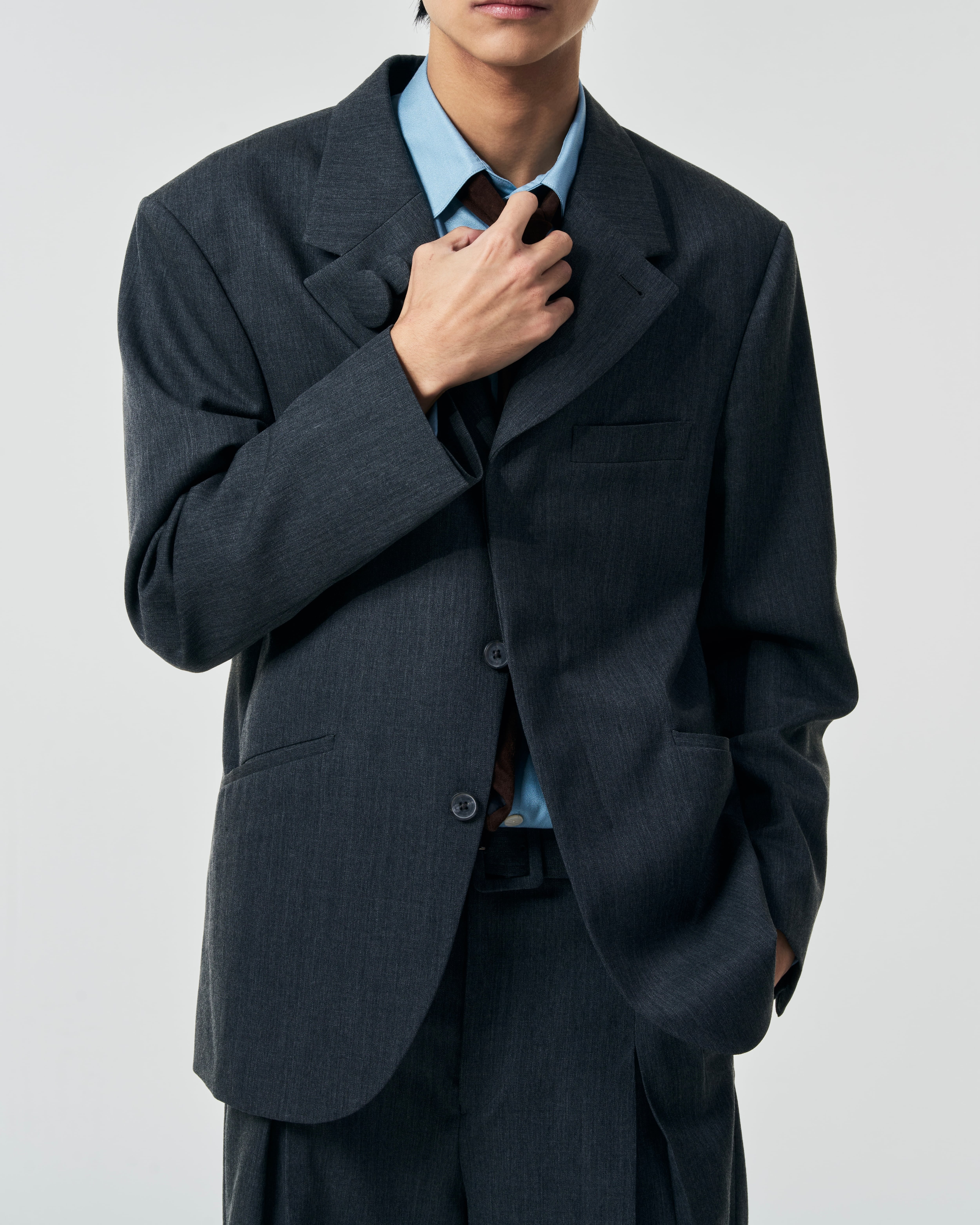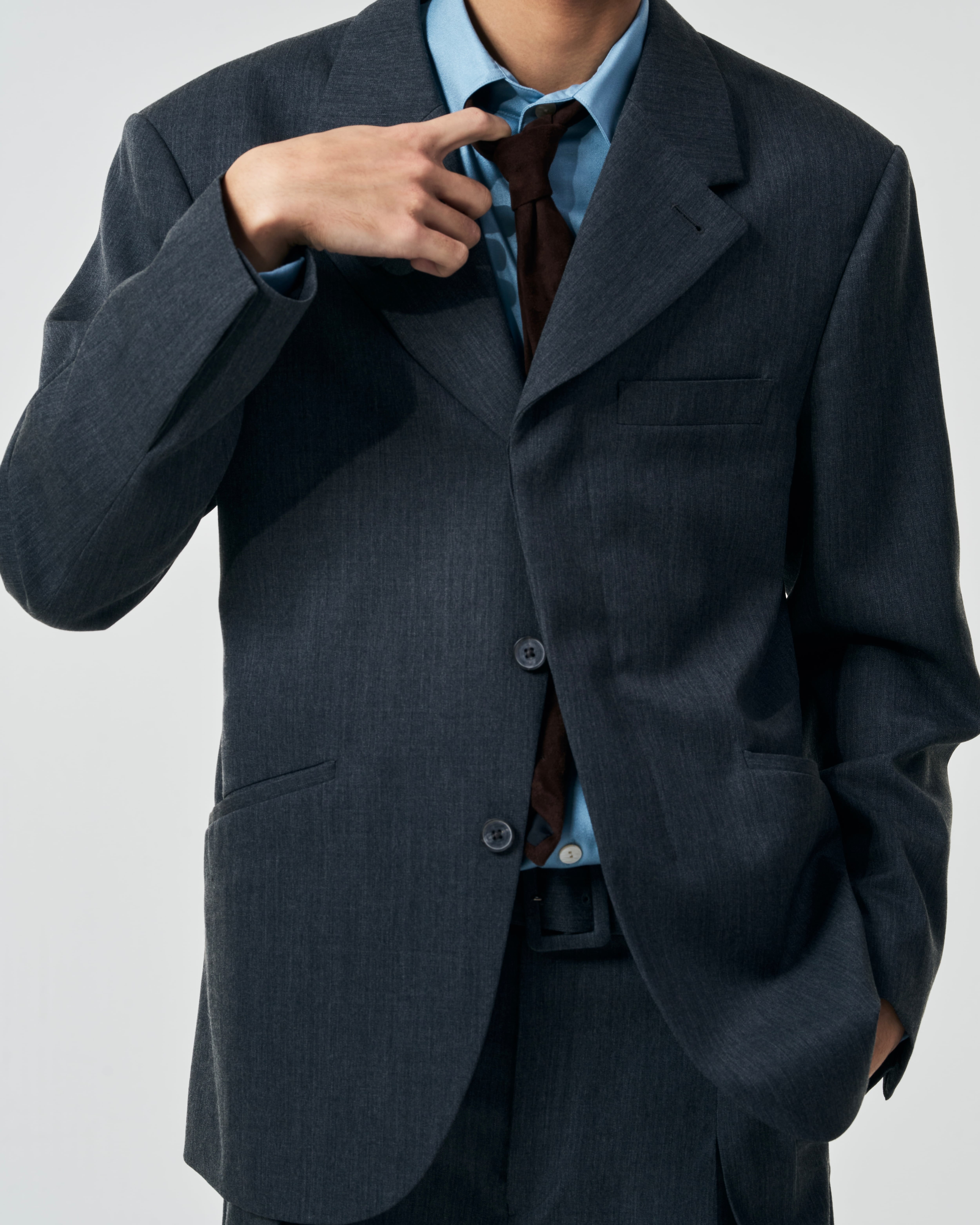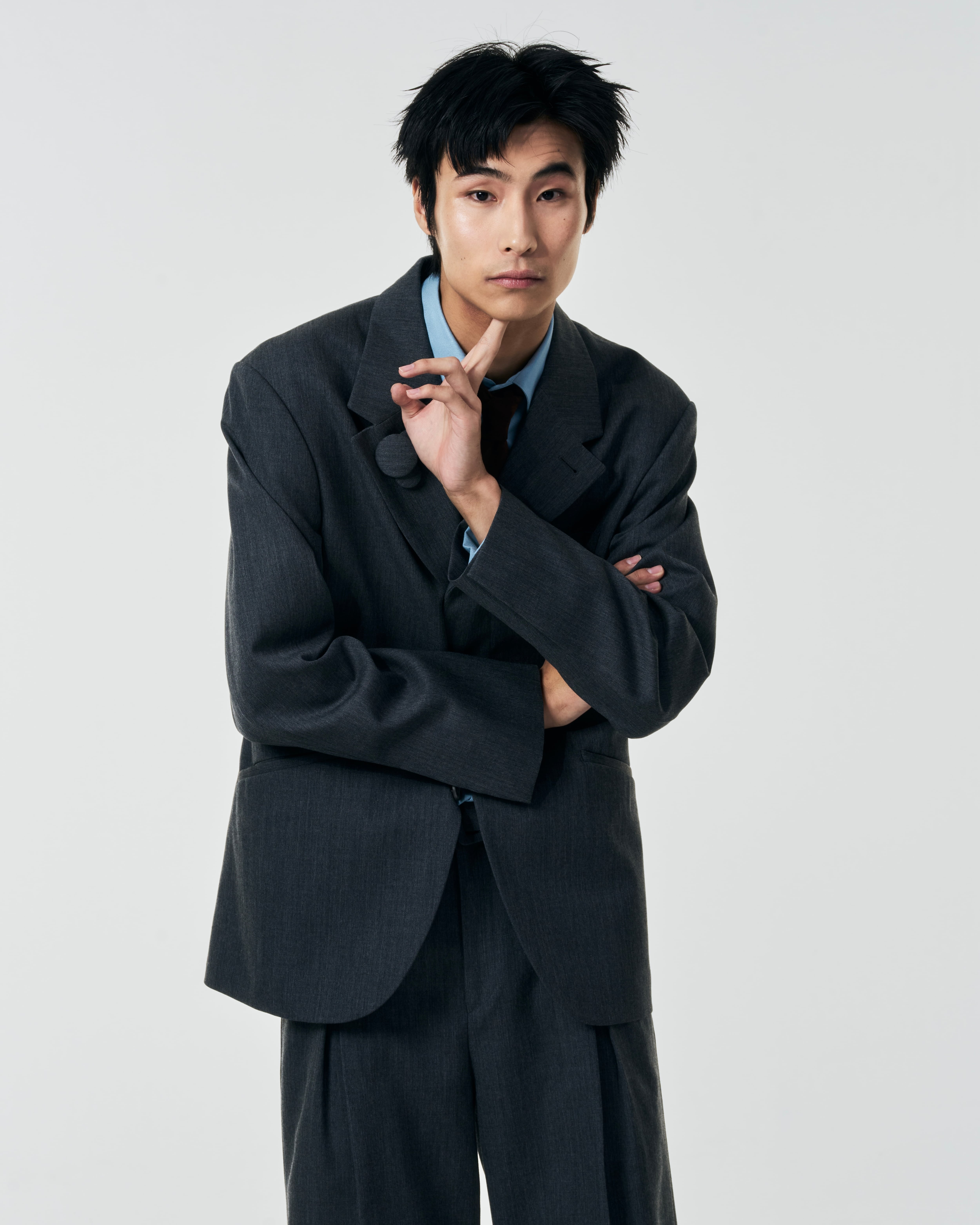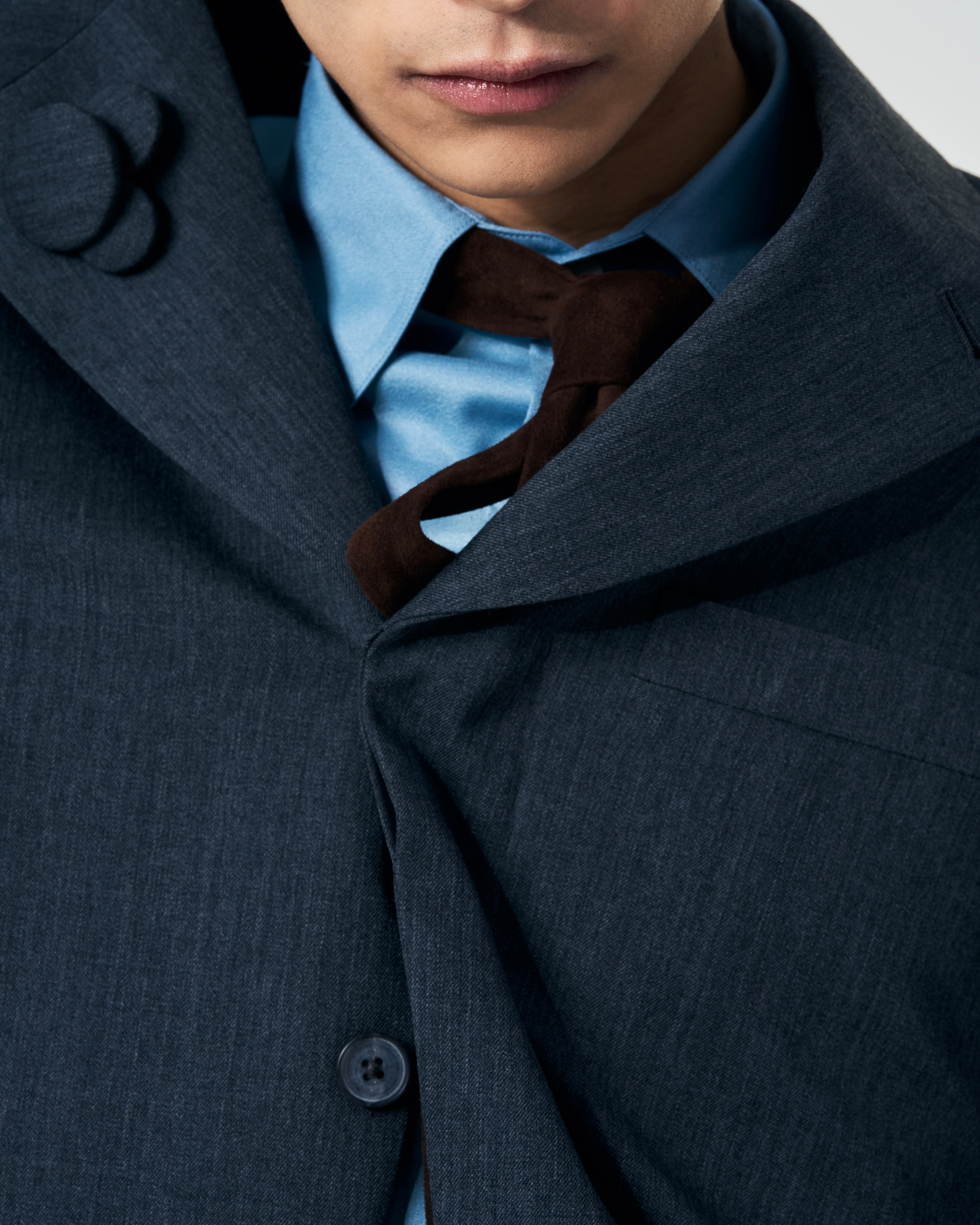 フロントボタンを留めた瞬間に生まれる“ハの字”の開きが特徴の3B比翼ジャケット。