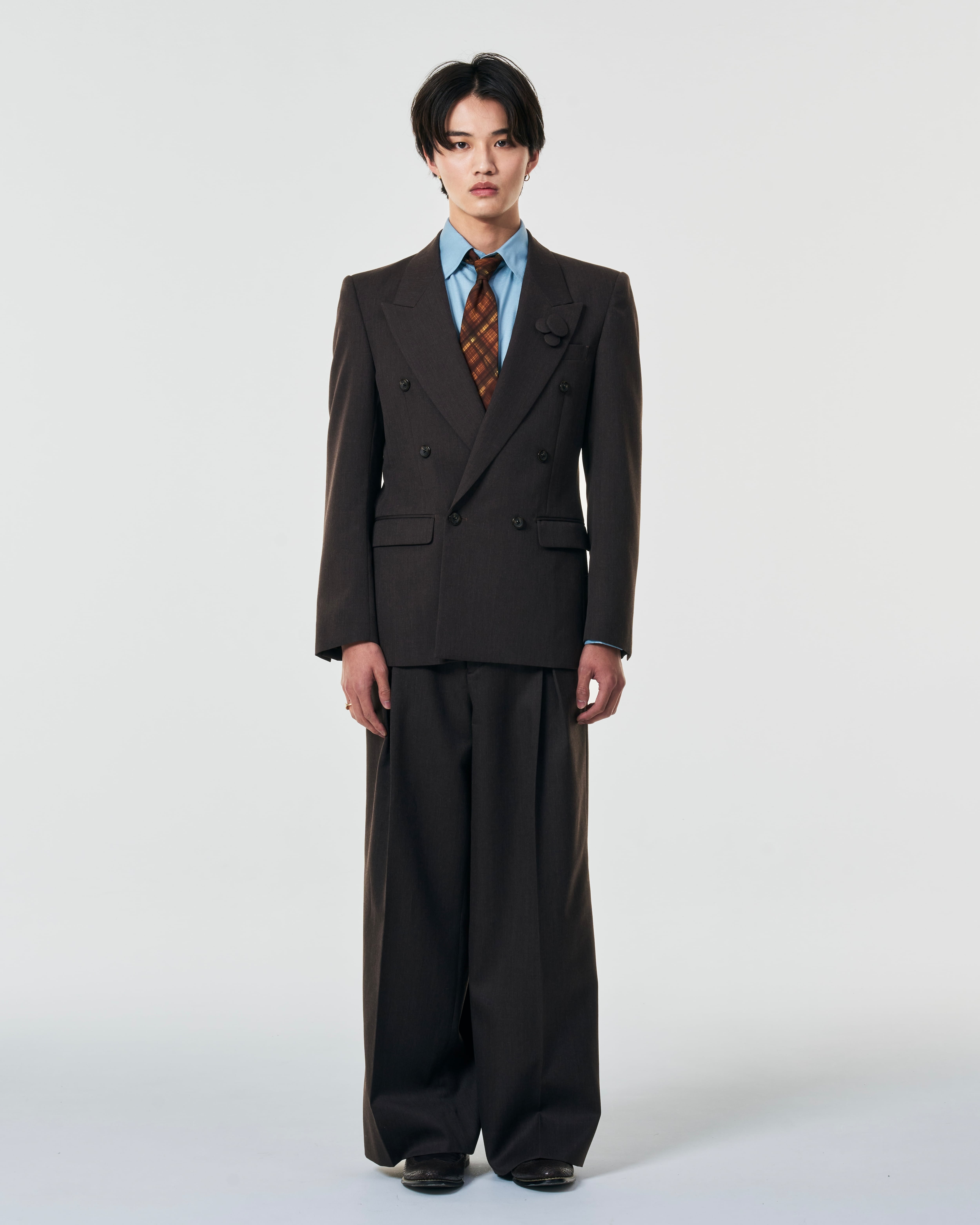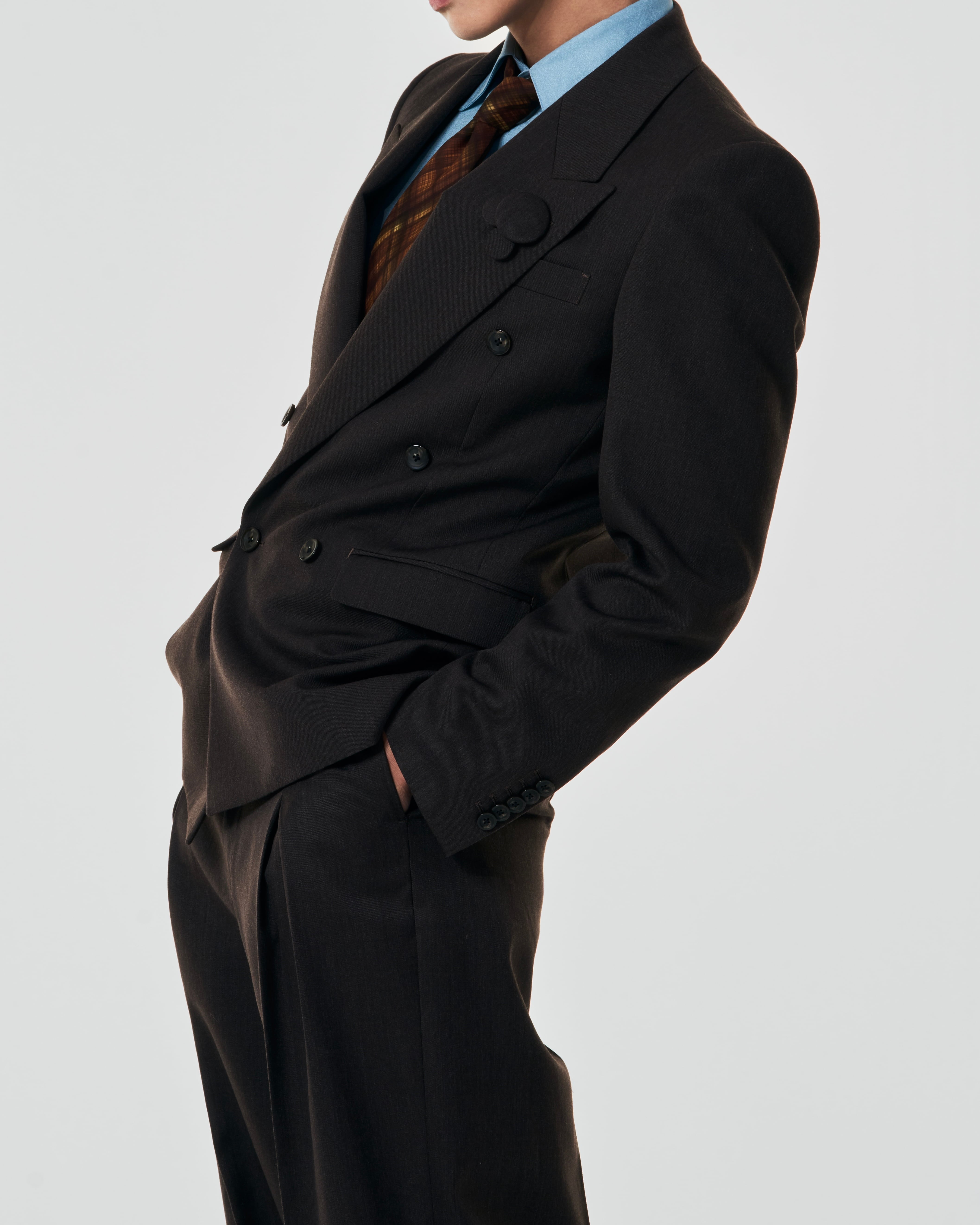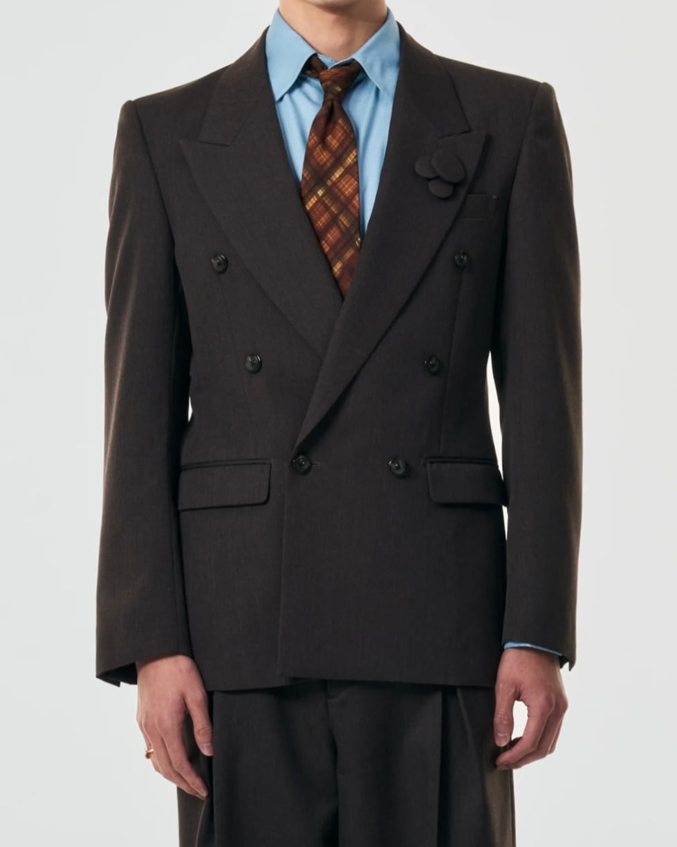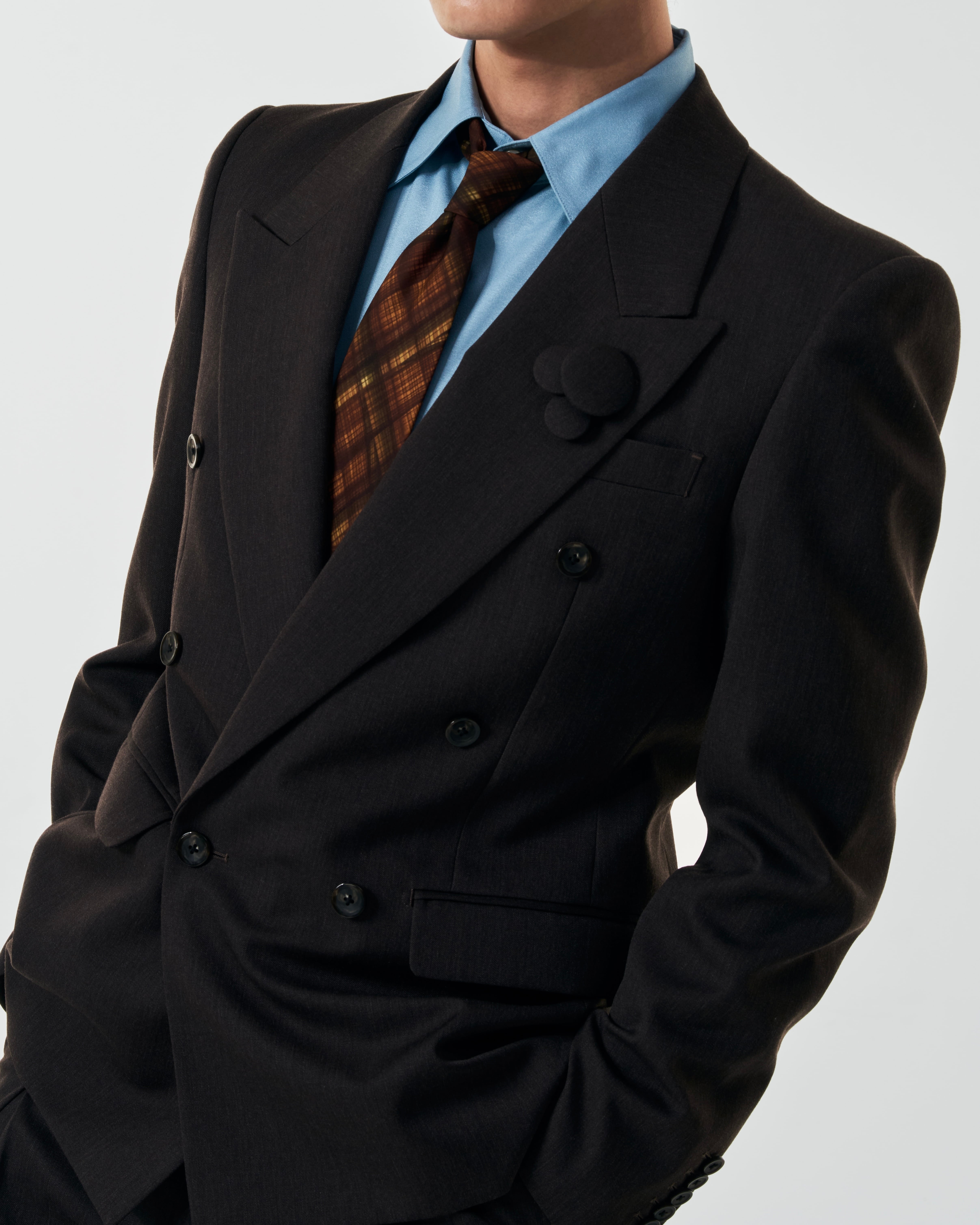 迫力のあるピークドラペルと相まって、クラシックとモードの中間に位置する独自のバランスへ。