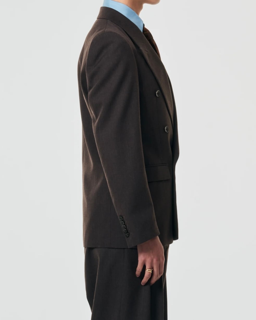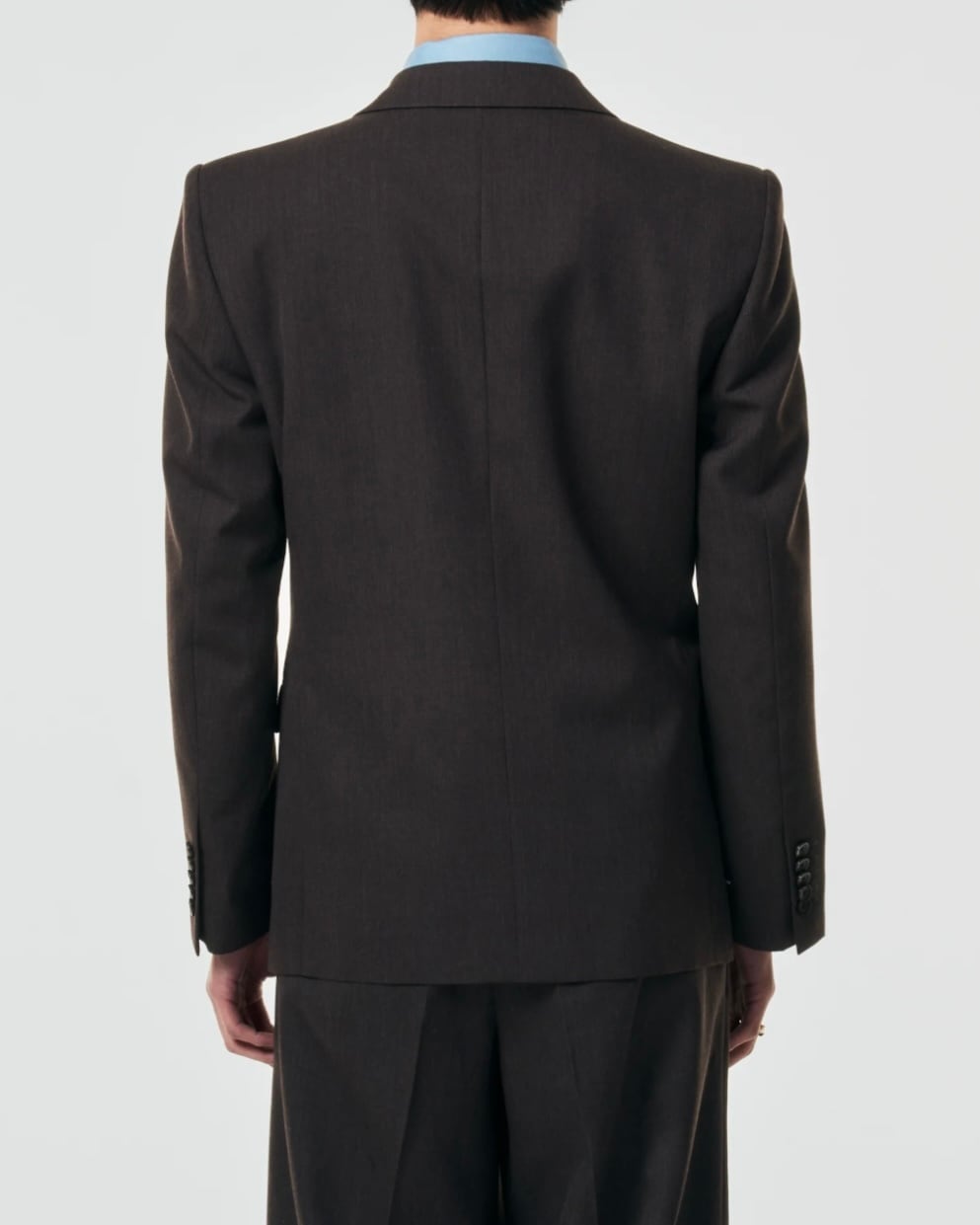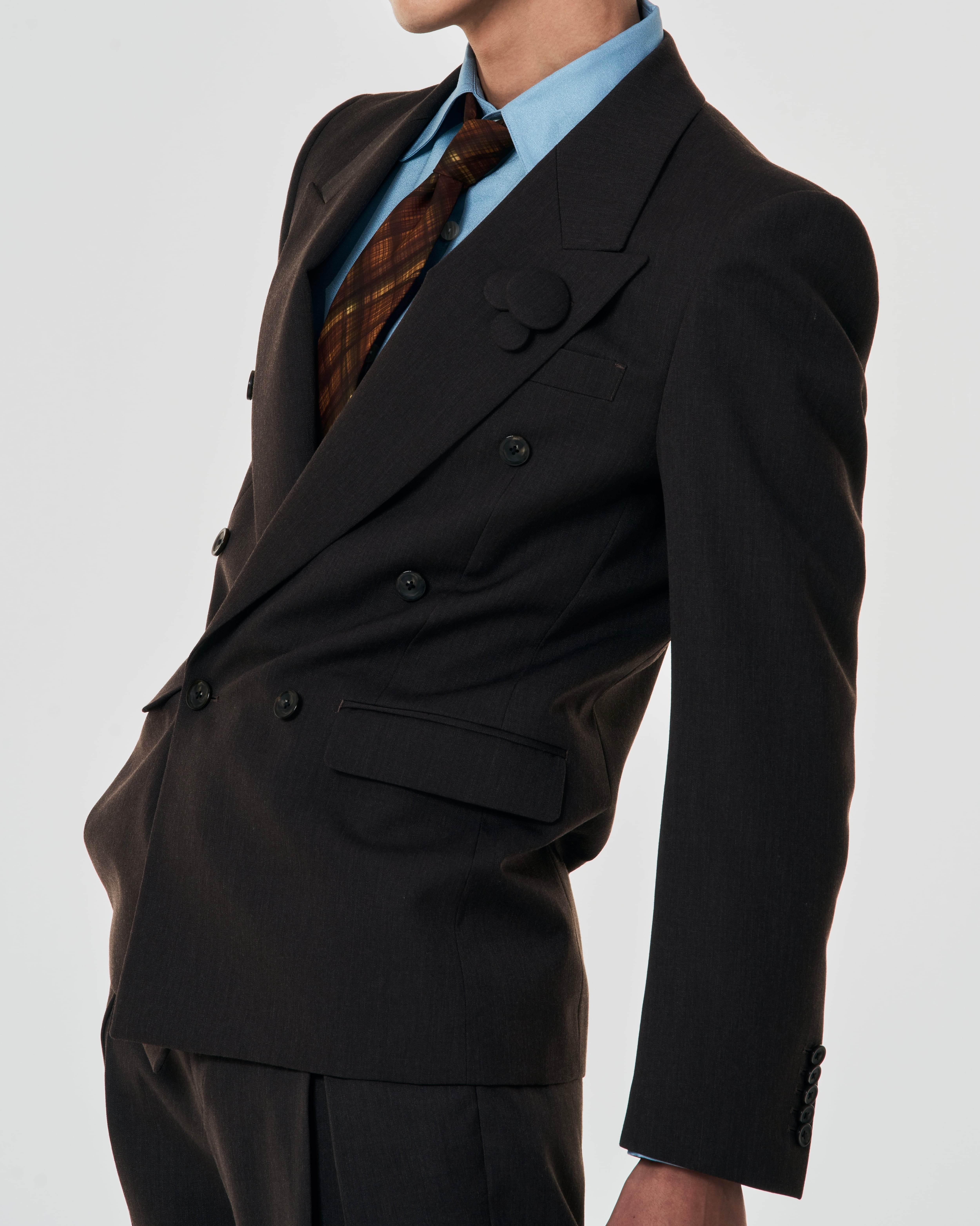 迫力のあるピークドラペルと相まって、クラシックとモードの中間に位置する独自のバランスへ。