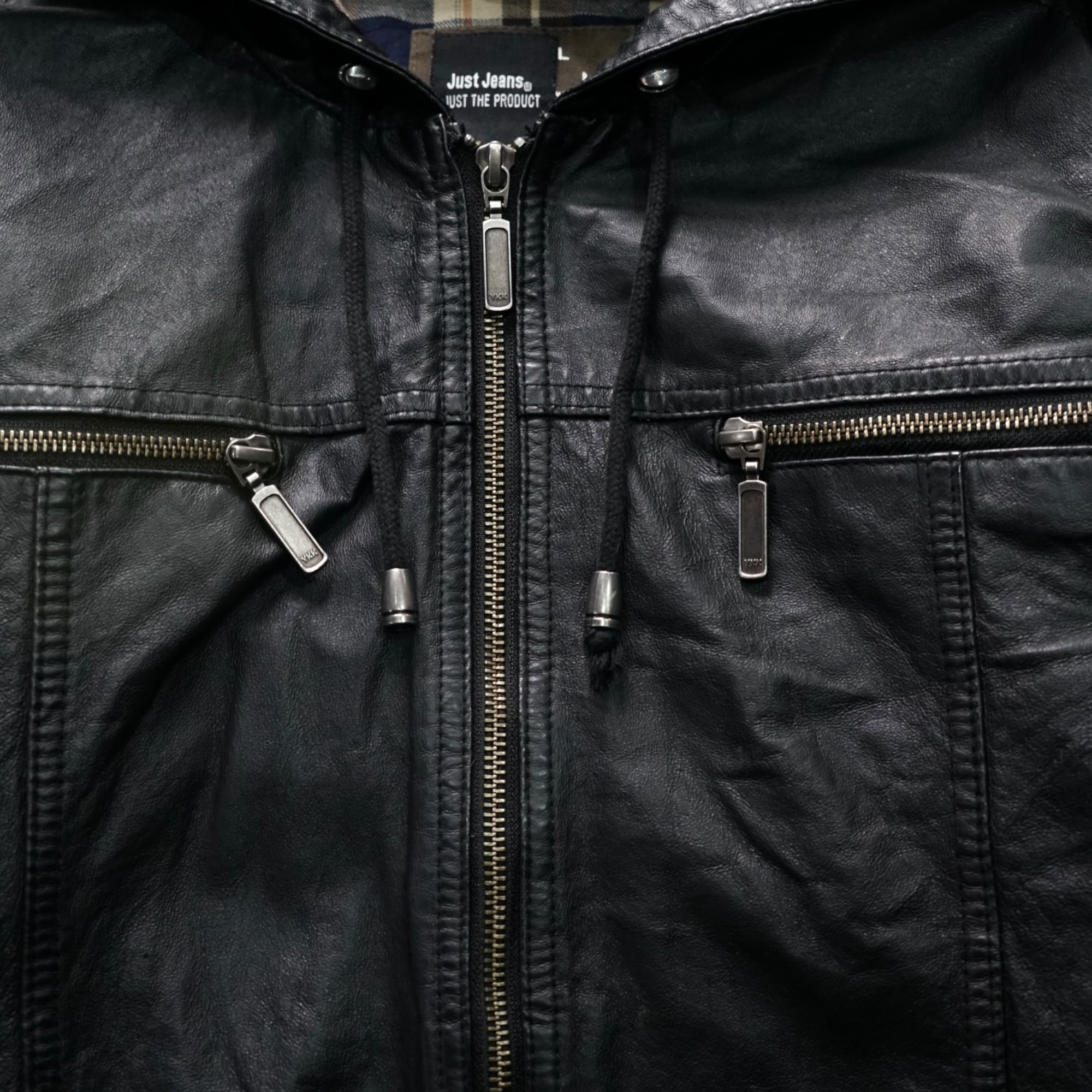 ダブルの胸ポケットジップ、リブ仕様の裾と袖口、ゆるく落ちるフードなど、2000年代初期のストリート&モーターサイクルカルチャーを思わせる実用的なディテールを完備。