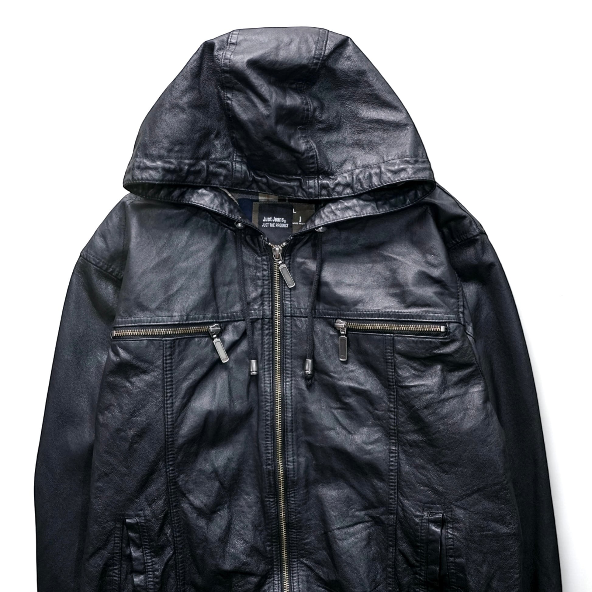 ヴィンテージレザー特有の “時間によって生まれる鈍い艶・こなれた皺感” が魅力のジップアップフーディージャケット。