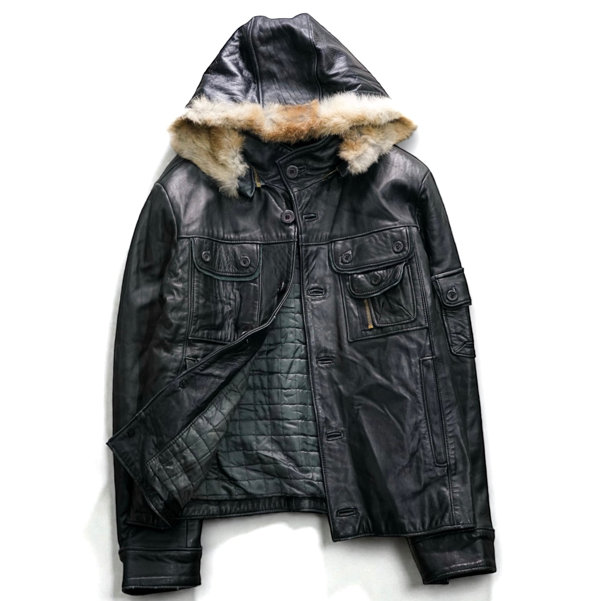 最大の特徴は 取り外し可能なフェイクファーフード。70〜80’sのミリタリー × ムートンの文脈を踏まえながら、都会的なモードへと再解釈されたデザインです。