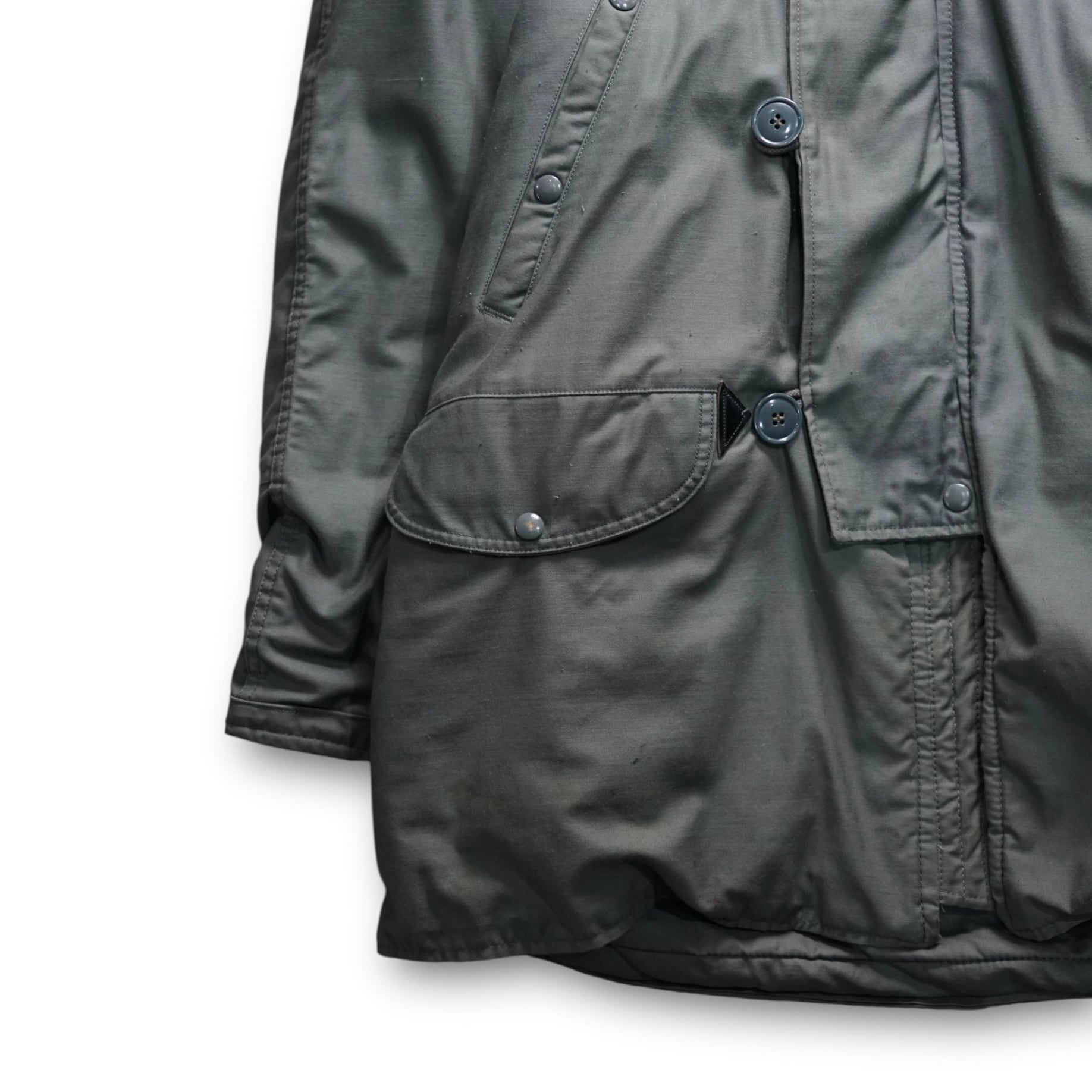 本個体はアメリカ本国生産によるオリジナルで、50%コットン × 50%ナイロンのヘビーデューティーシェルが生み出す無骨な質感、80’s ミリタリー特有の深いオリーブが経年で柔らかくフェードした唯一無二の雰囲気が魅力です。