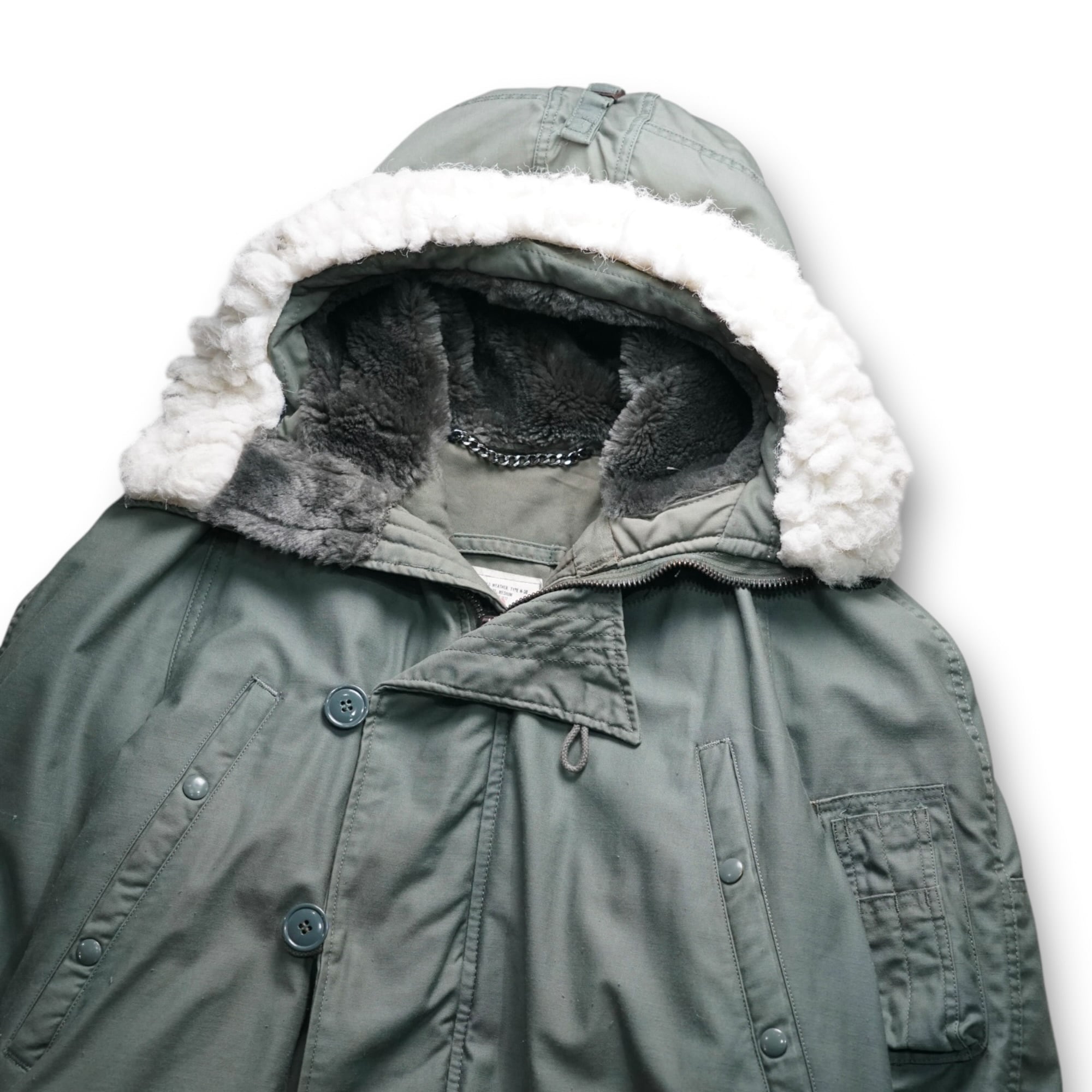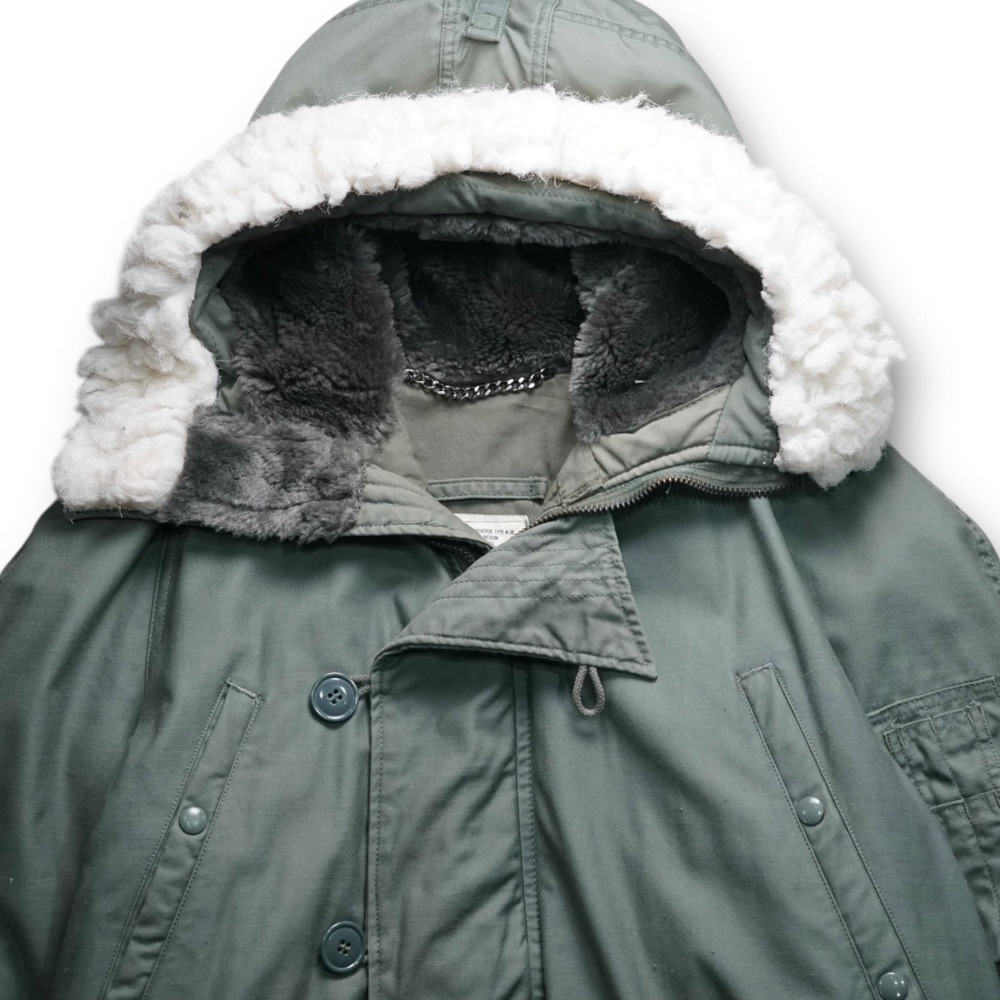 フードにはN3-Bを象徴する 白ファー × グレーパイルライニング が配され、抜群の防寒性と存在感を両立。フロントは比翼構造と大きめのボタン、SCOVILL製ジッパーを採用し、80年代らしい堅牢なミリタリースペックをそのまま味わえる一本です。
