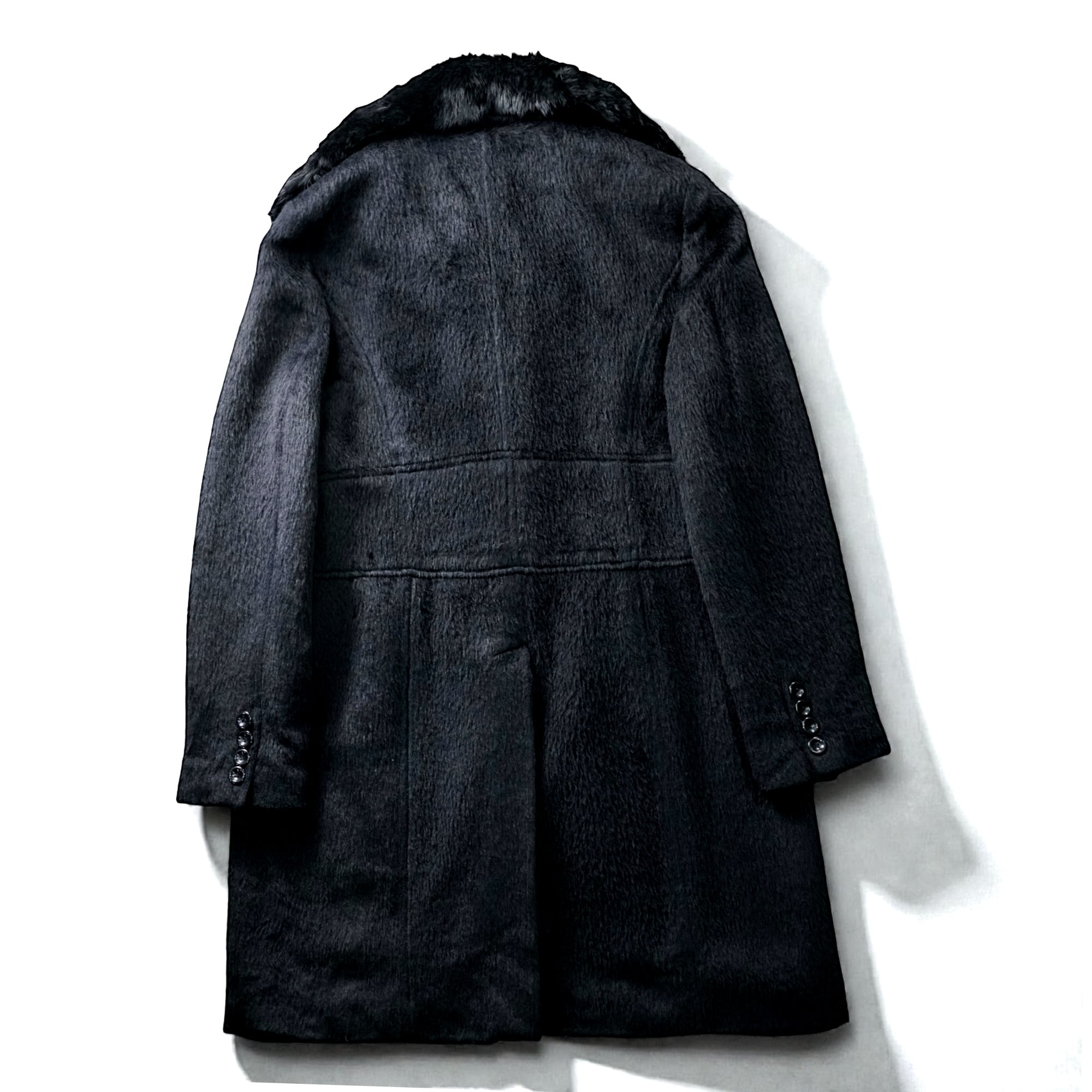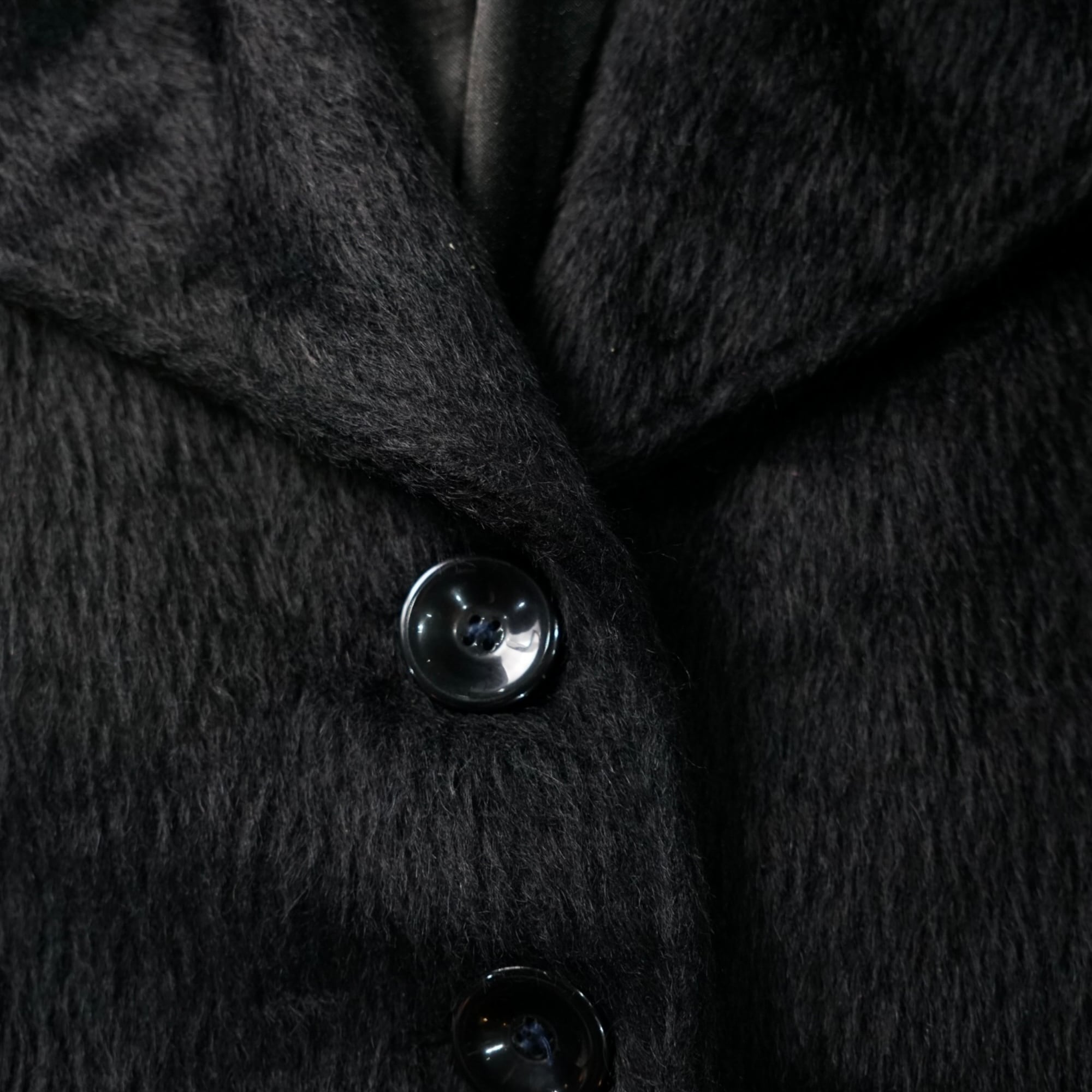 アルパカ特有の長く柔らかな毛足によるシャギー感が際立ち、深みのあるブラックカラーと相まって、非常にリュクスな佇まいを見せる一着です。