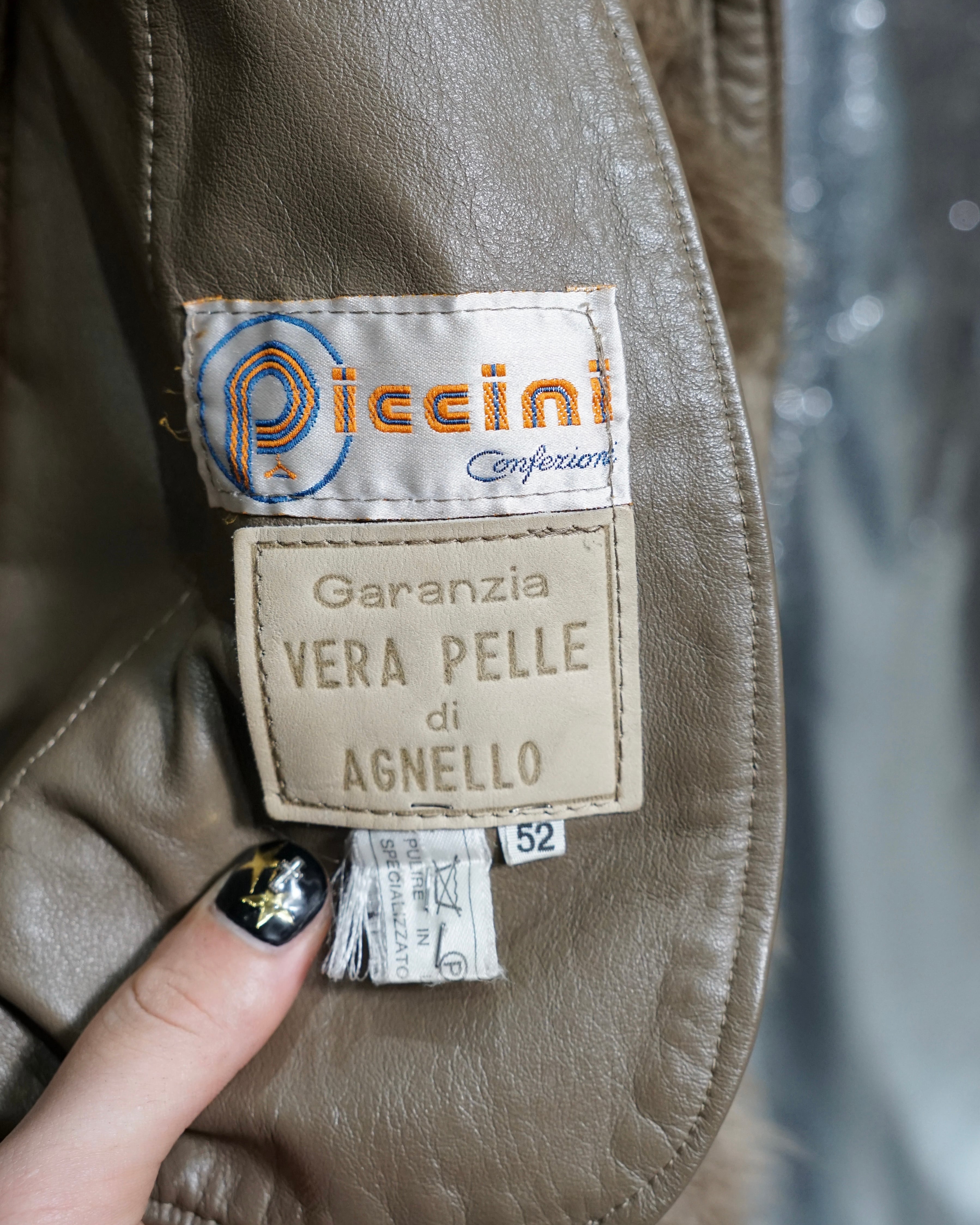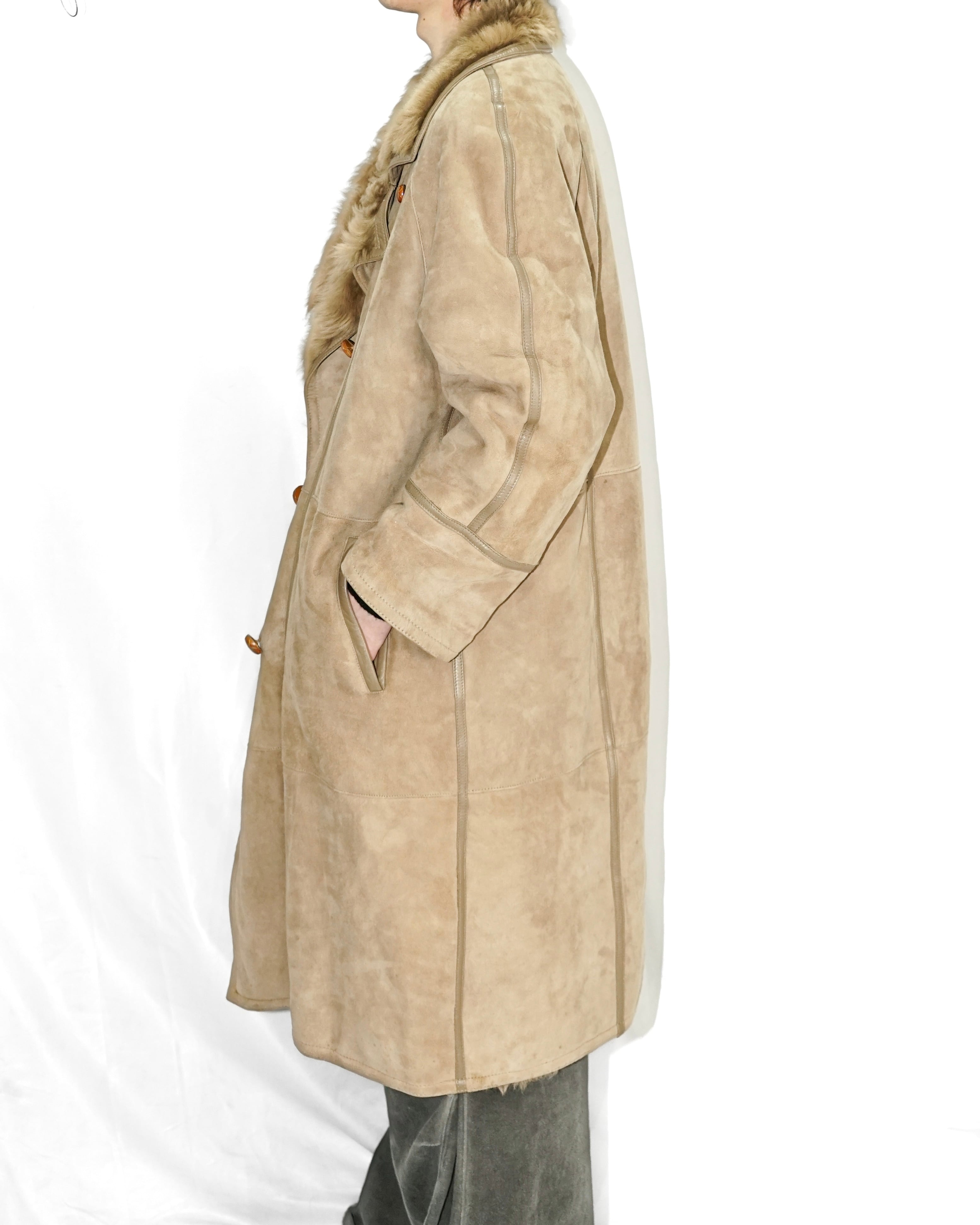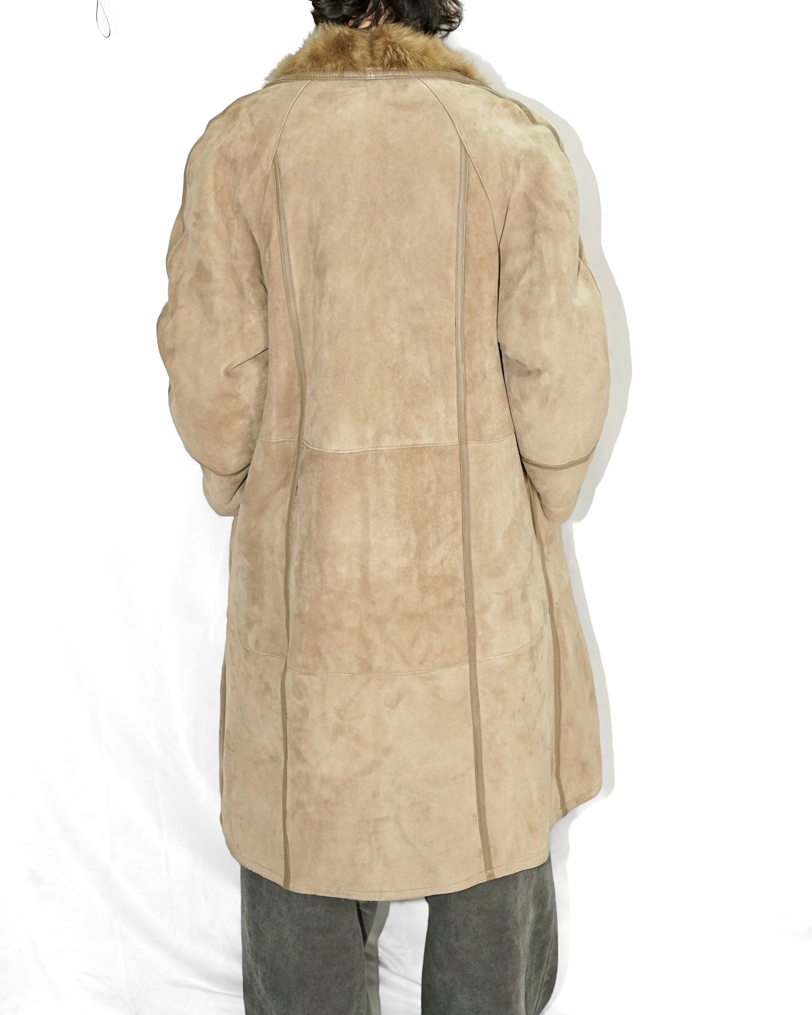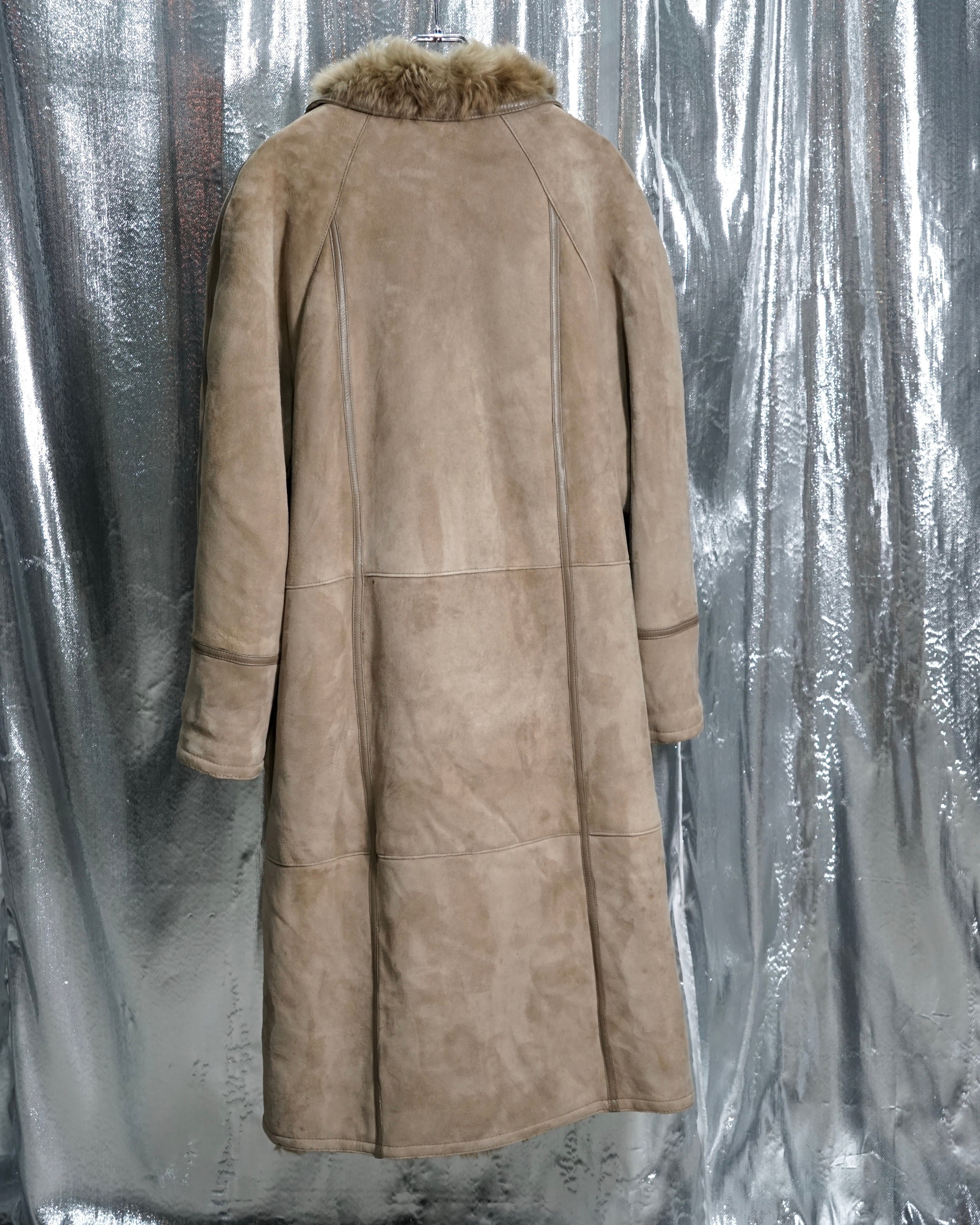 しっかりとしたロング丈と重厚なレザーのトリム、そして裏地全面にあしらわれたファーライニングが、当時の高級アウターならではの贅沢な仕立てを物語ります。