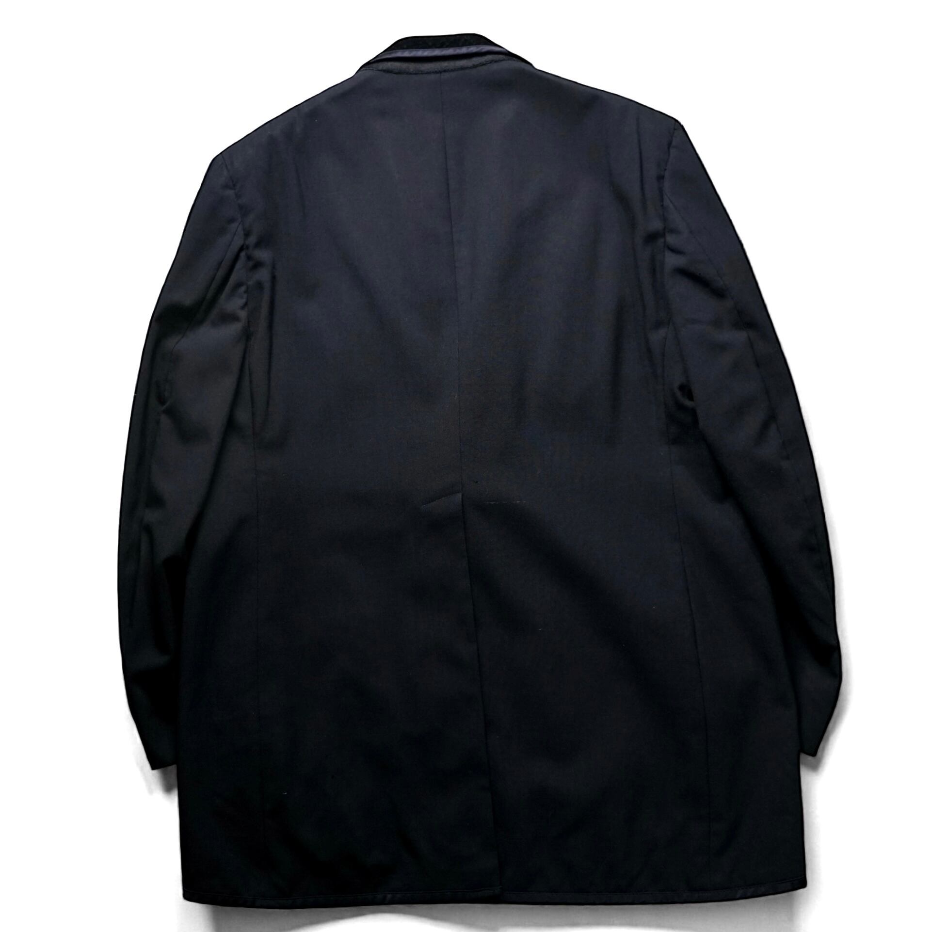 深いブラックのボディに、光を柔らかく吸うベルベットのショールカラーが映える一着です。