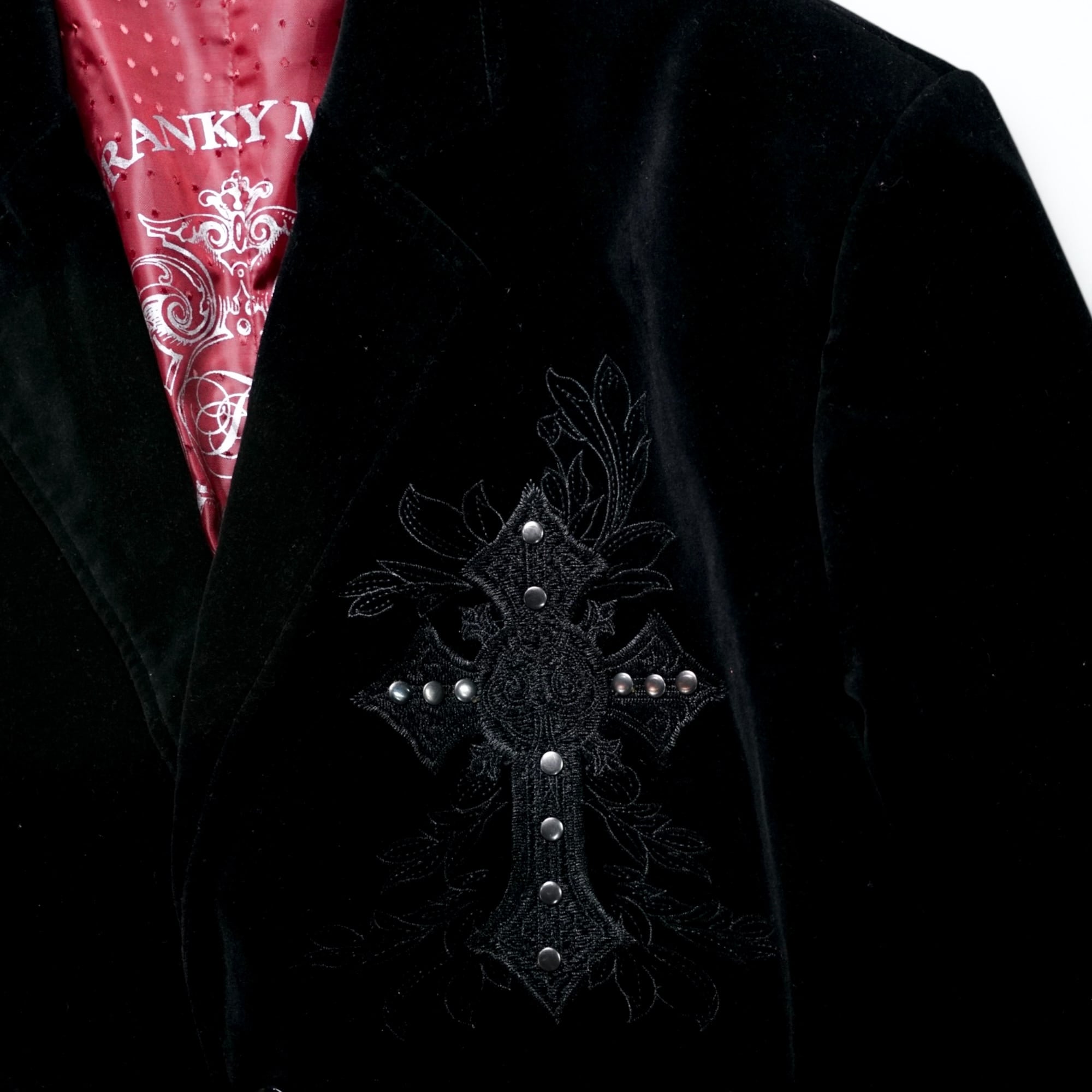 クラシックなテーラードのシルエットながら、装飾性の高いクロスモチーフが視線を奪い、スタイリングの主役として強いインパクトを与えてくれます。裏地には赤の総柄ライニングを使用し、脱いだ際にもスタイルが完結するドラマティックな仕上がり。