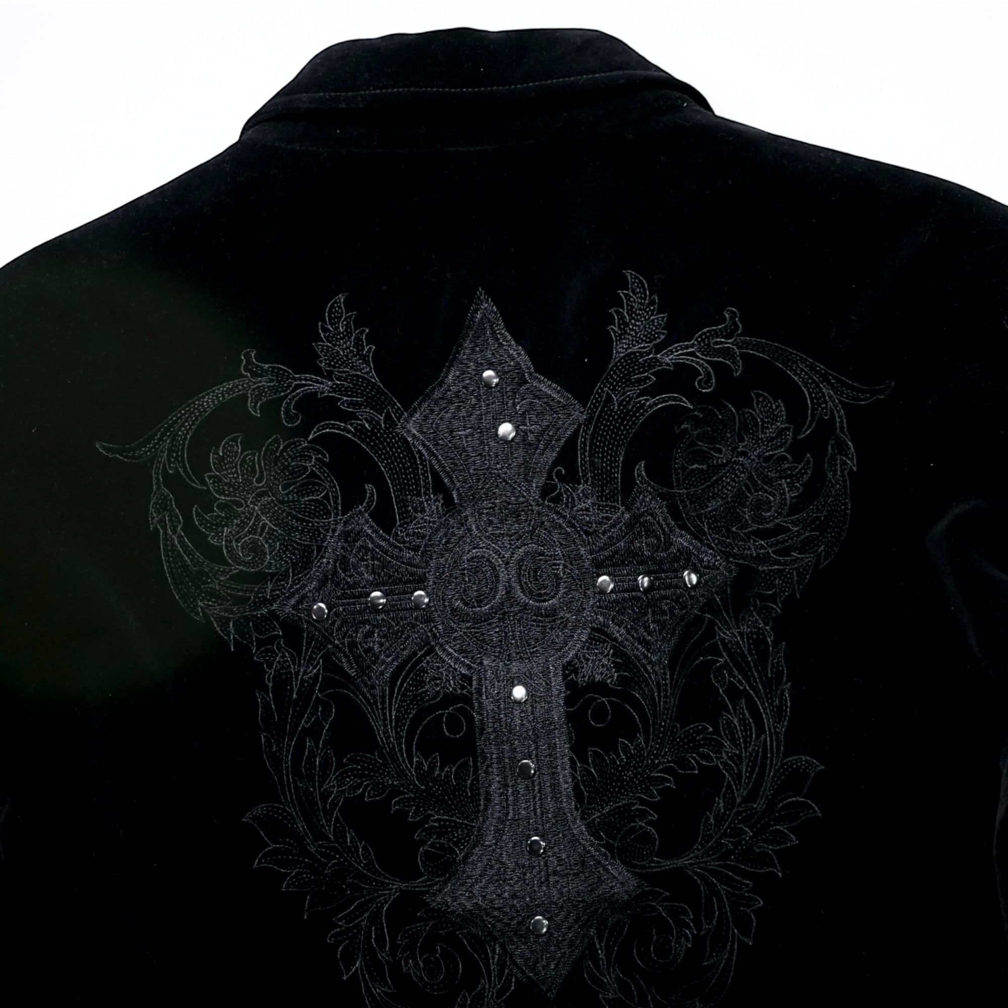 重厚感のあるベルベット生地をベースに、フロントとバックへ大胆に施されたクロス刺繍が存在感を放つ一着。