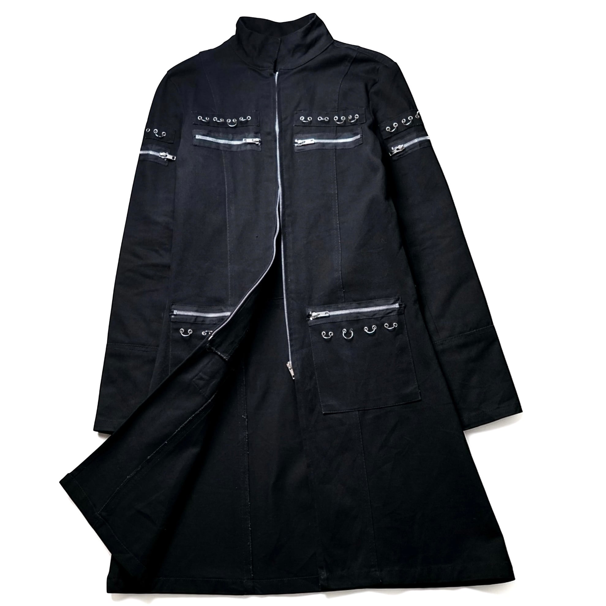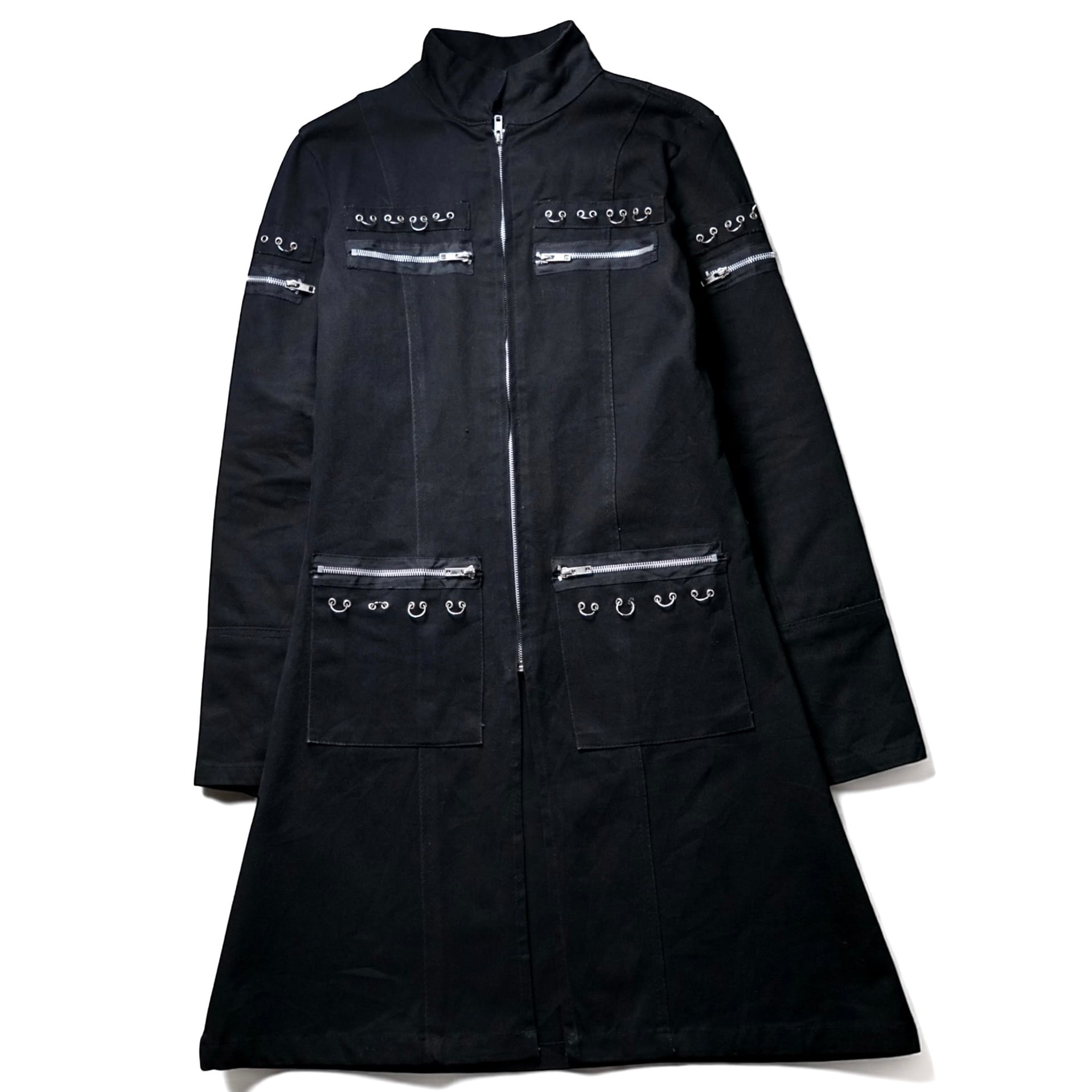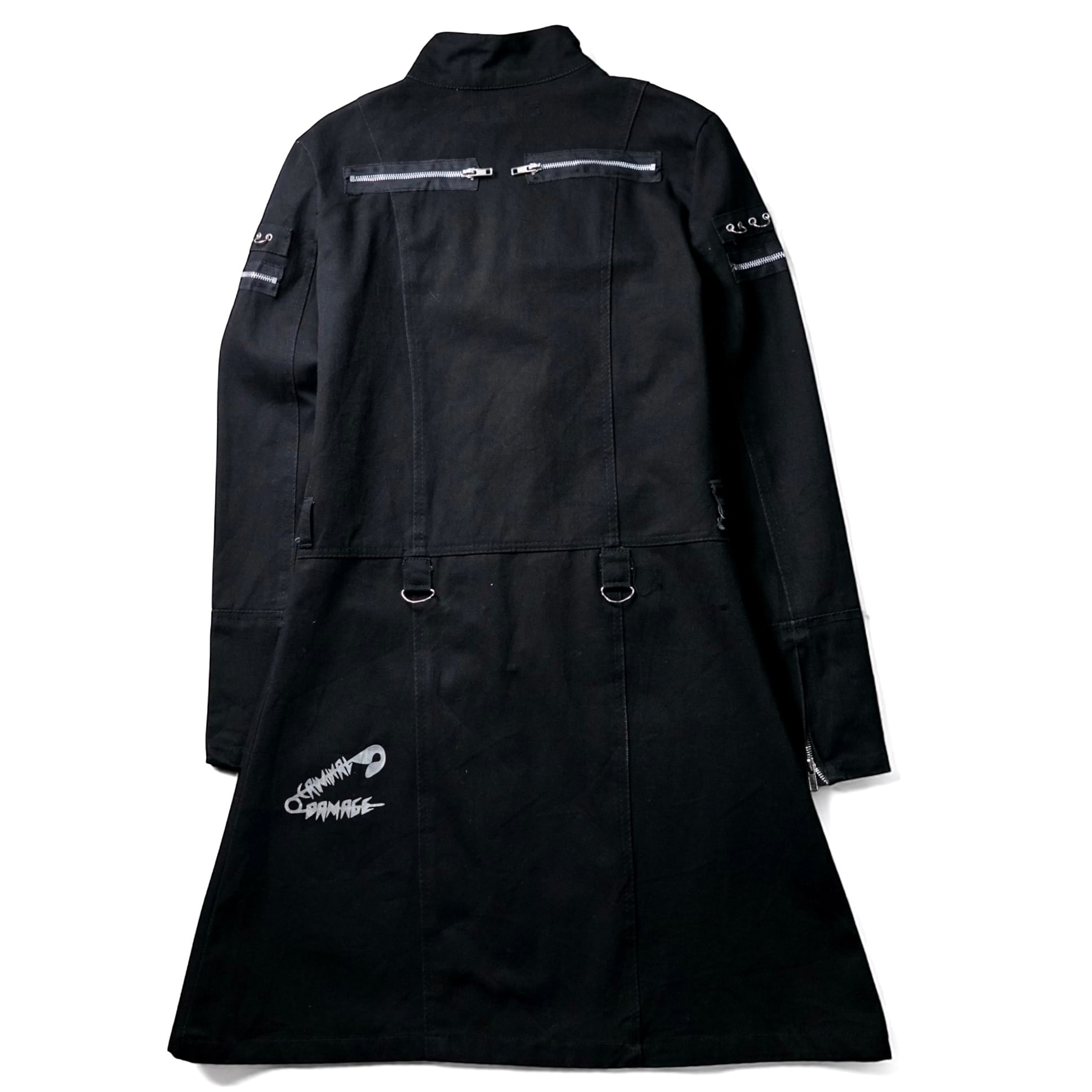 Early 2000sのストリート × パンクムードを色濃く残す "Criminal Damage" のヴィンテージ・ボンデージデザインZIPロングコート。