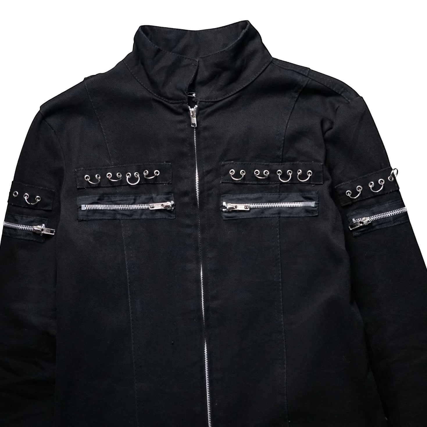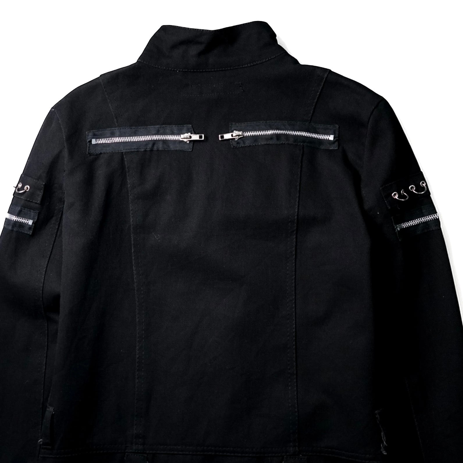 全面を走る複数のジップラインと、胸・腕・腰に配置されたメタルアイレット × フックパーツが象徴的。
