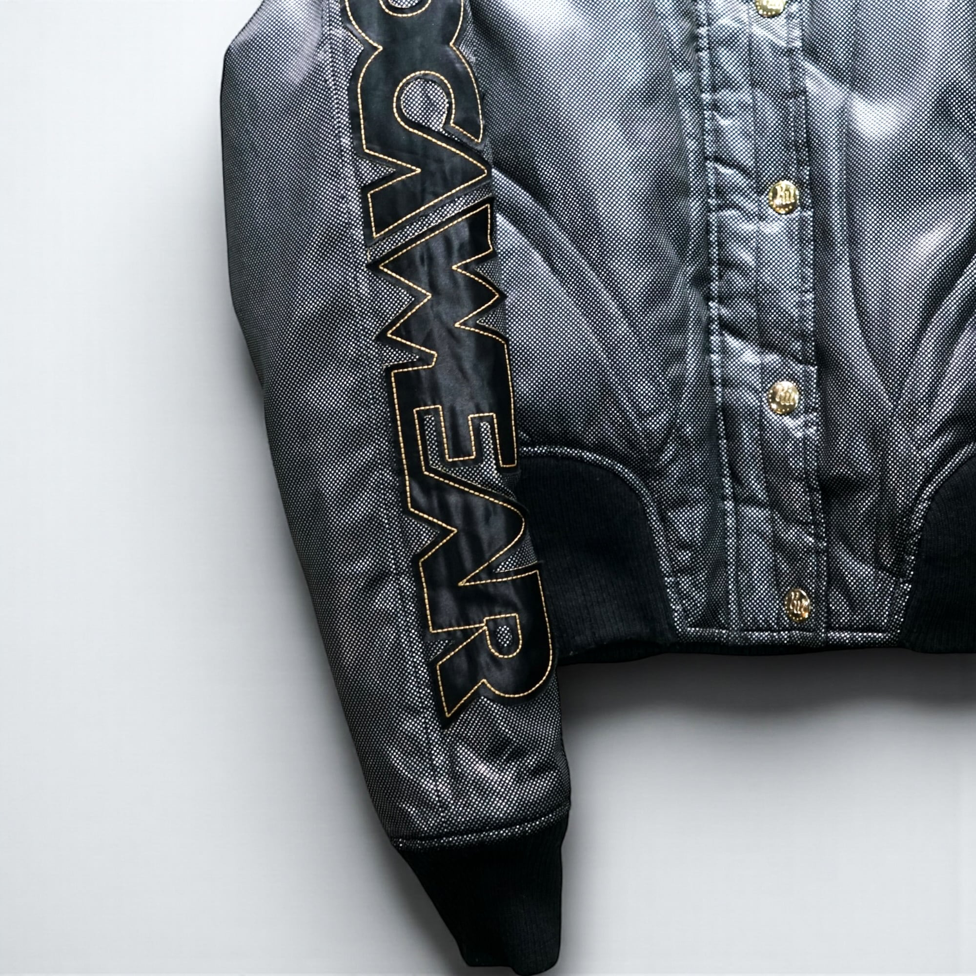 フロントのゴールドボタン&ロゴ刺繍、アームいっぱいに走る 立体刺繍のブランドネーム はロカウェアの名作アウターならではのディテール。