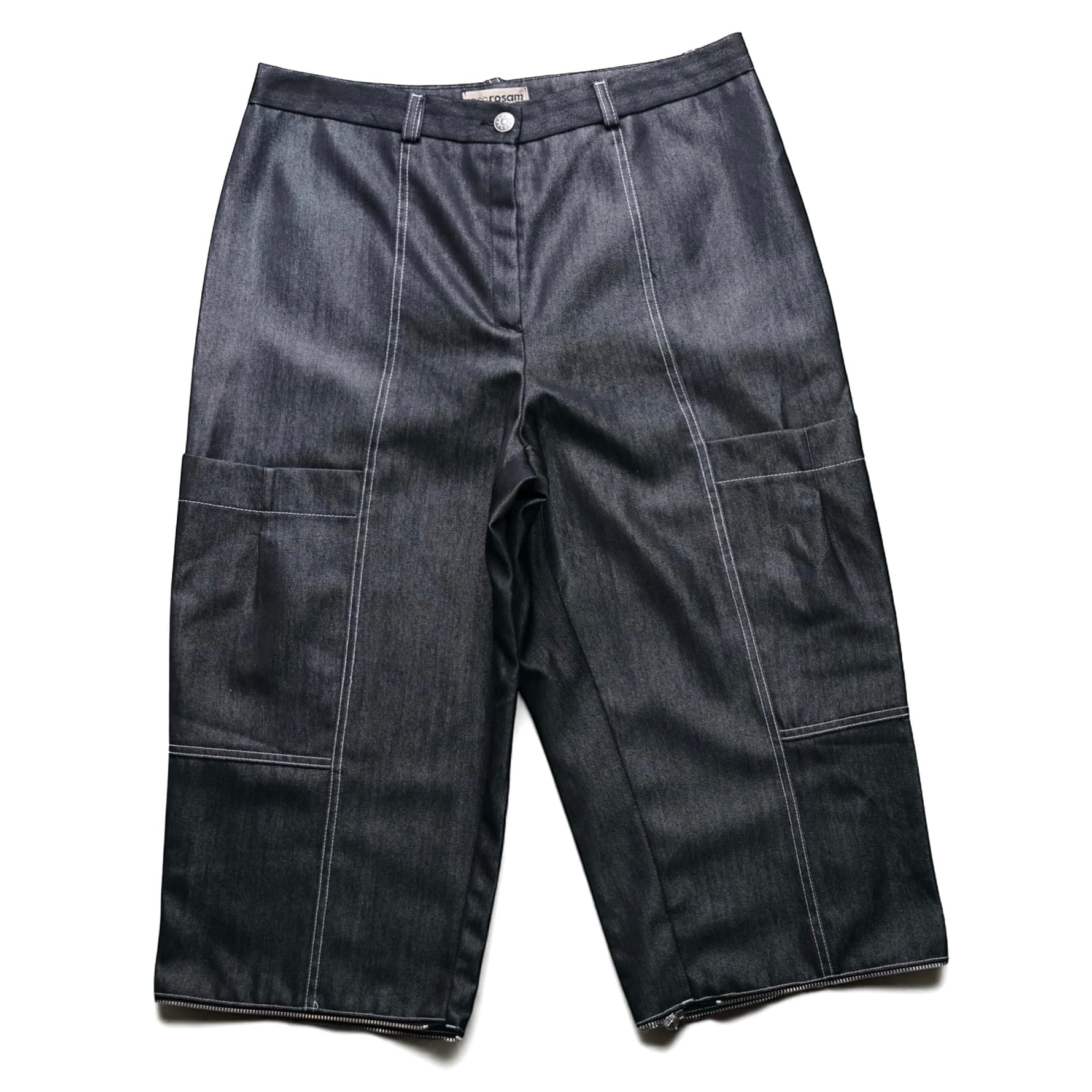 フランスのレディースブランド**rosarosam(ロザロザム)**による、コーティングデニム × 立体ギミック × 3way 機能が組み合わさった希少なヴィンテージパンツ。
