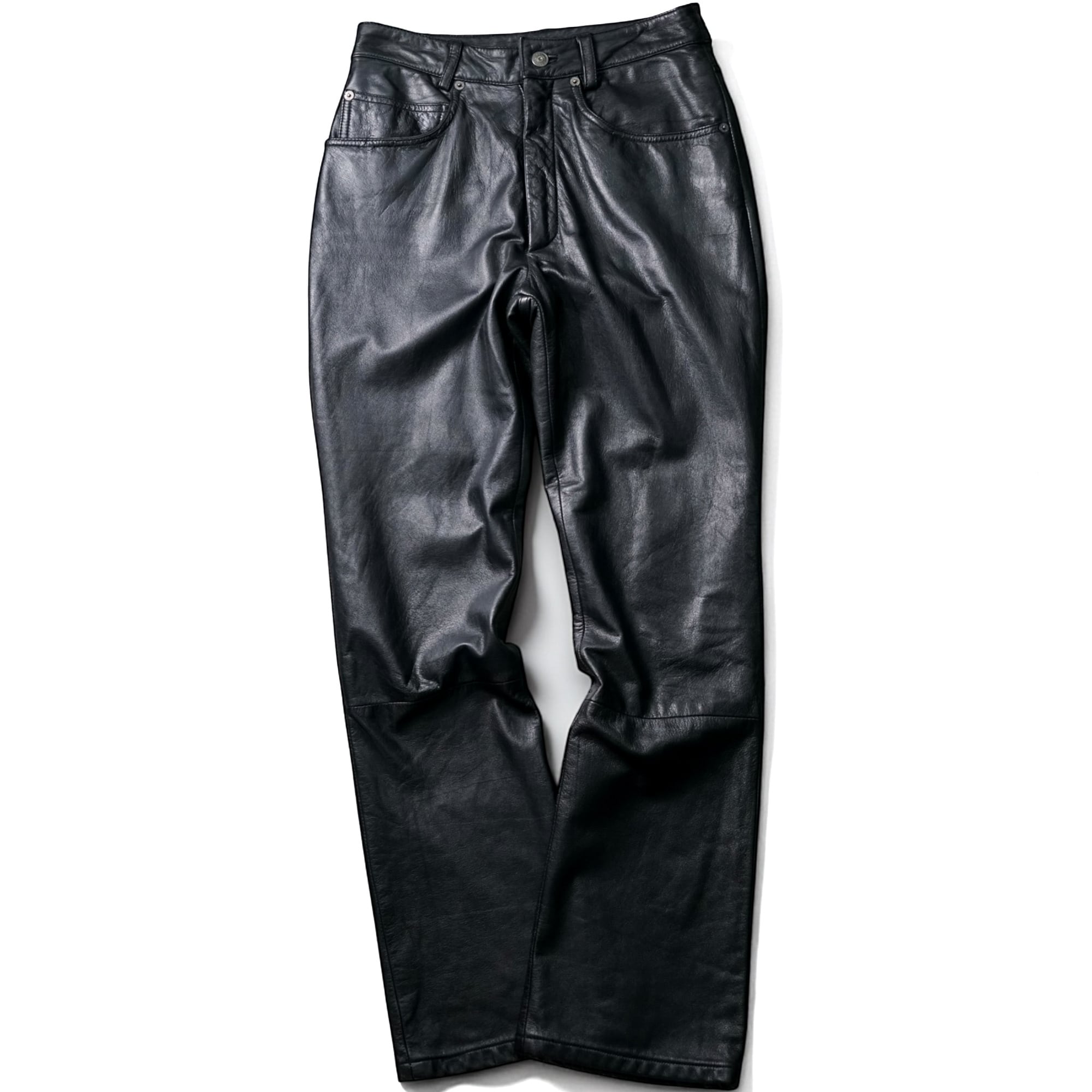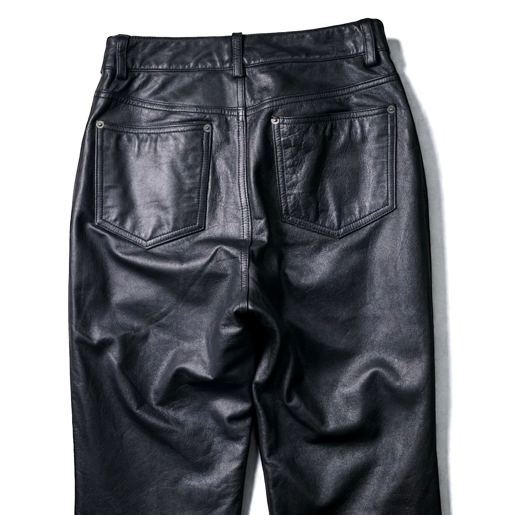 フロントの5ポケット仕様はデニムのようなカジュアルさを残しつつ、ブラックレザーが纏うモード感・重心の強さをしっかり引き立てる絶妙なデザイン。