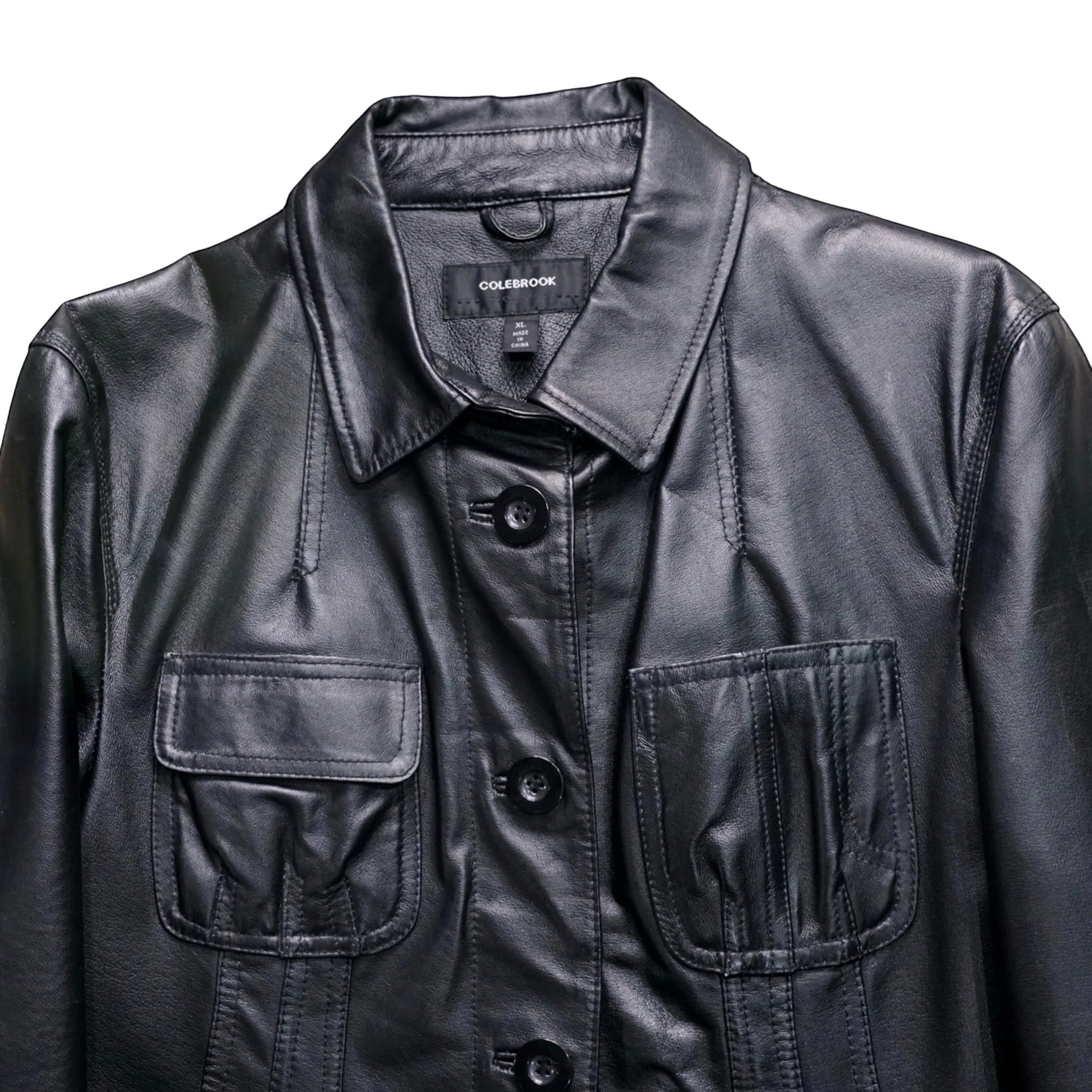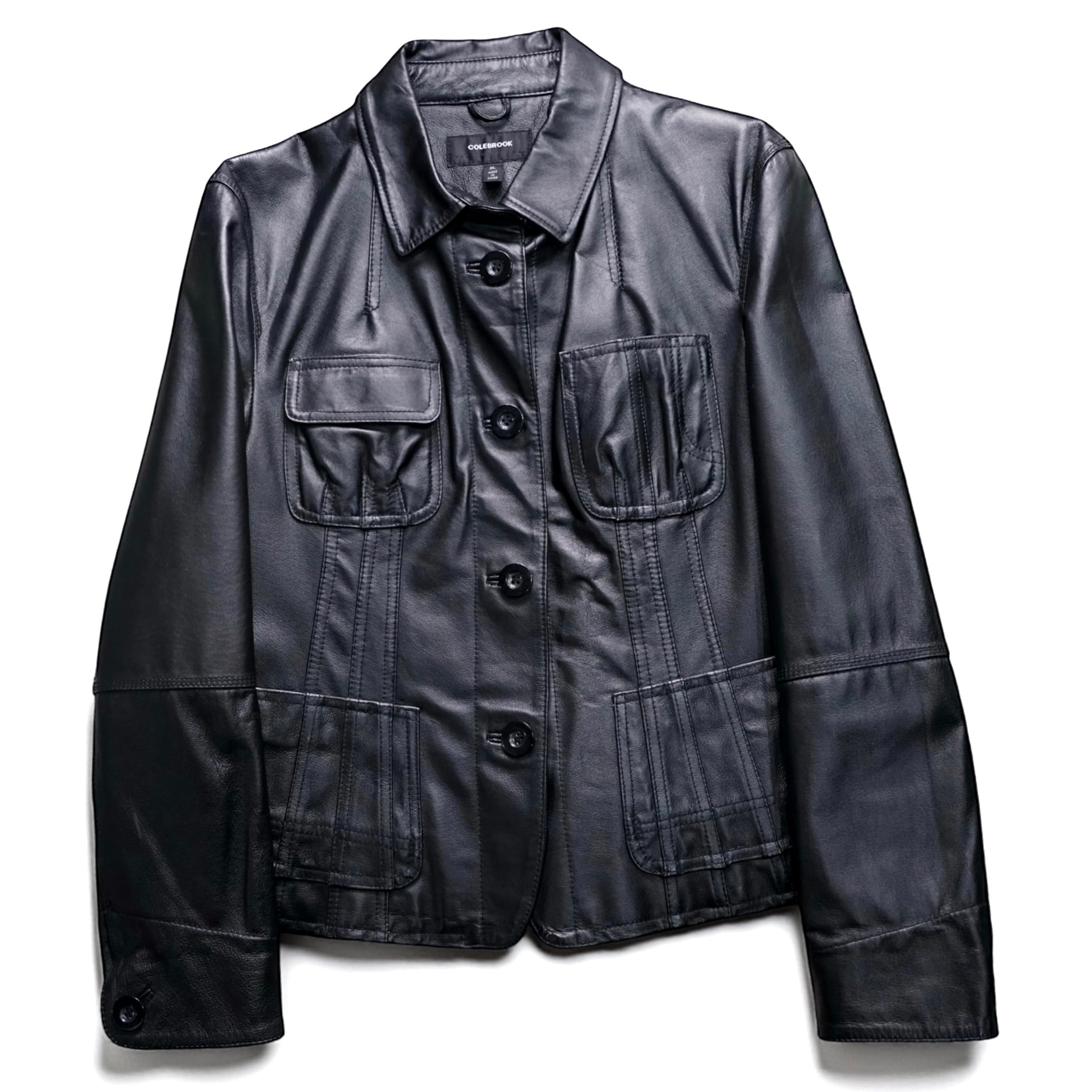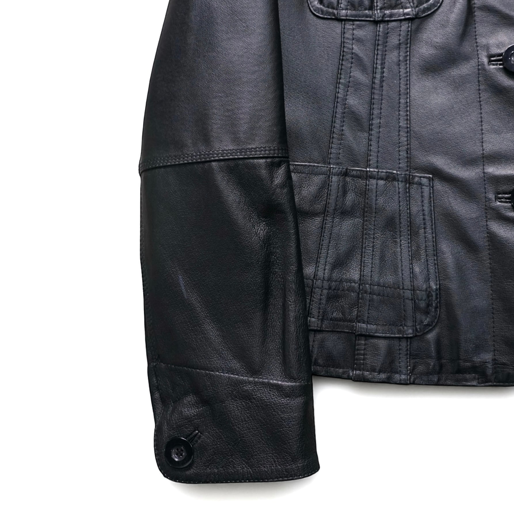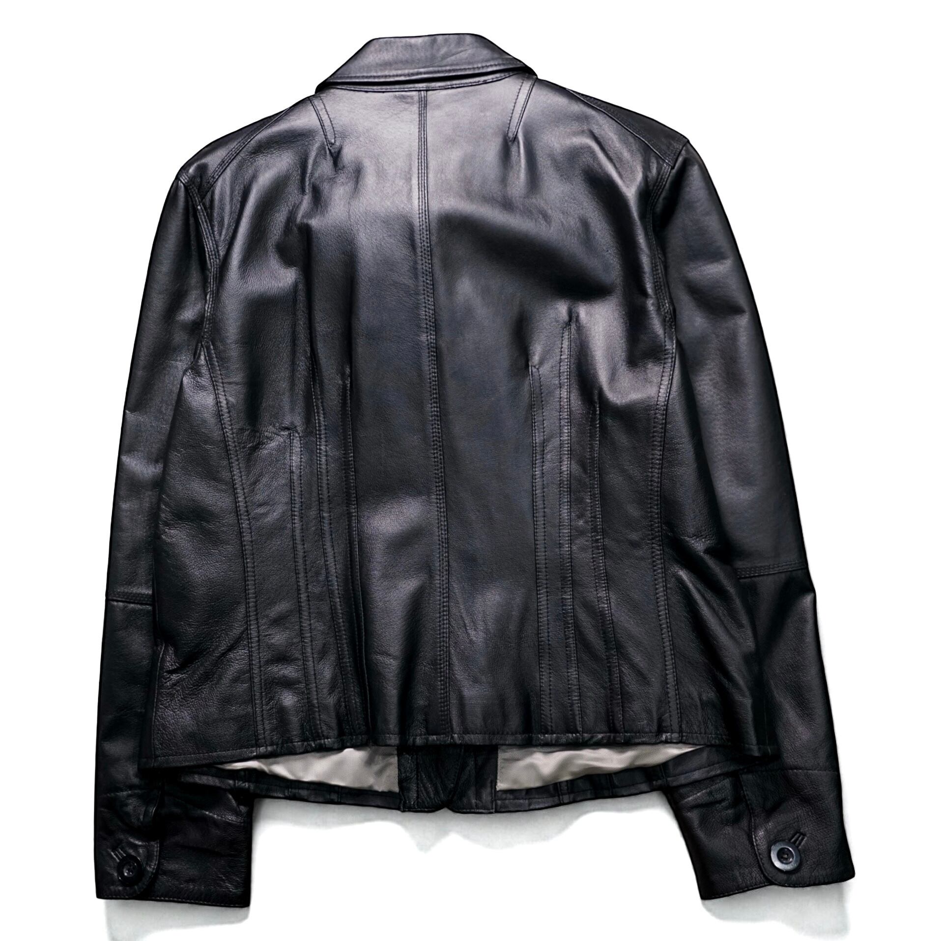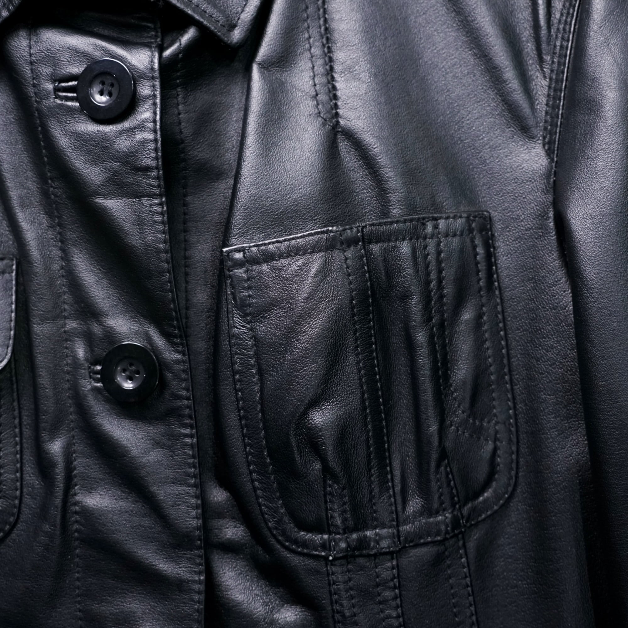 ステッチワークや切り替えによって自然な陰影が生まれ、ブラックレザー特有の奥行きある表情が引き立っています。