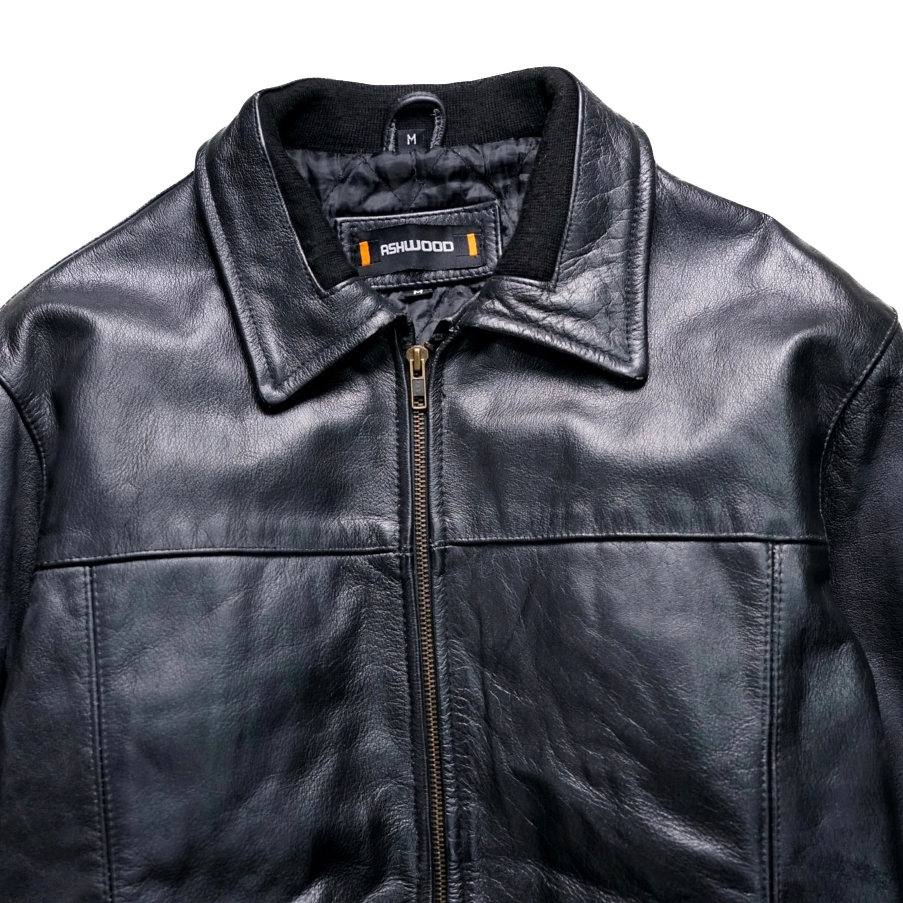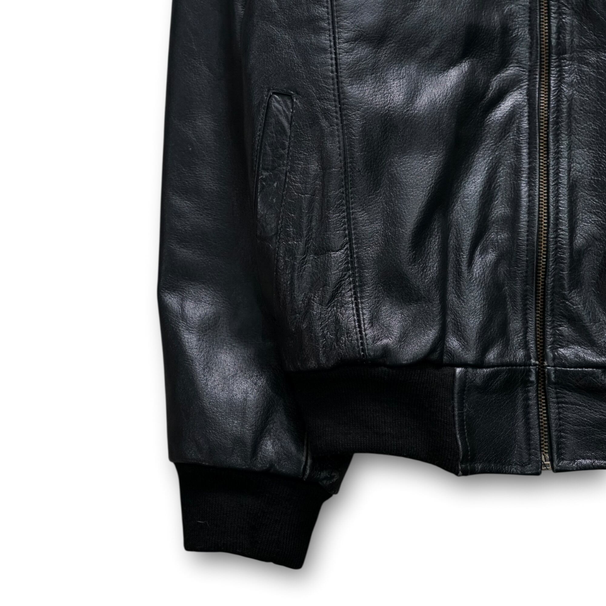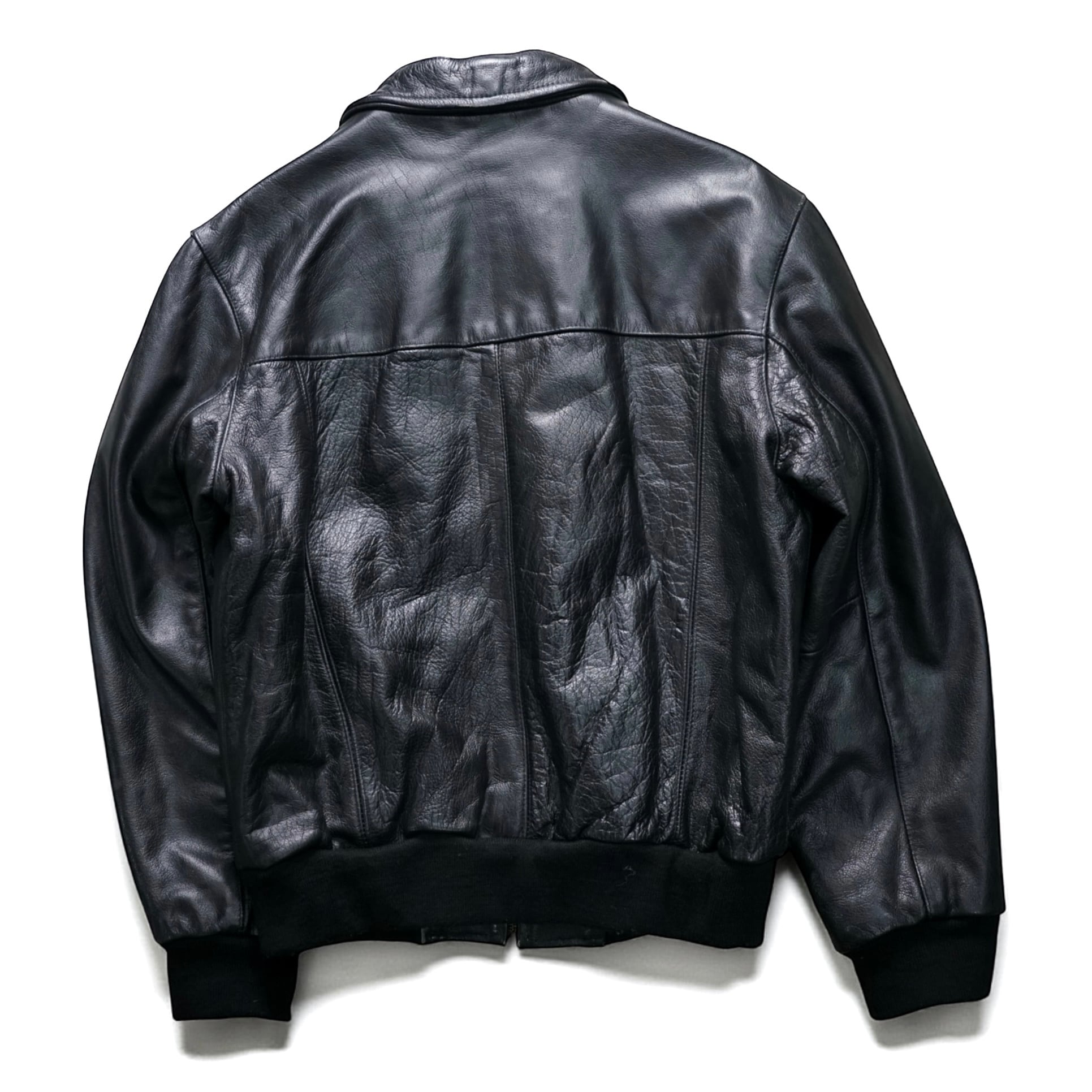 ショート丈 × リブ仕様によりバランス良く着られ、現行にはない80–90’s特有の深い艶とシワ感が魅力です。