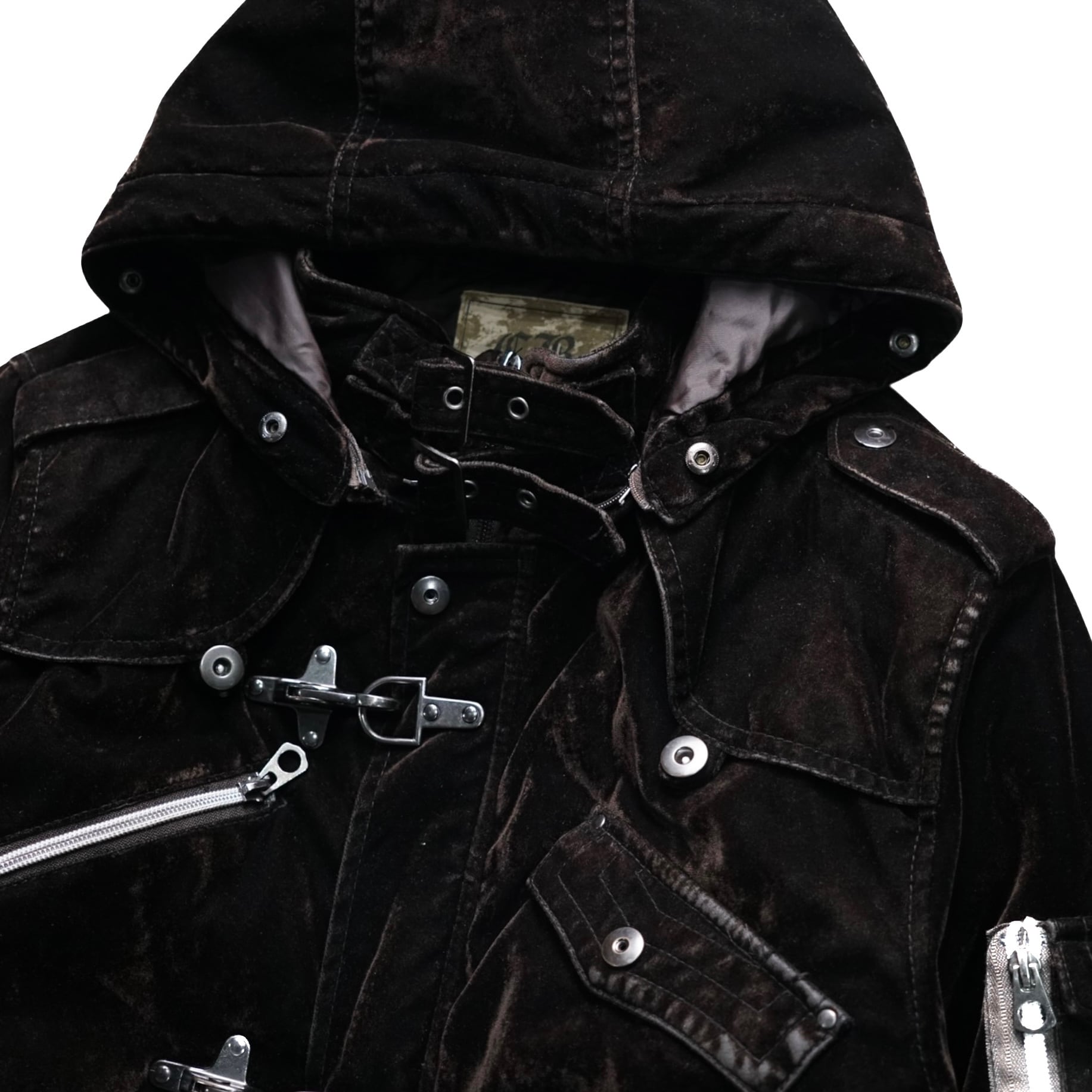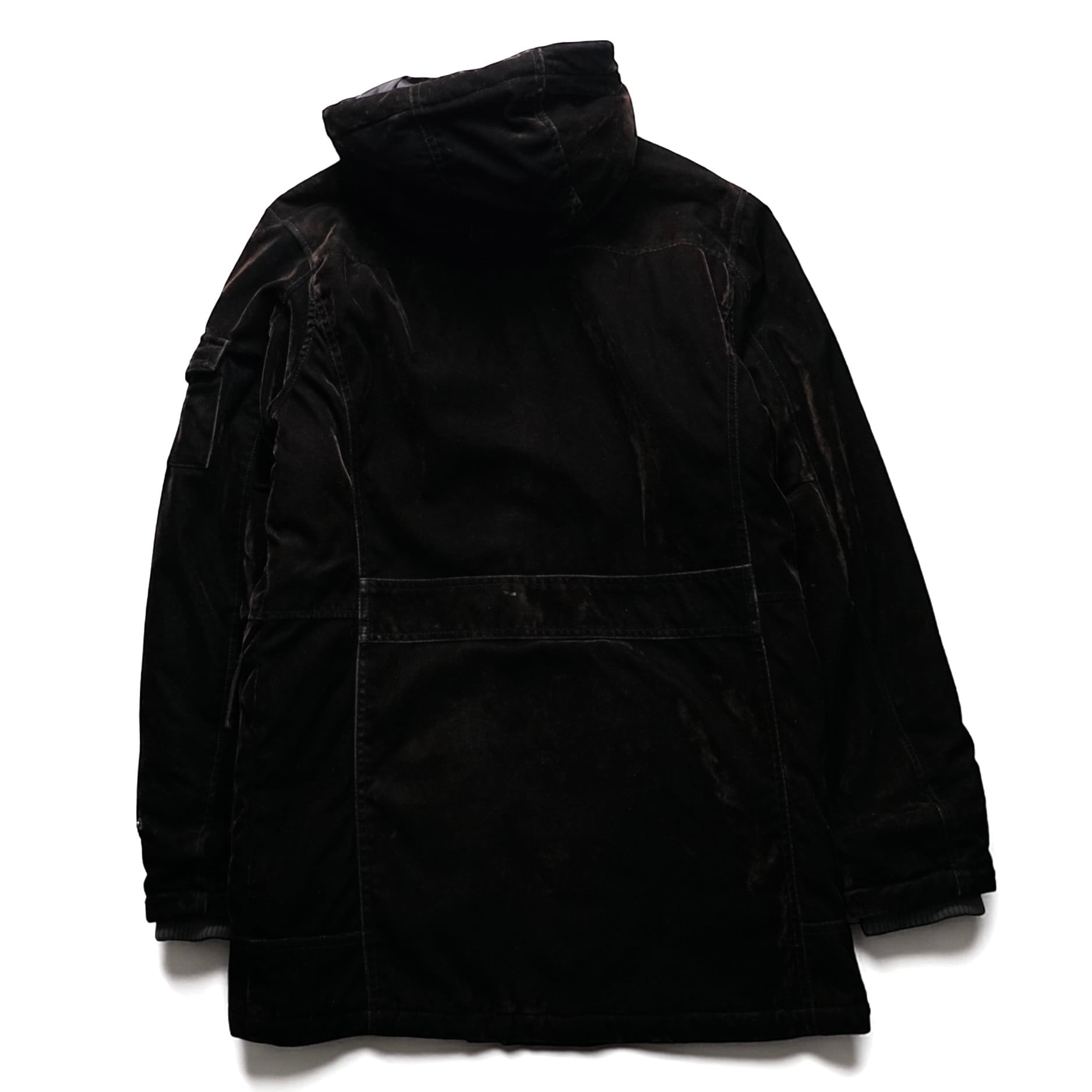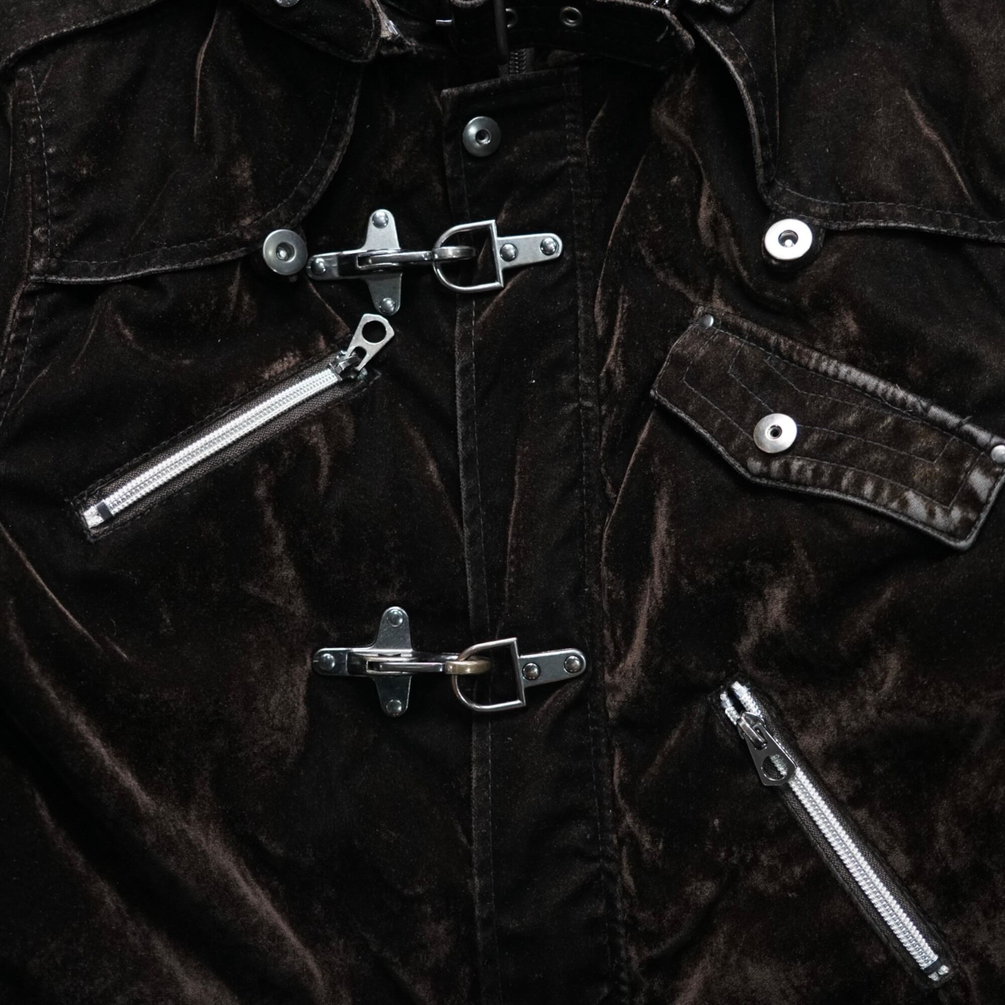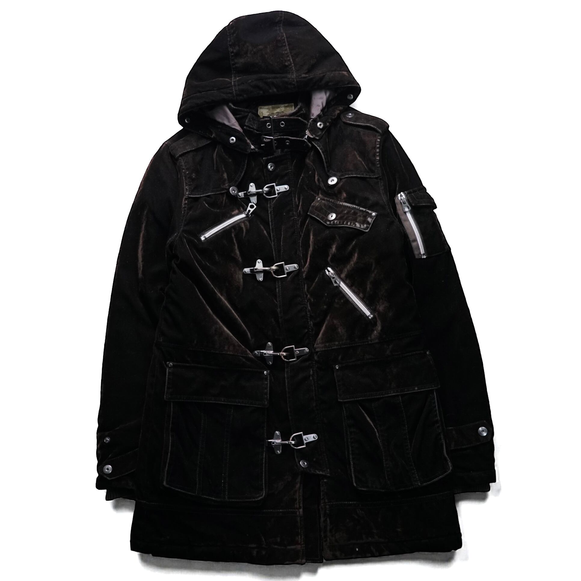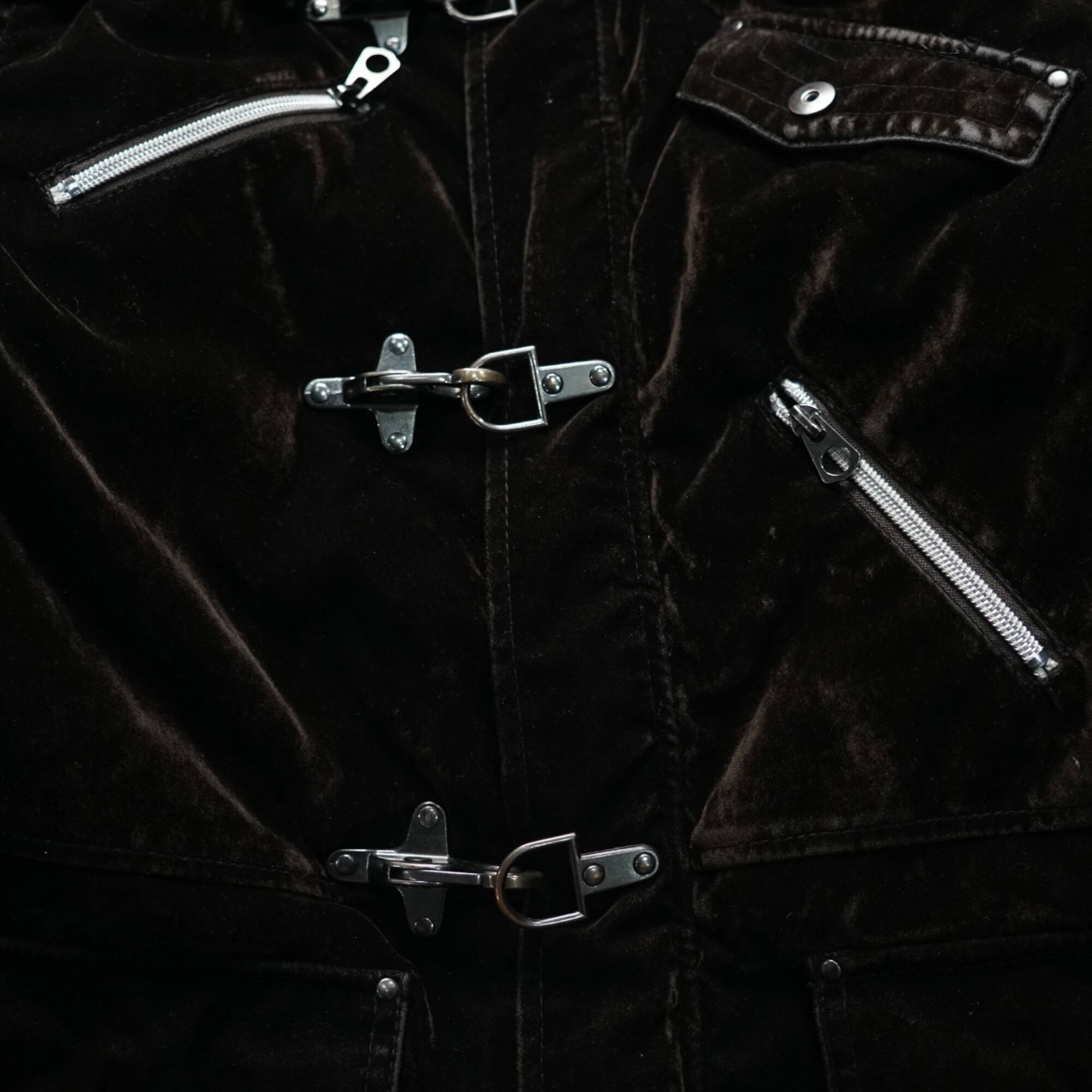 限りなくブラックに近いような深みのあるダークブラウンのベルベットにファイヤーマンバックルとメタルジップを組み合わせた、ヴィンテージならではの重厚感とギア的ディテールが共存するハーフコート。
