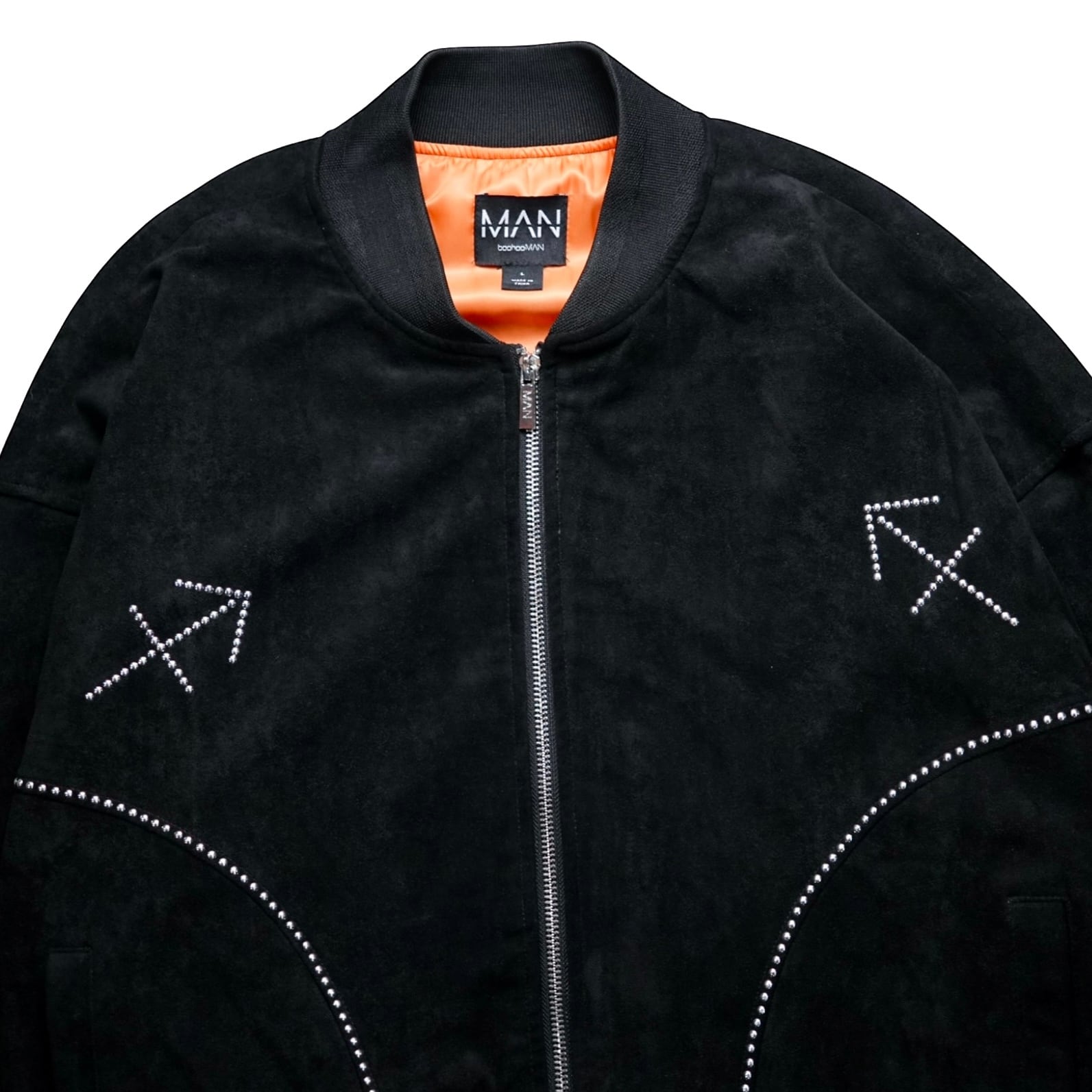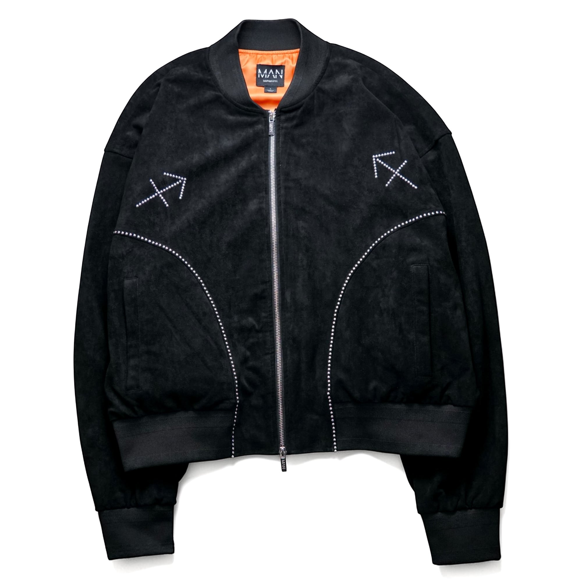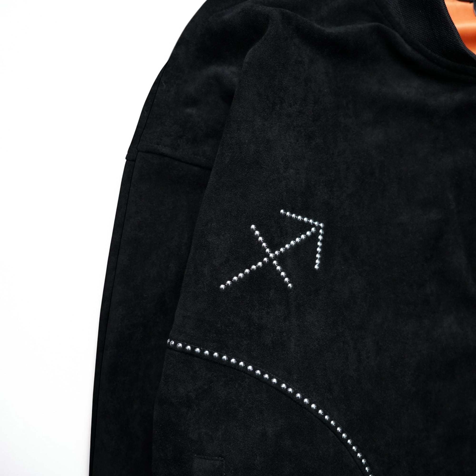 フロント〜バックにかけてふんだんに散りばめられたラインストーン装飾が目を奪う、ダブルジップボンバージャケット。