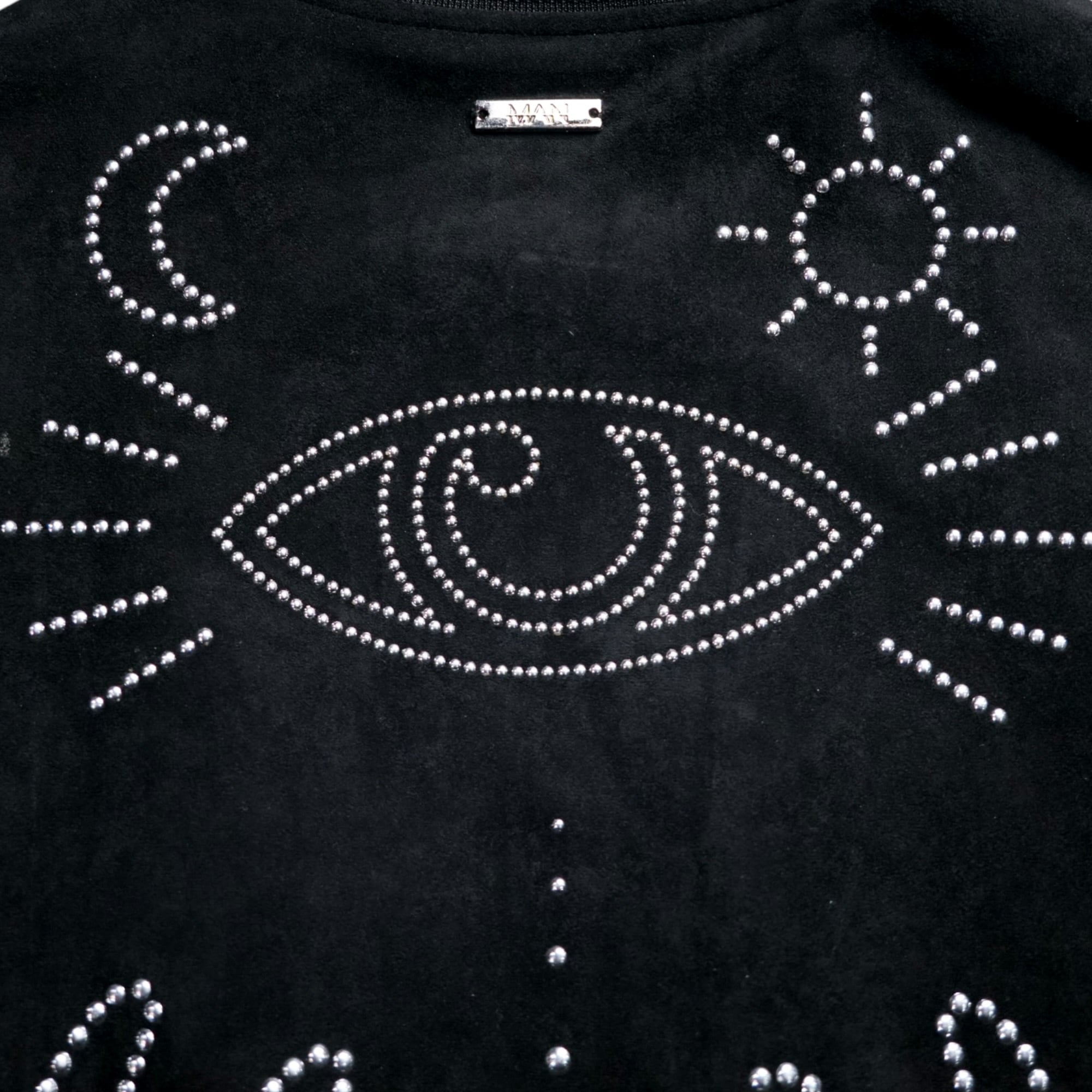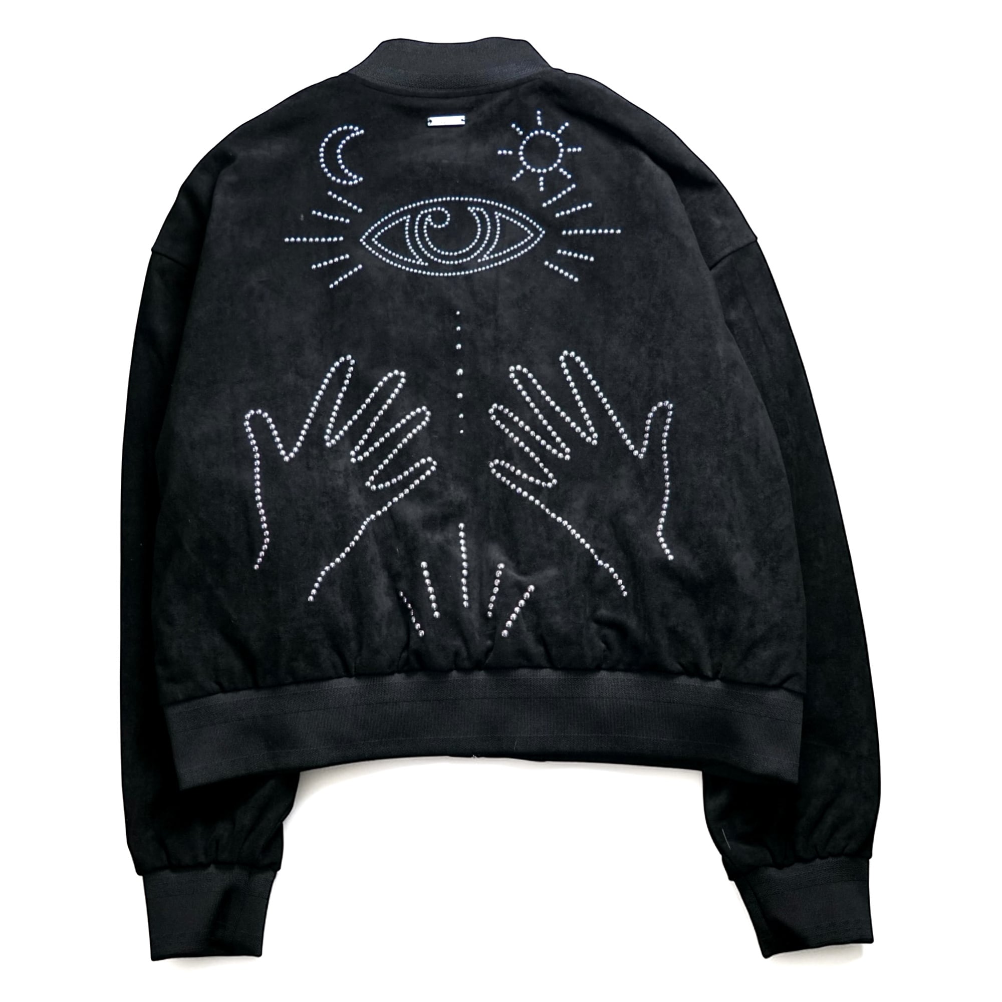 マットなブラックスエード調の生地と、ドット状に配されたシルバーラインストーンのコントラストが強く、夜間の光やスタジオ照明の下で一層表情を変える、舞台衣装のような存在感。