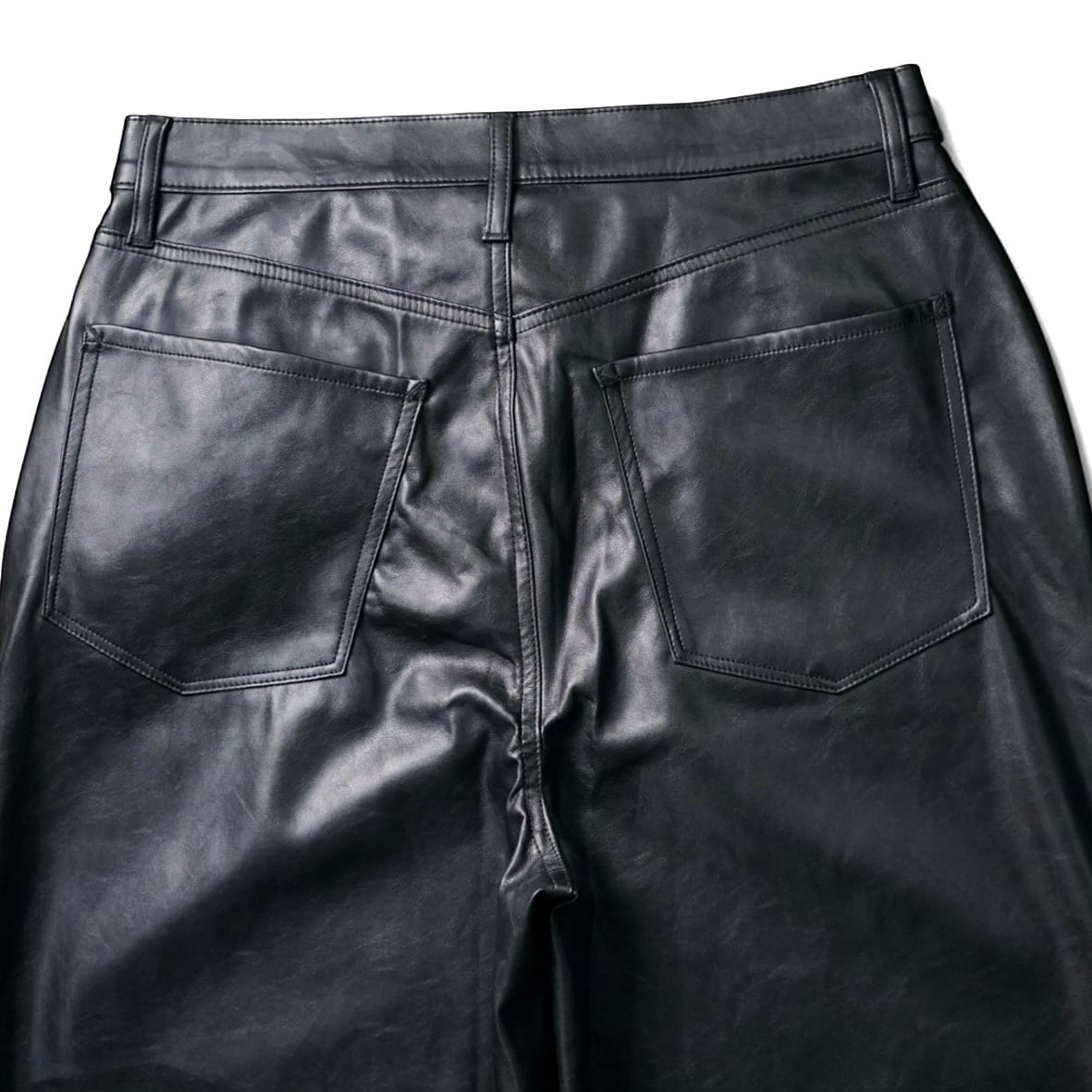 レザー特有の重さを感じさせない軽快な穿き心地で、センタープレスのように落ちる自然なドレープが、モードな迫力と抜け感を同時に生み出します。