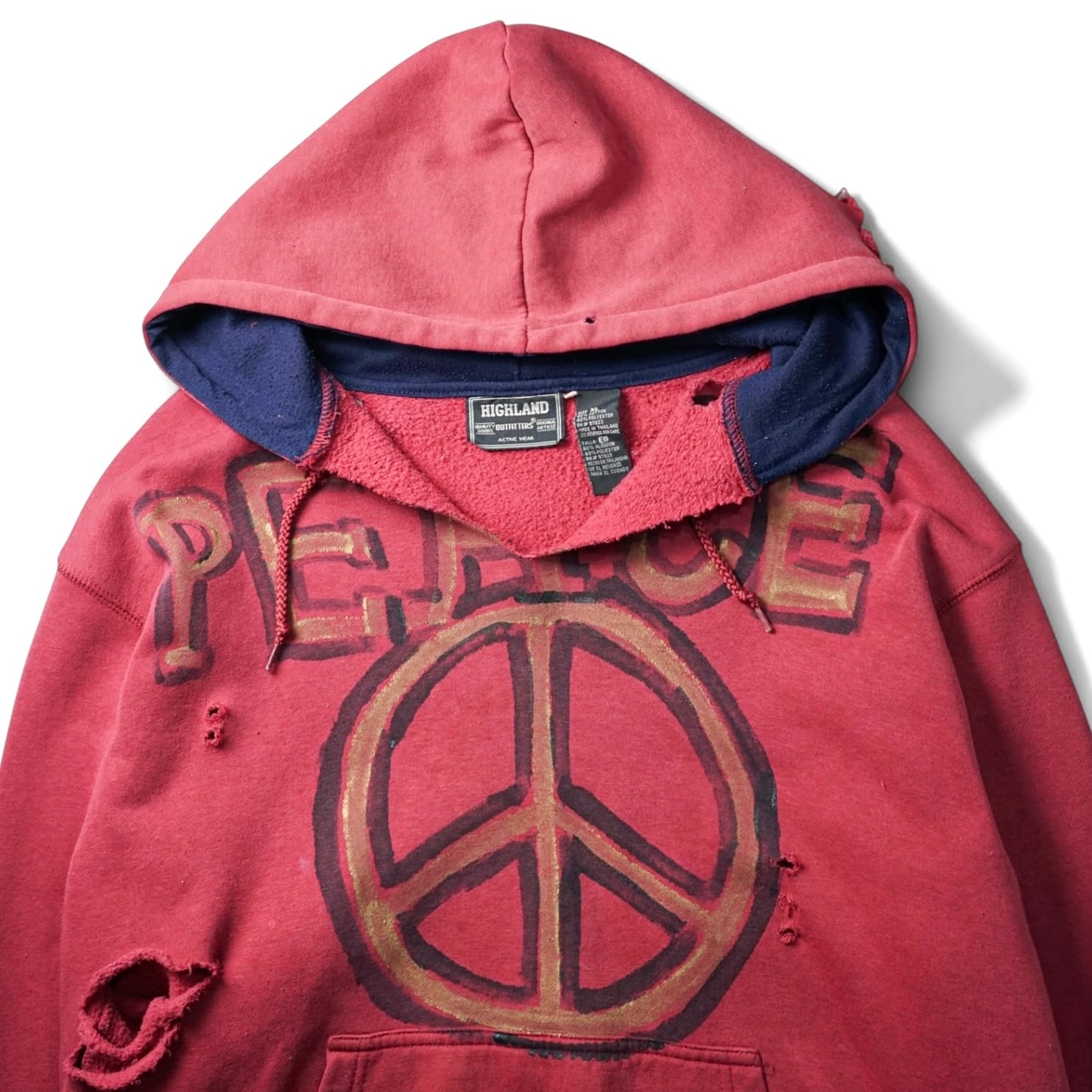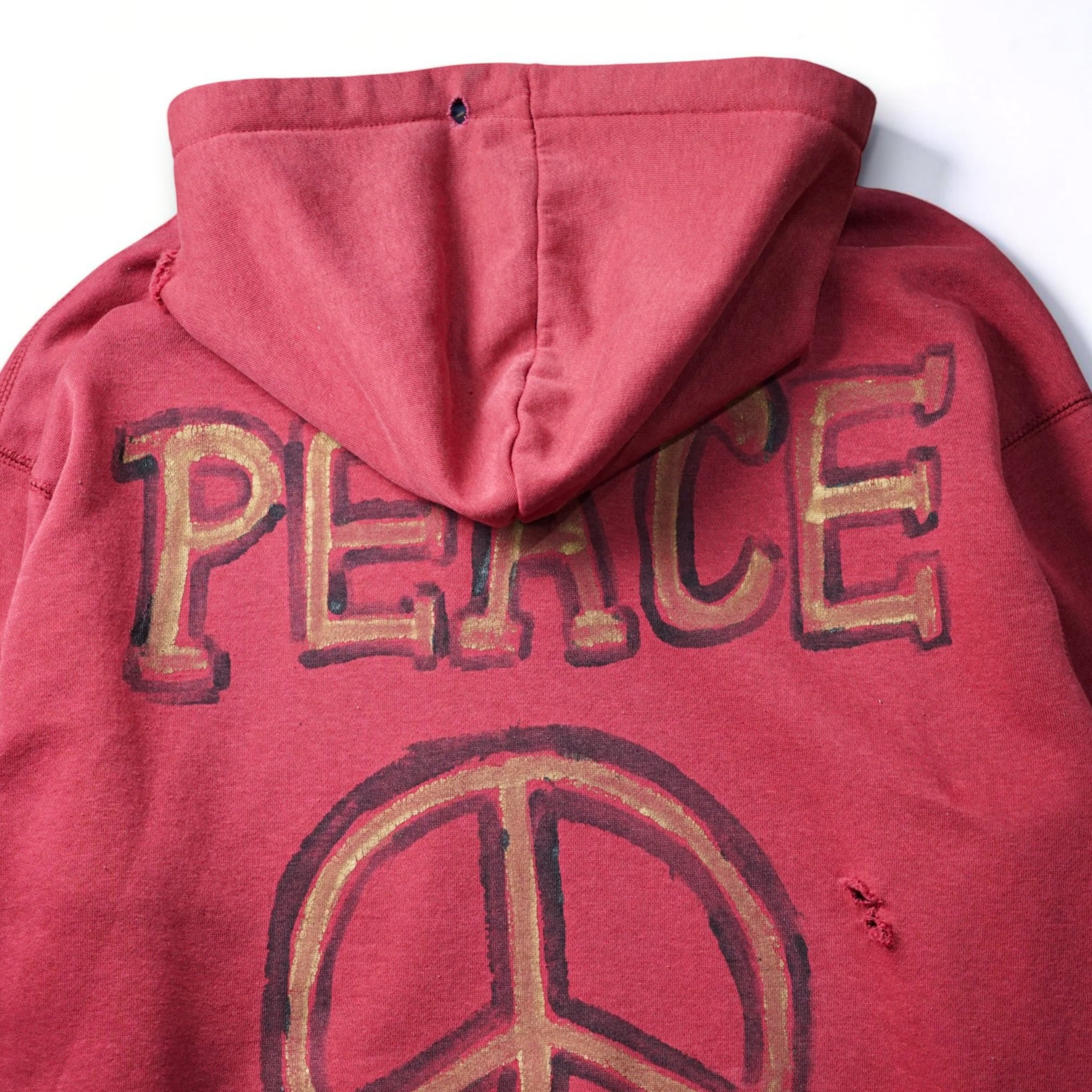 フェードしたレッドボディに大胆に描かれた PEACEロゴとピースマークが印象的なスウェットフーディ。