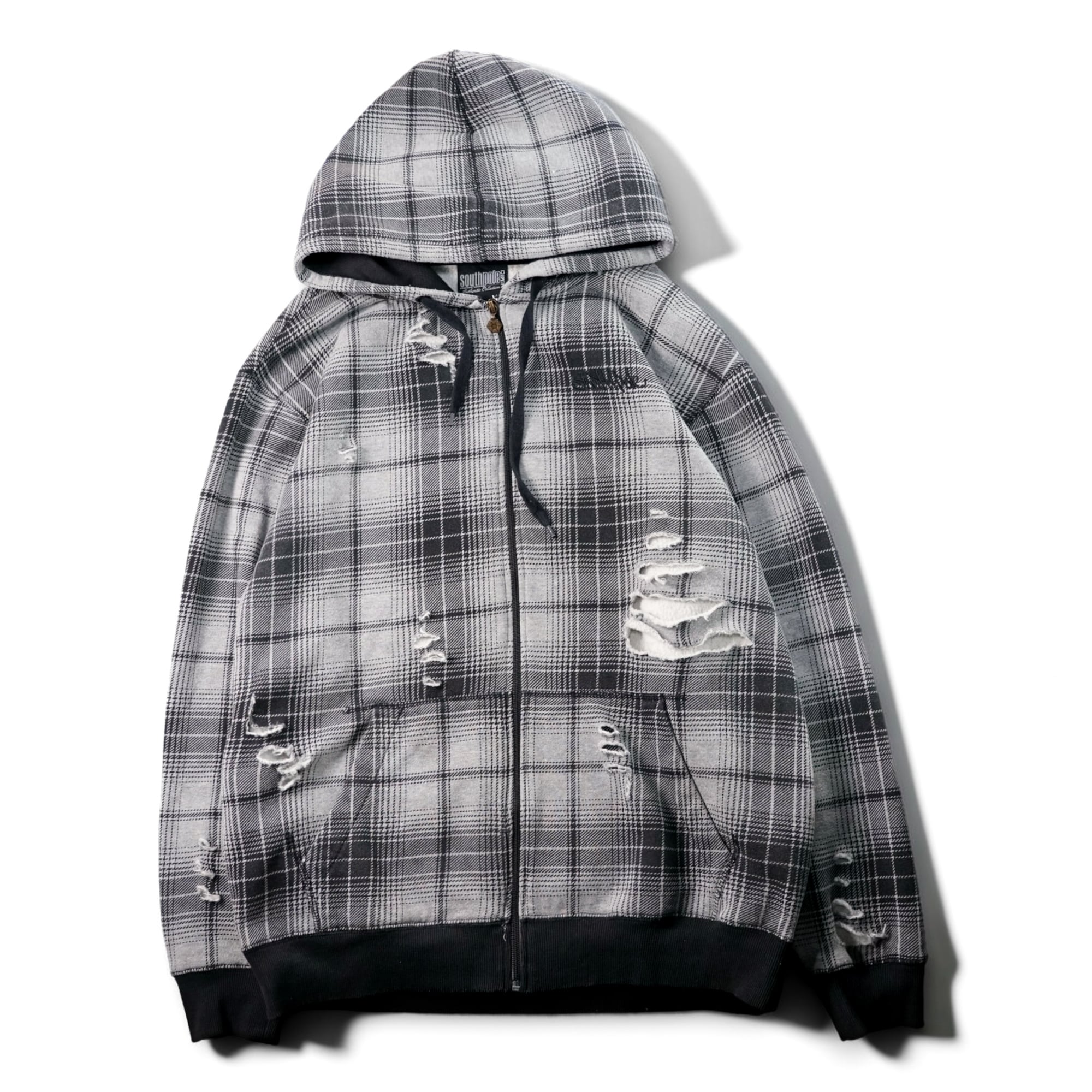 オンブレチェックパターンが印象的なジップアップフーディ。