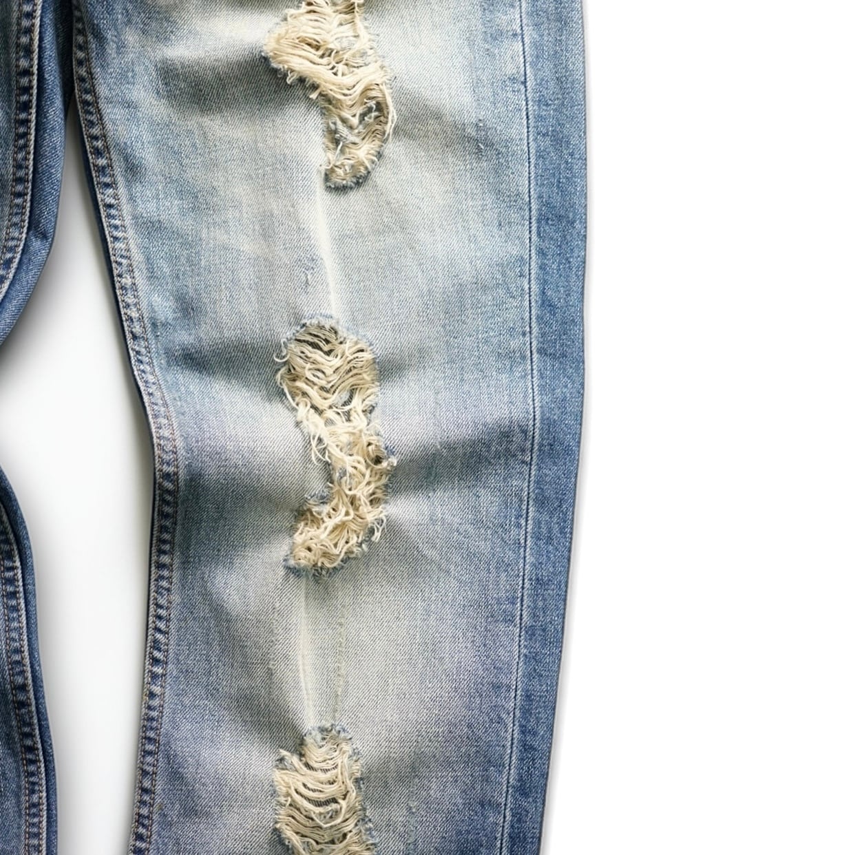 全体に広がる強いフェードと立体的な色落ちに加え、フロント・バックともにバランス良く配置されたクラッシュが無骨さと色気を同時に演出する一本。