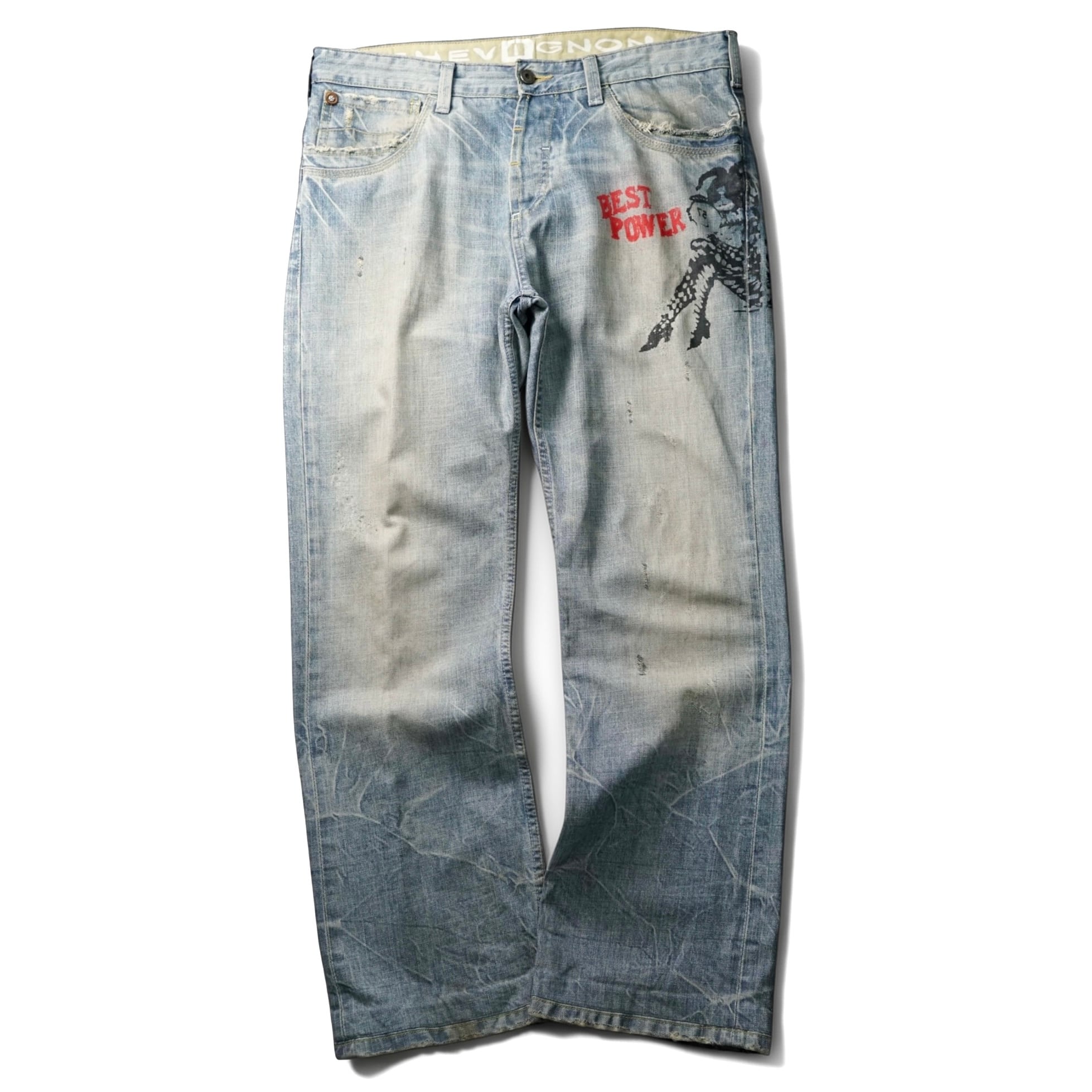 全体に走る強いフェードと、随所に入るグラフィックが印象的なヴィンテージデニム。