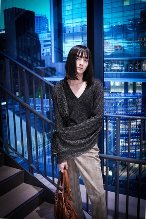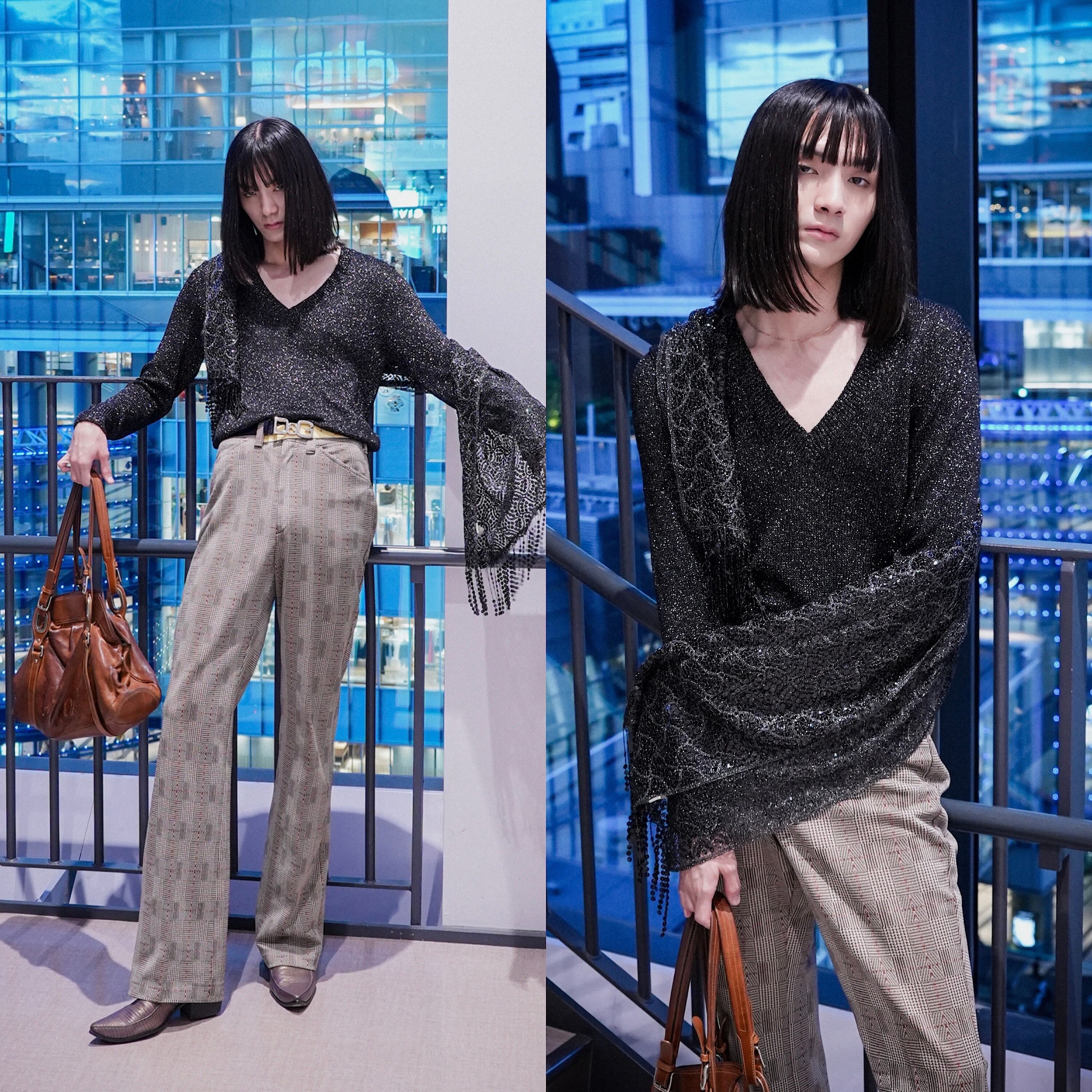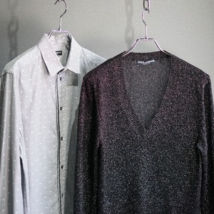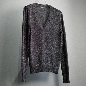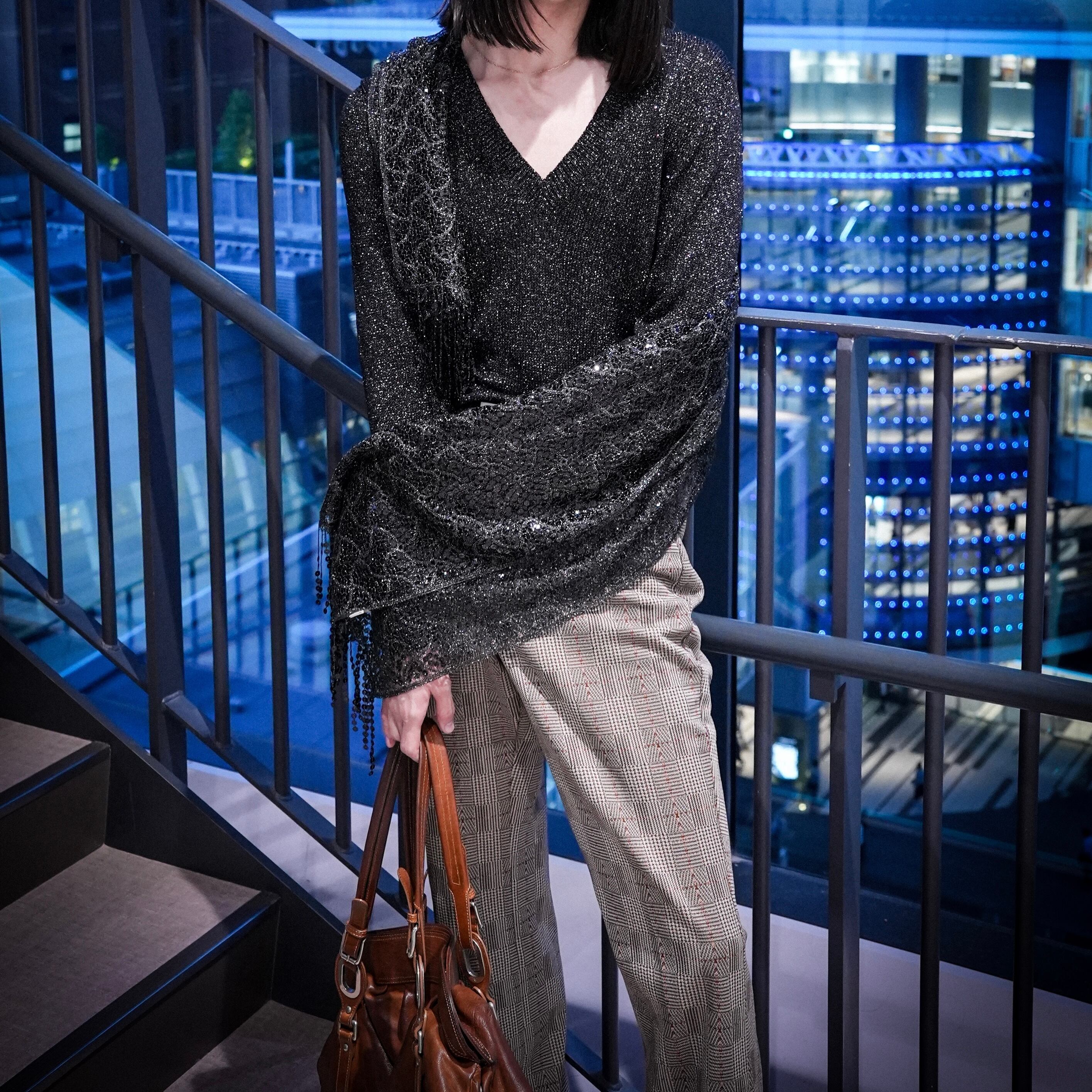 シンプルなVネックの形状で、クラシカルなシルエットを保ちながらも、ラメの輝きがモダンな印象を与えてくれます。